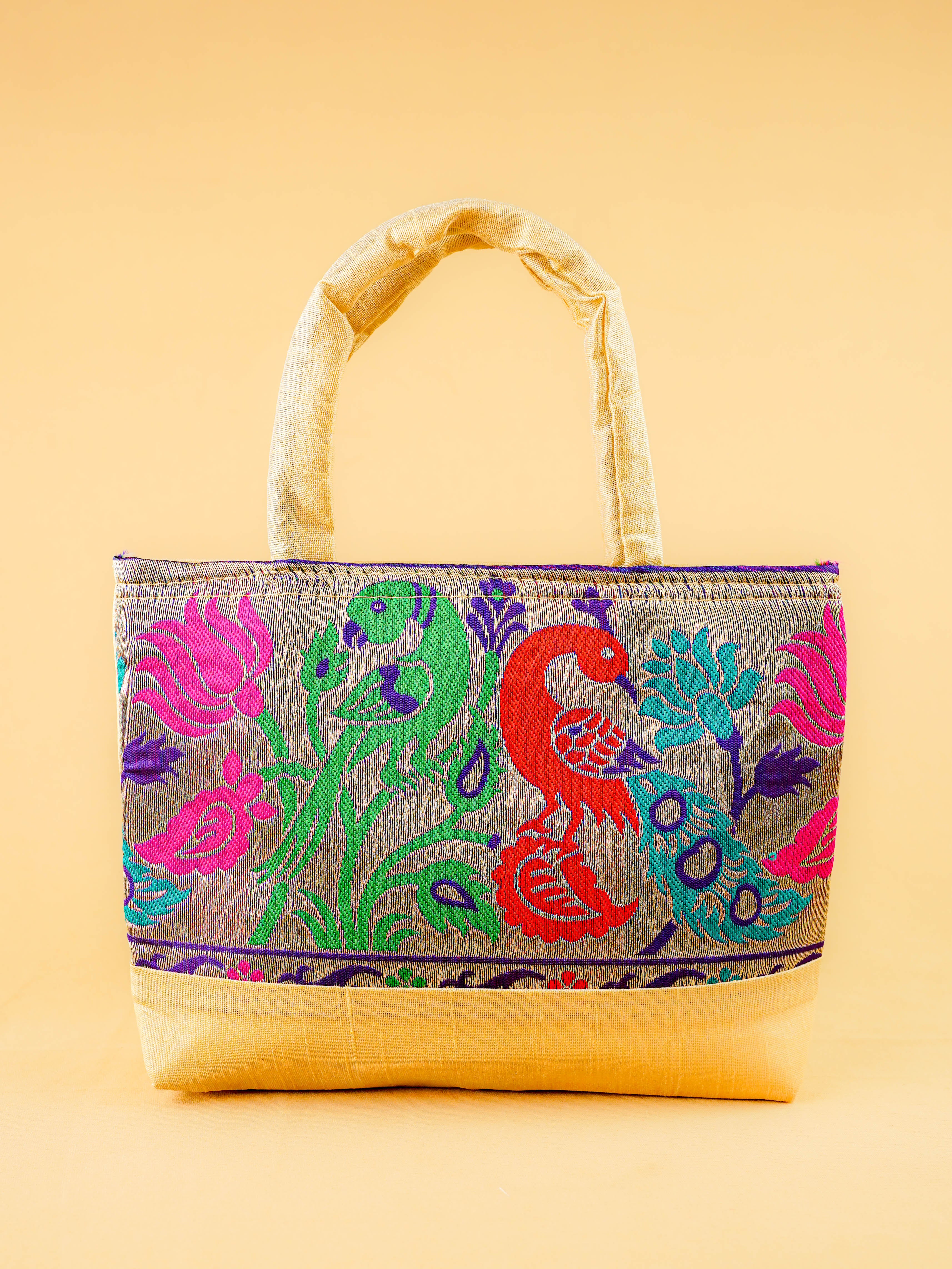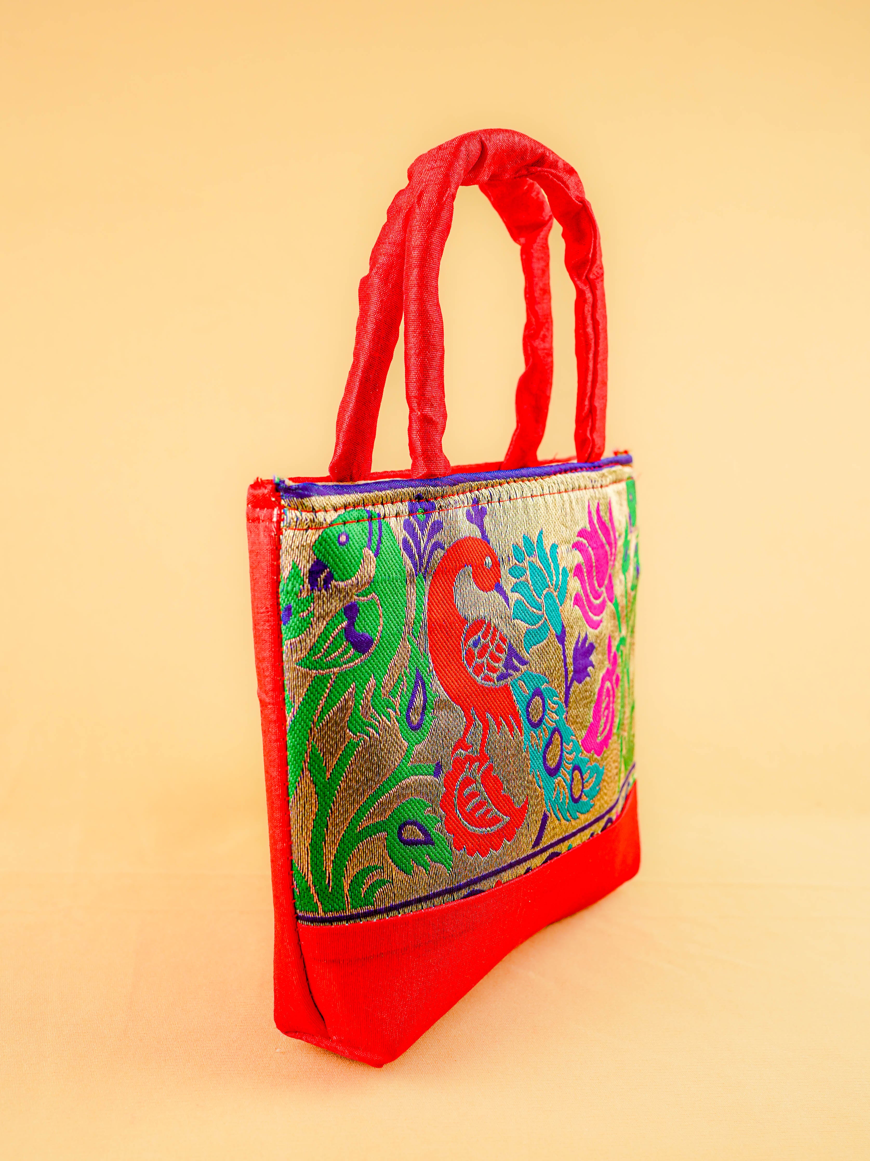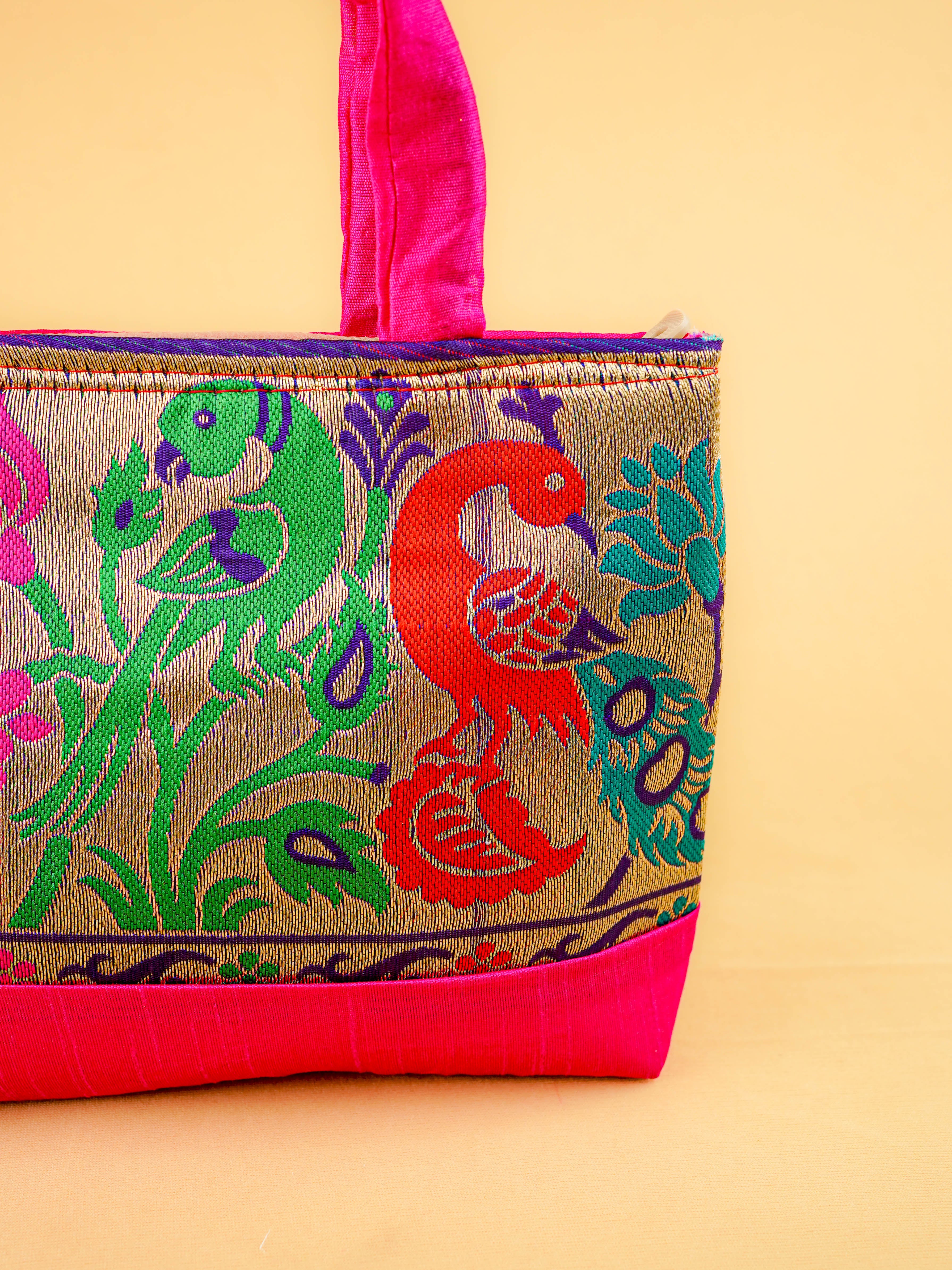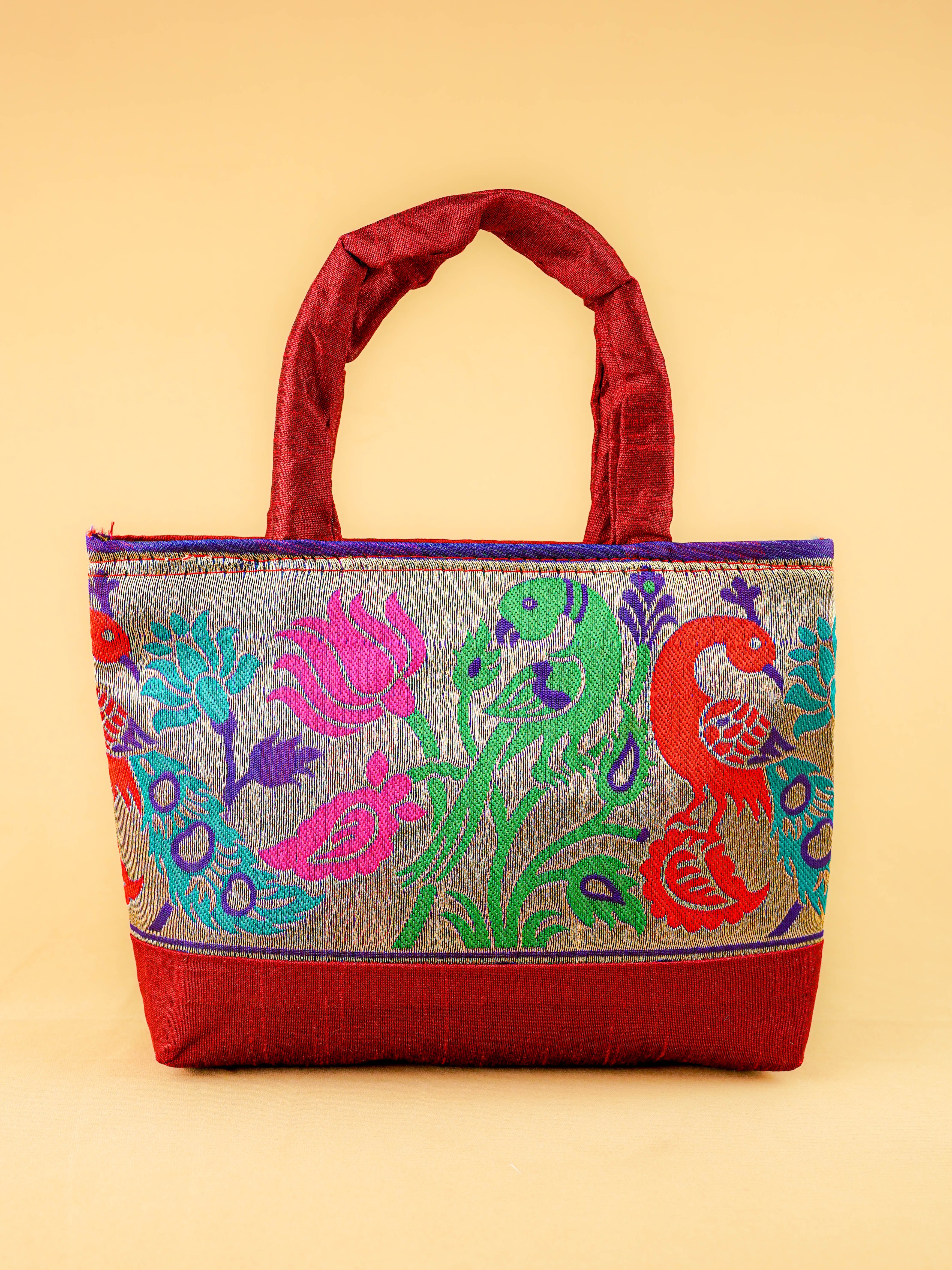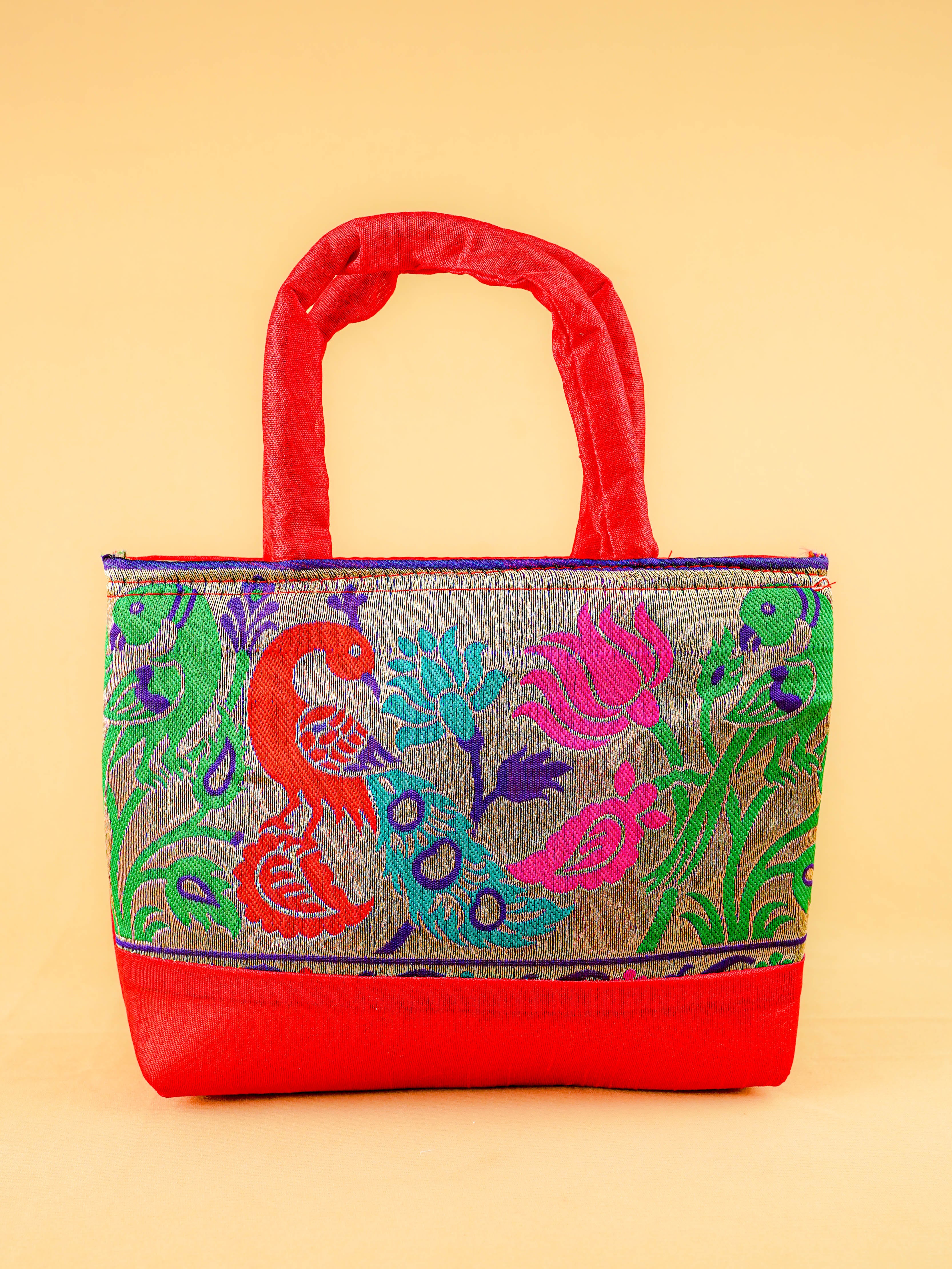 Hand bag raw silk with Peacock design - W3826
