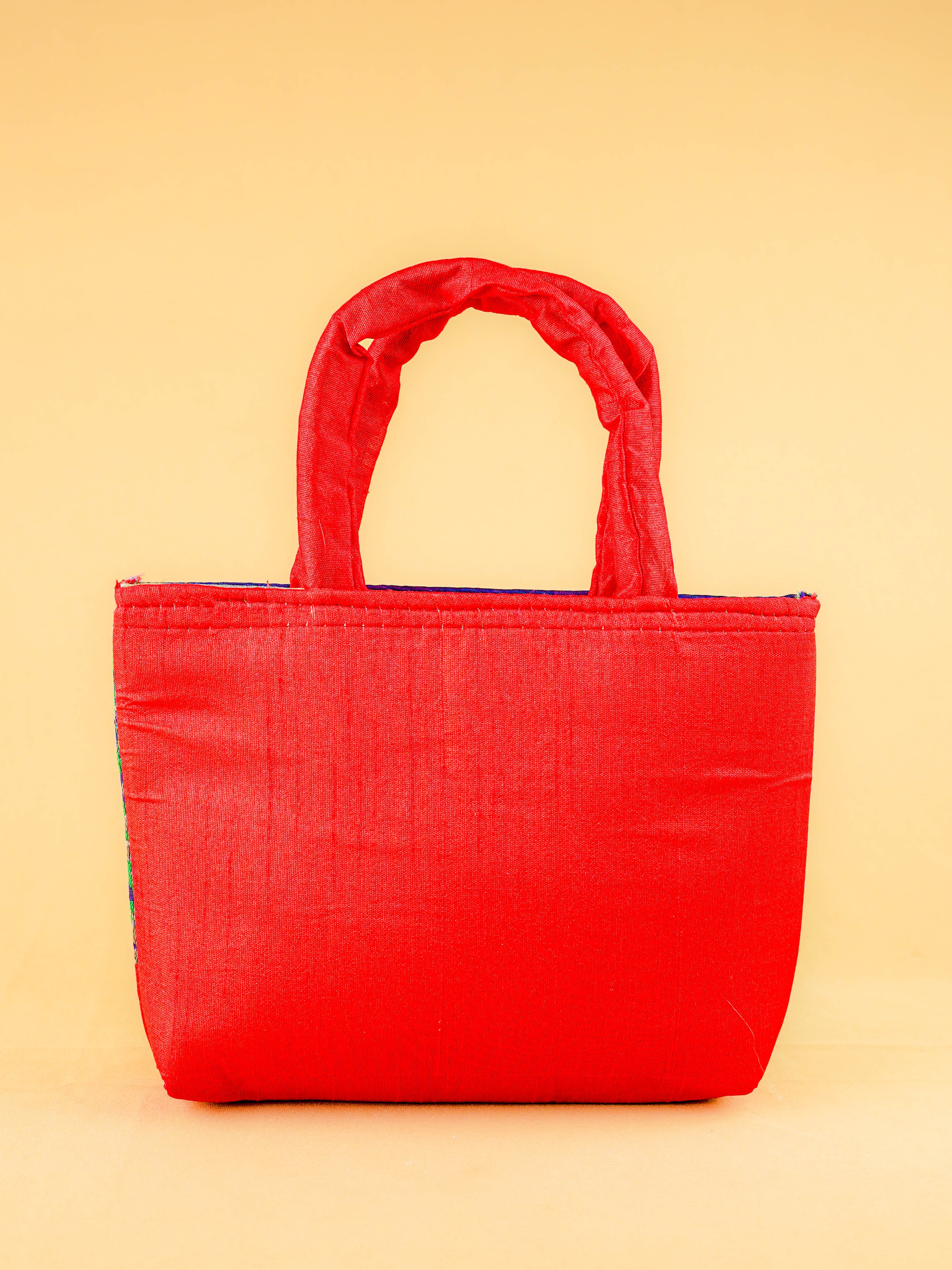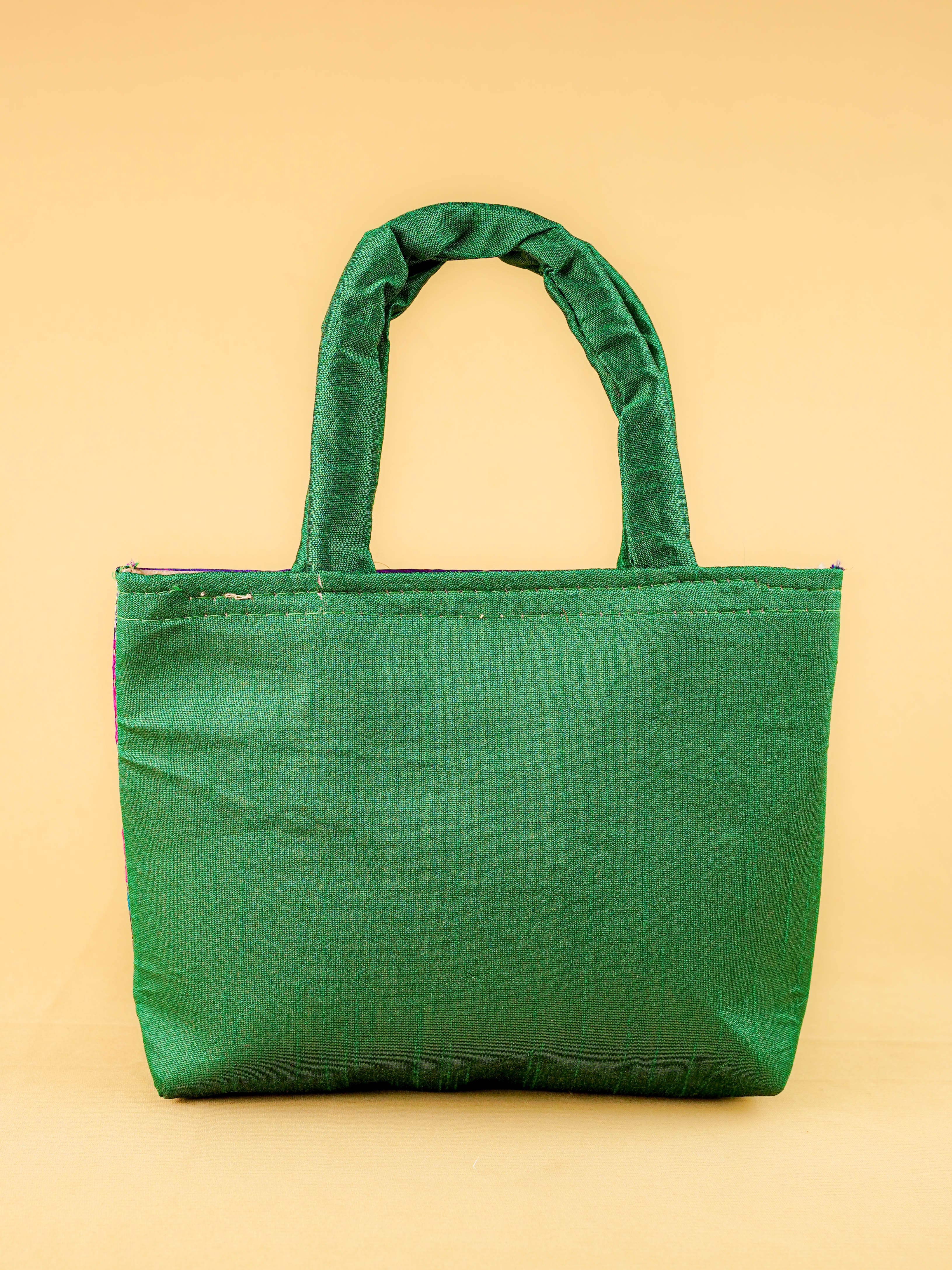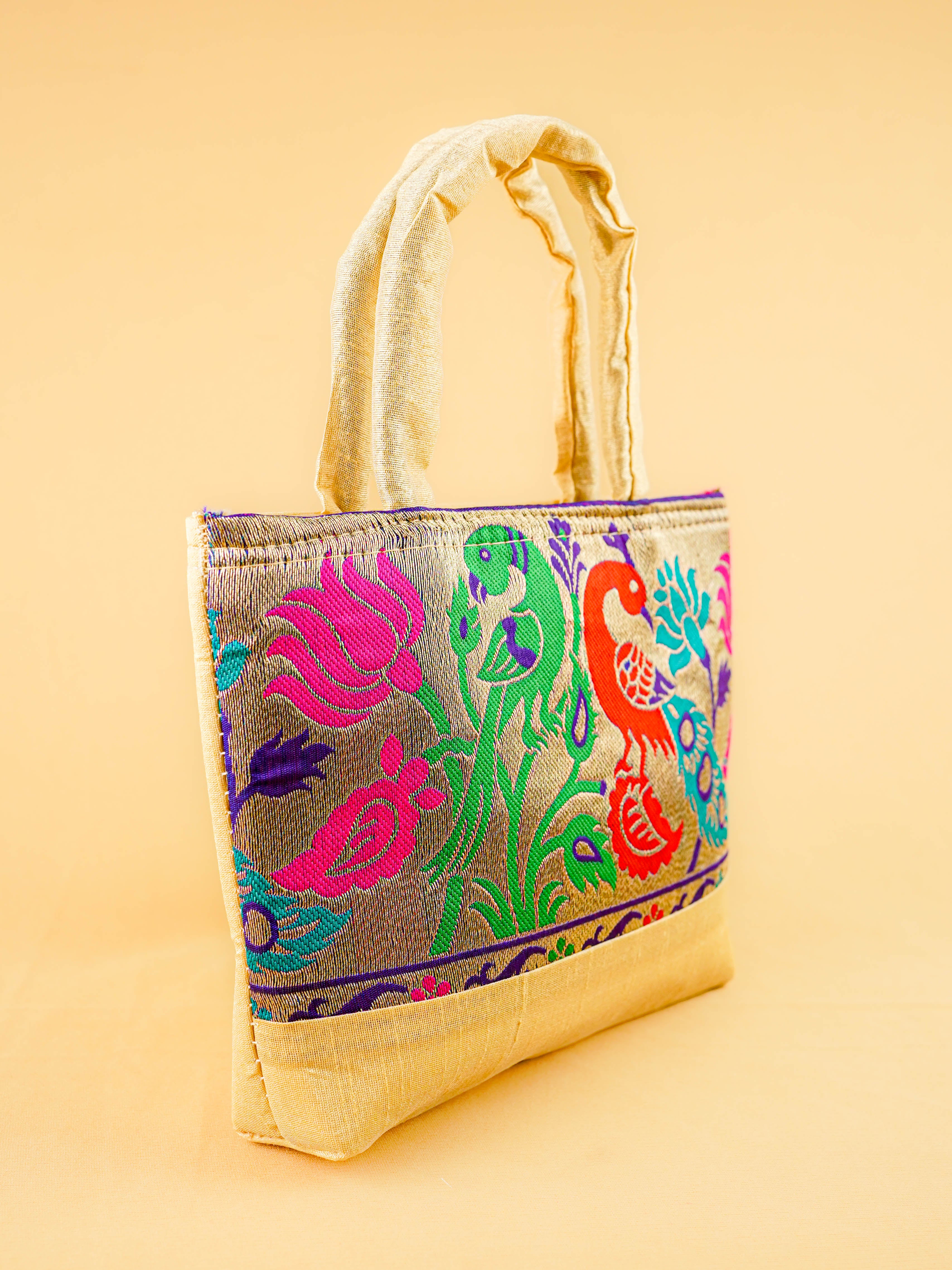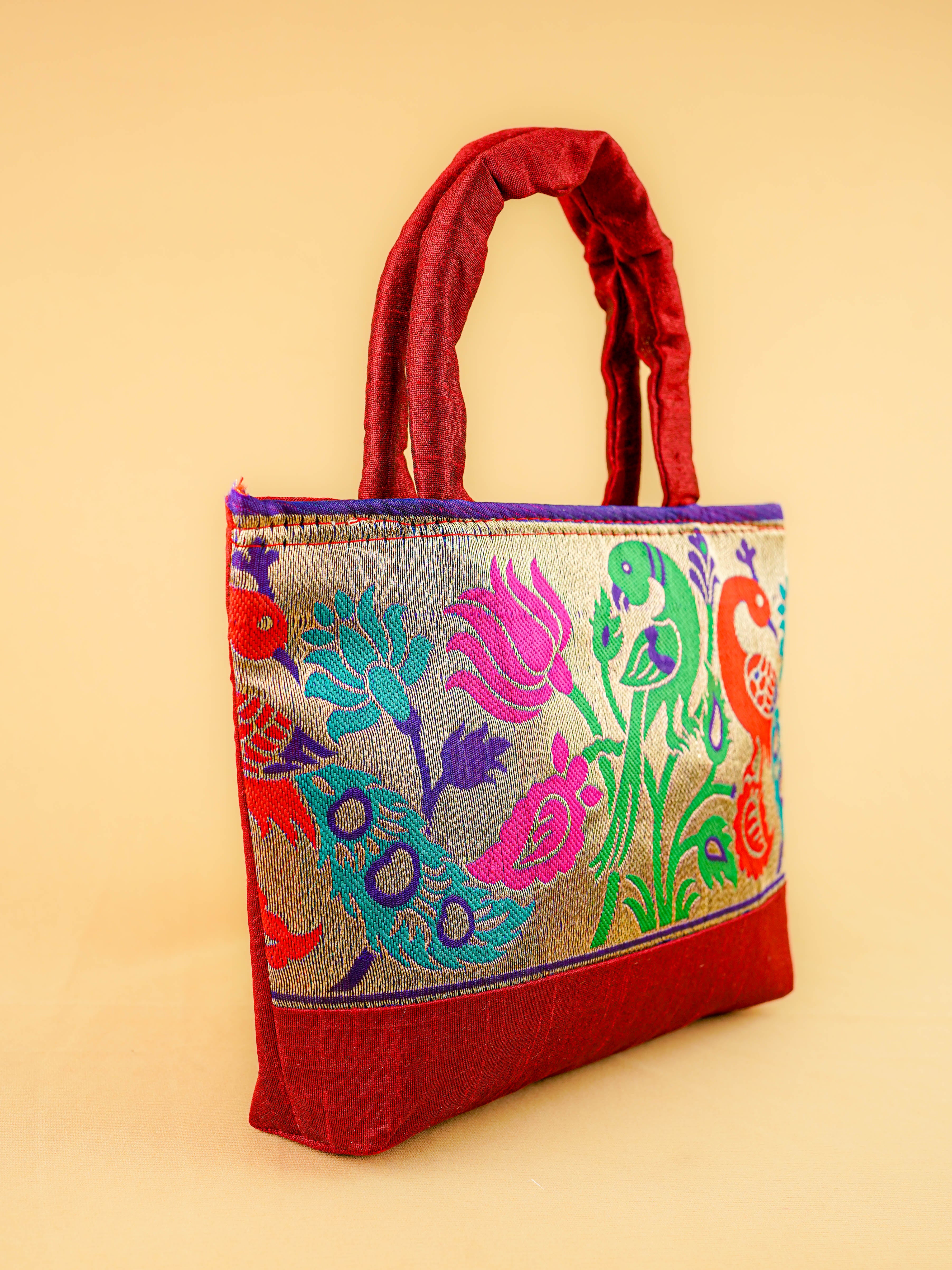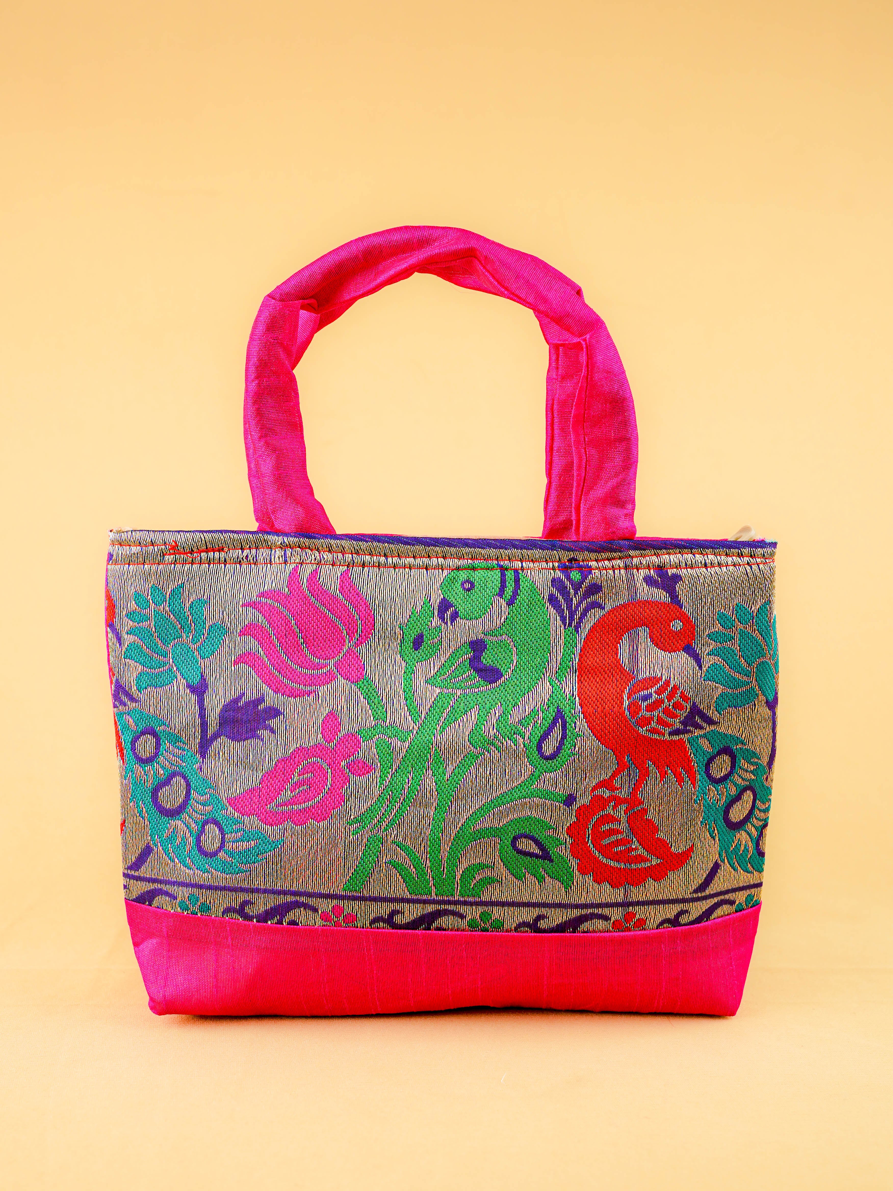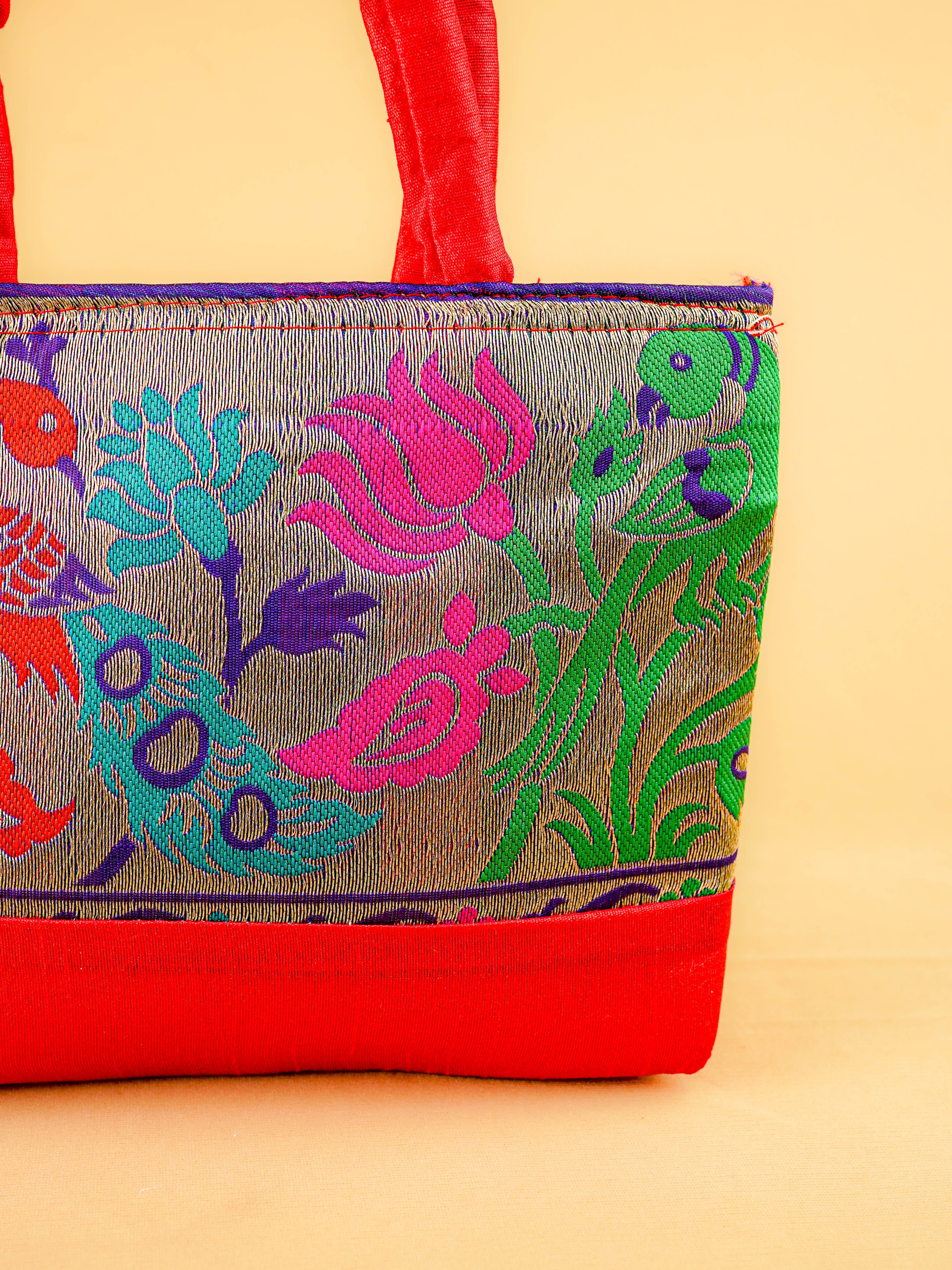 Hand bag raw silk with Peacock design - W3826