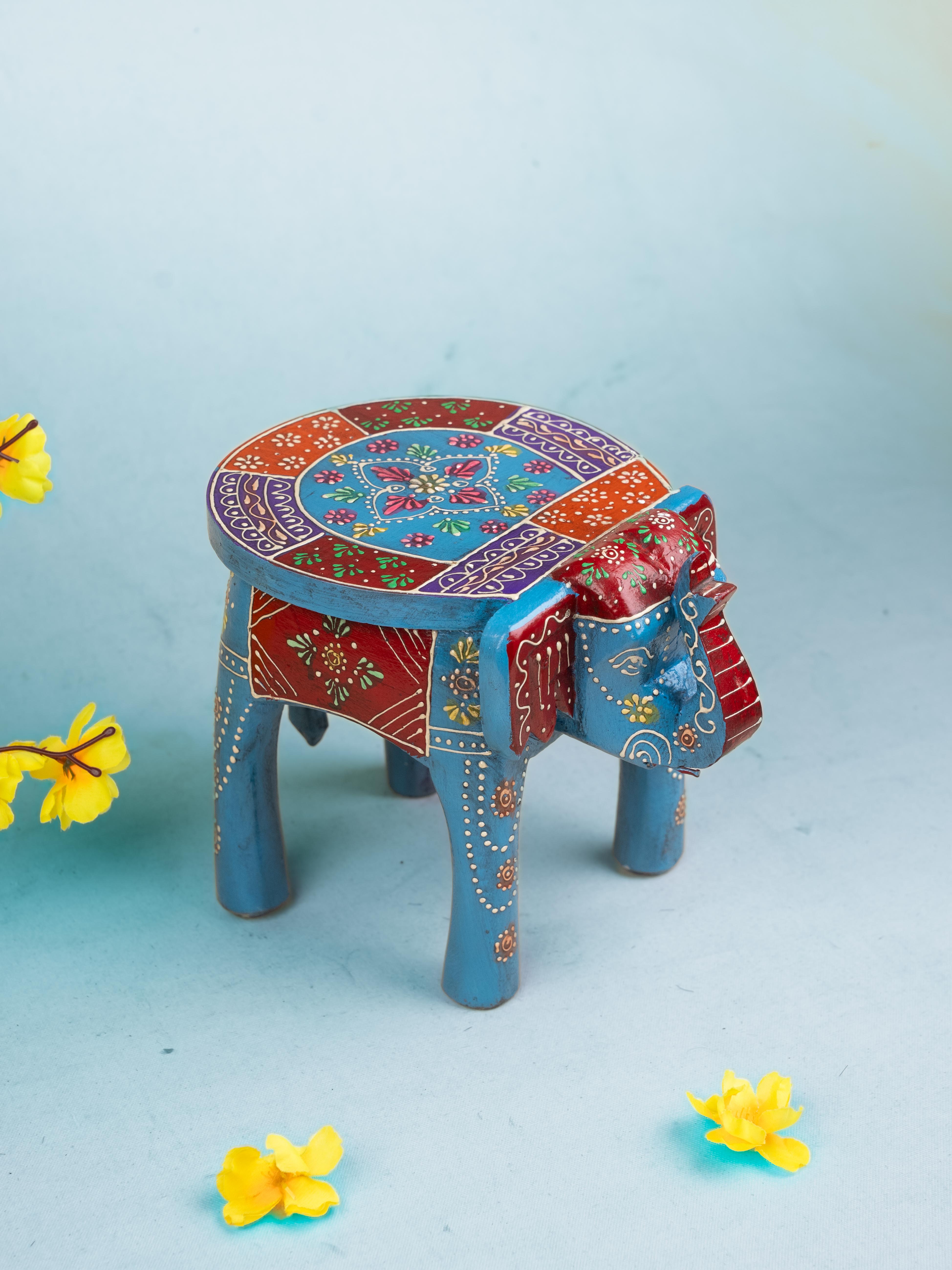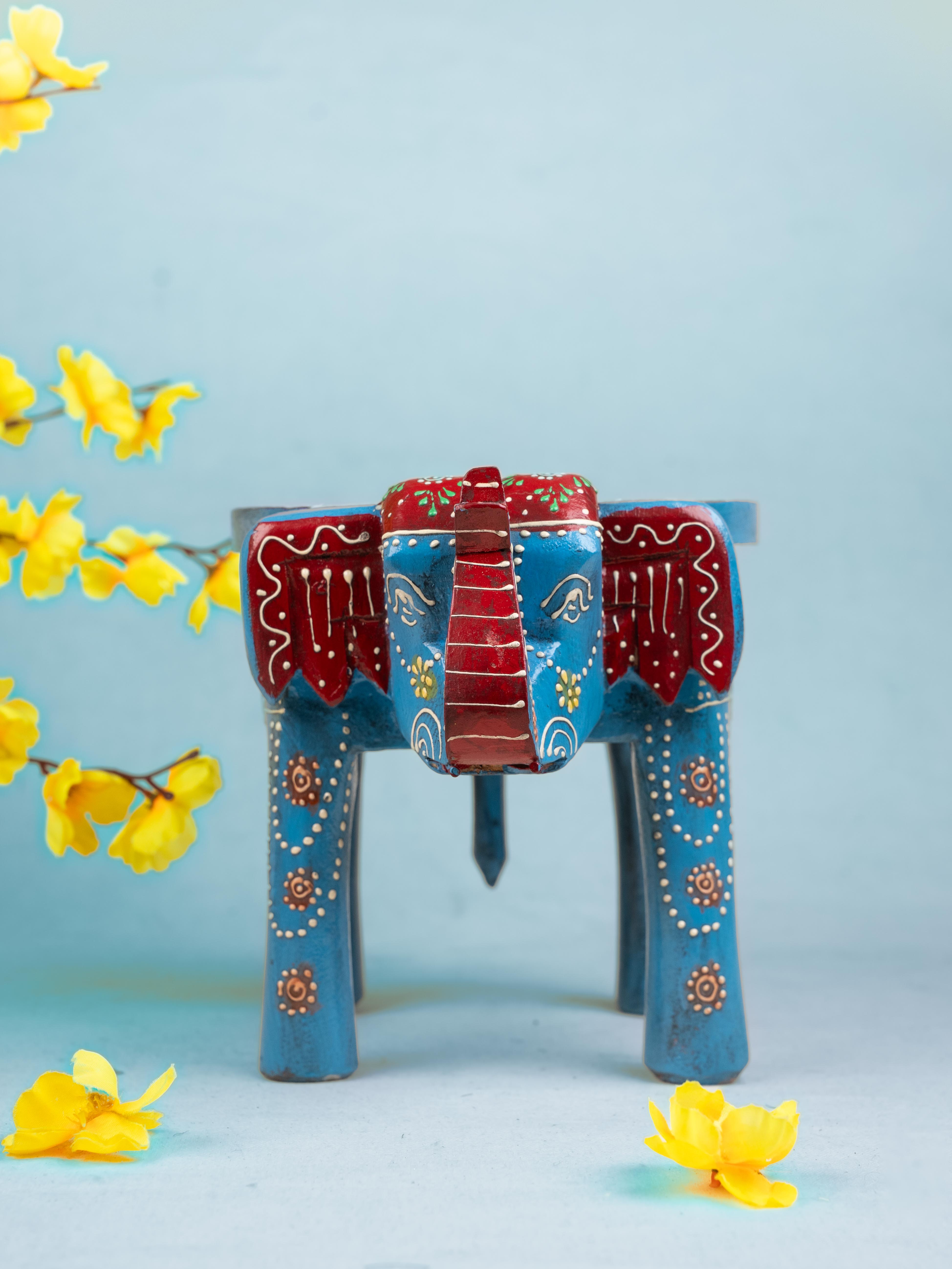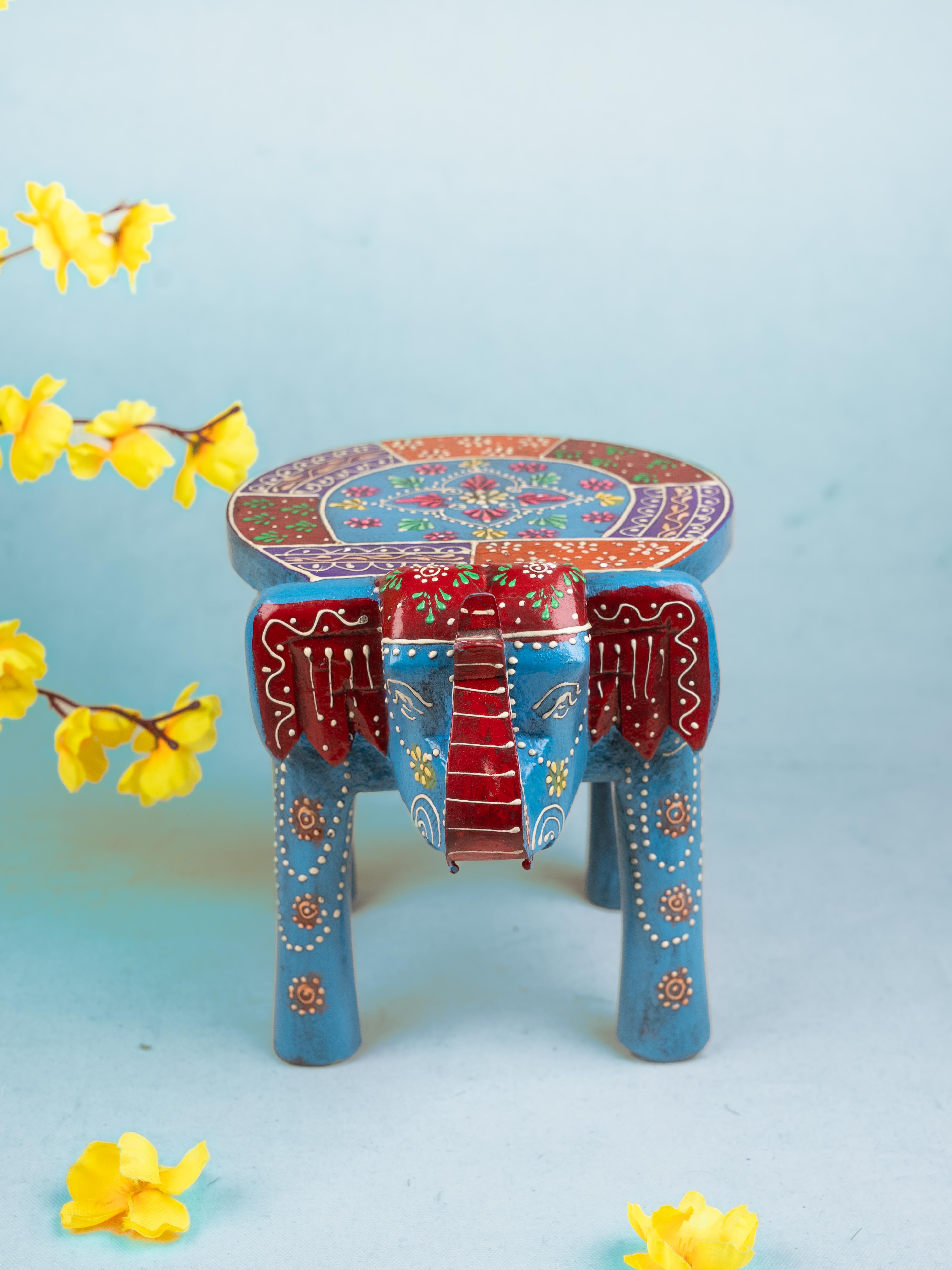 - Decorated with beautiful floral patterns and rangoli designs, this elephant stool comes with four sturdy legs and a raised trunk.