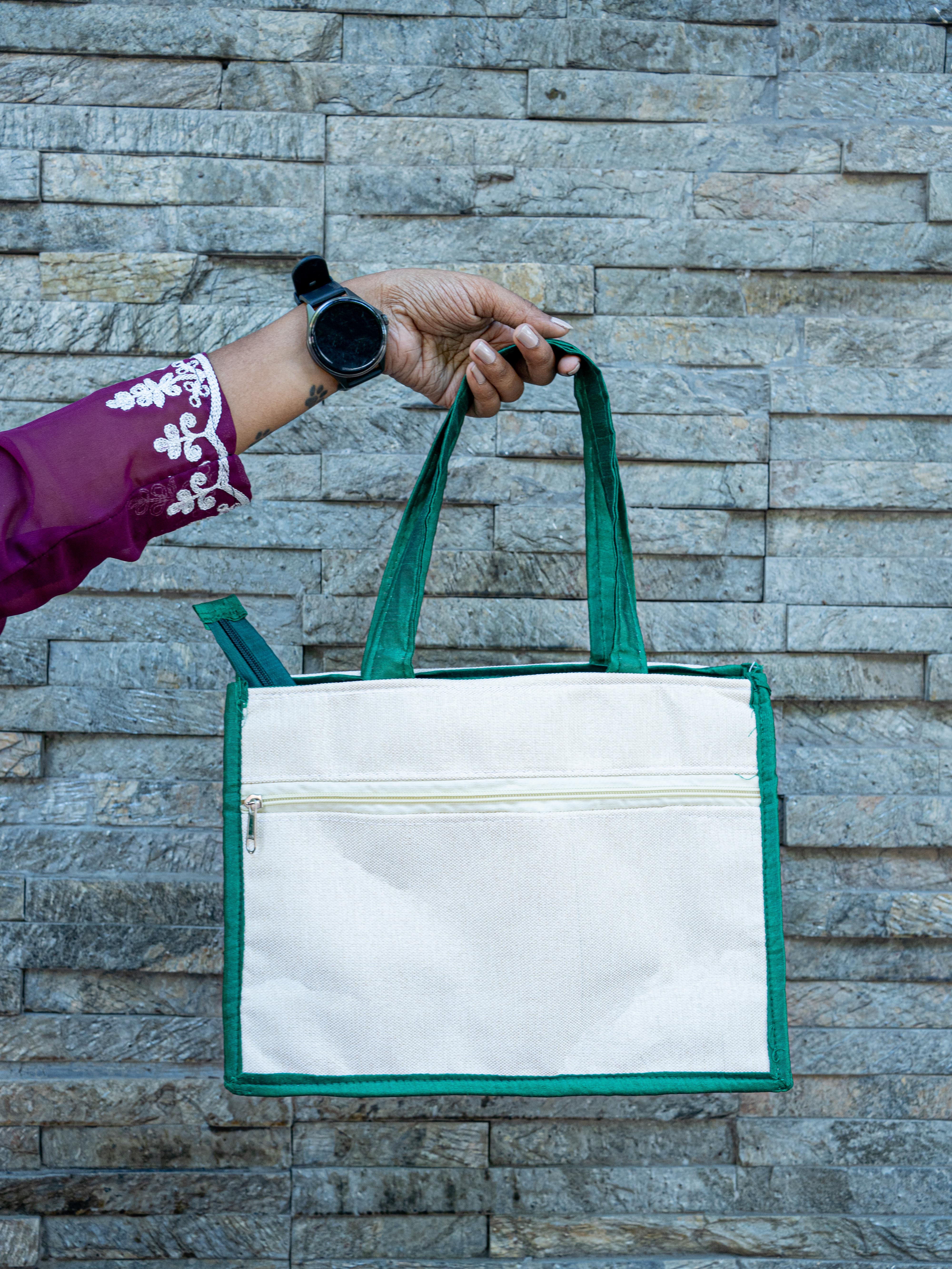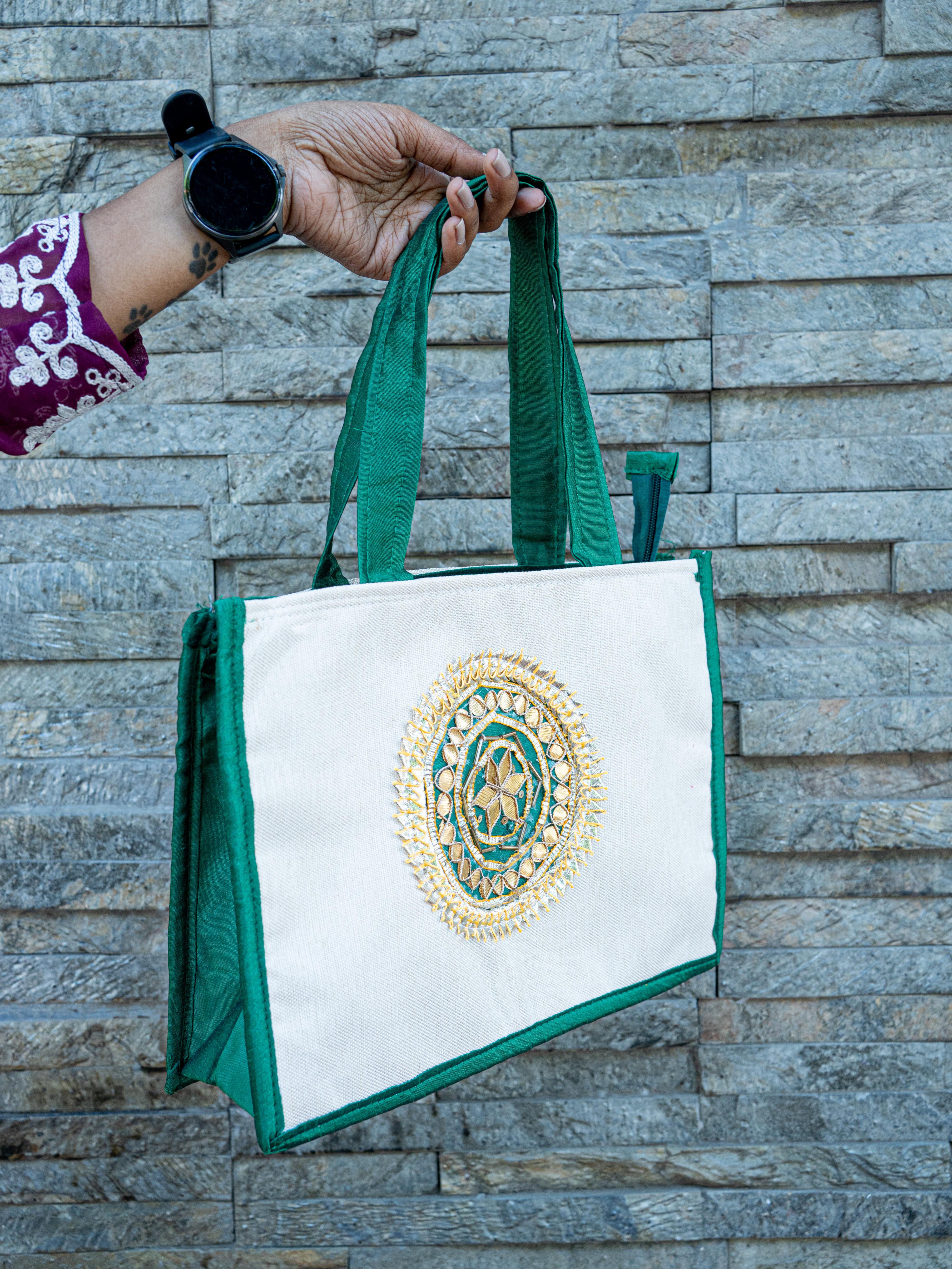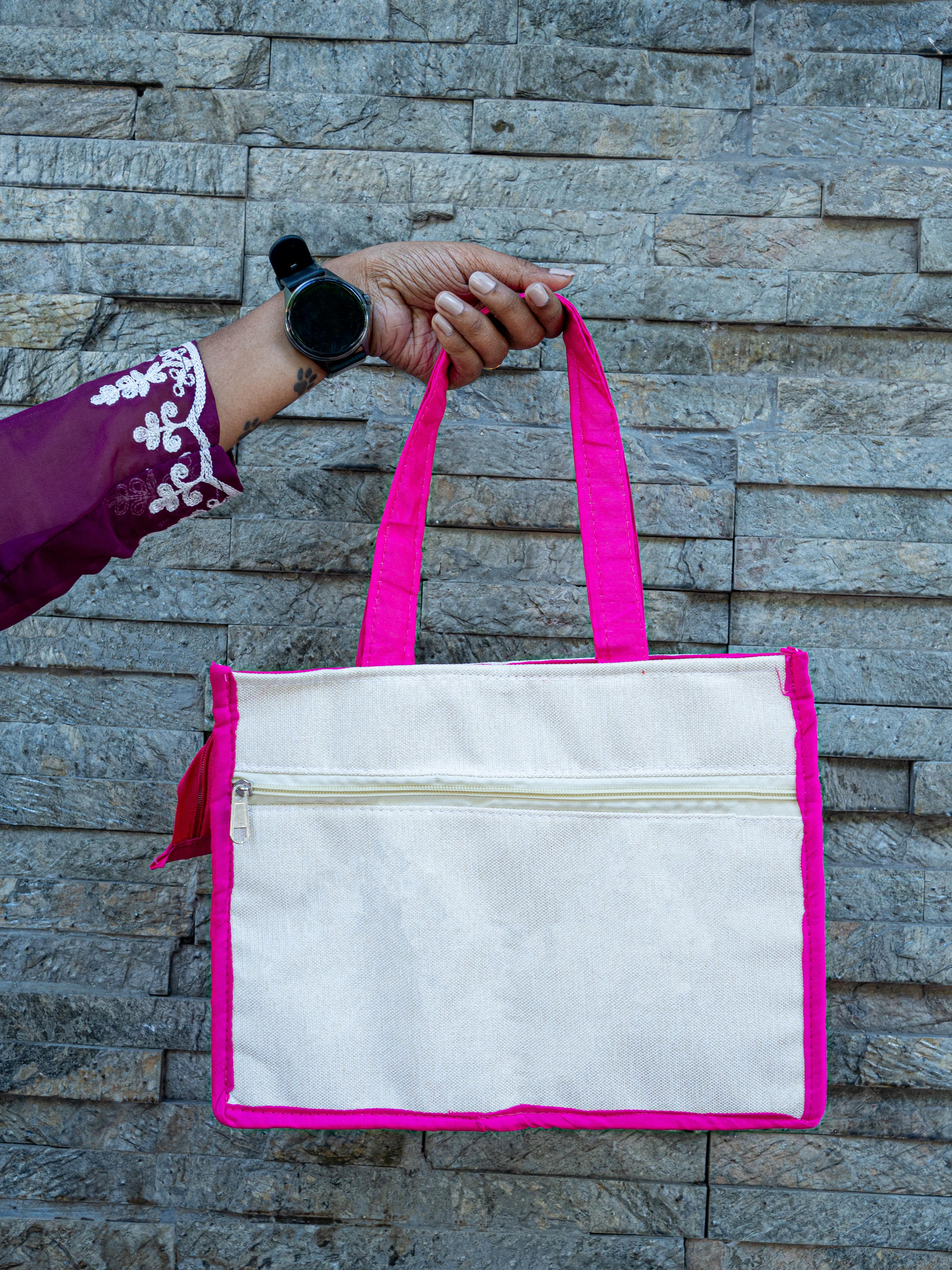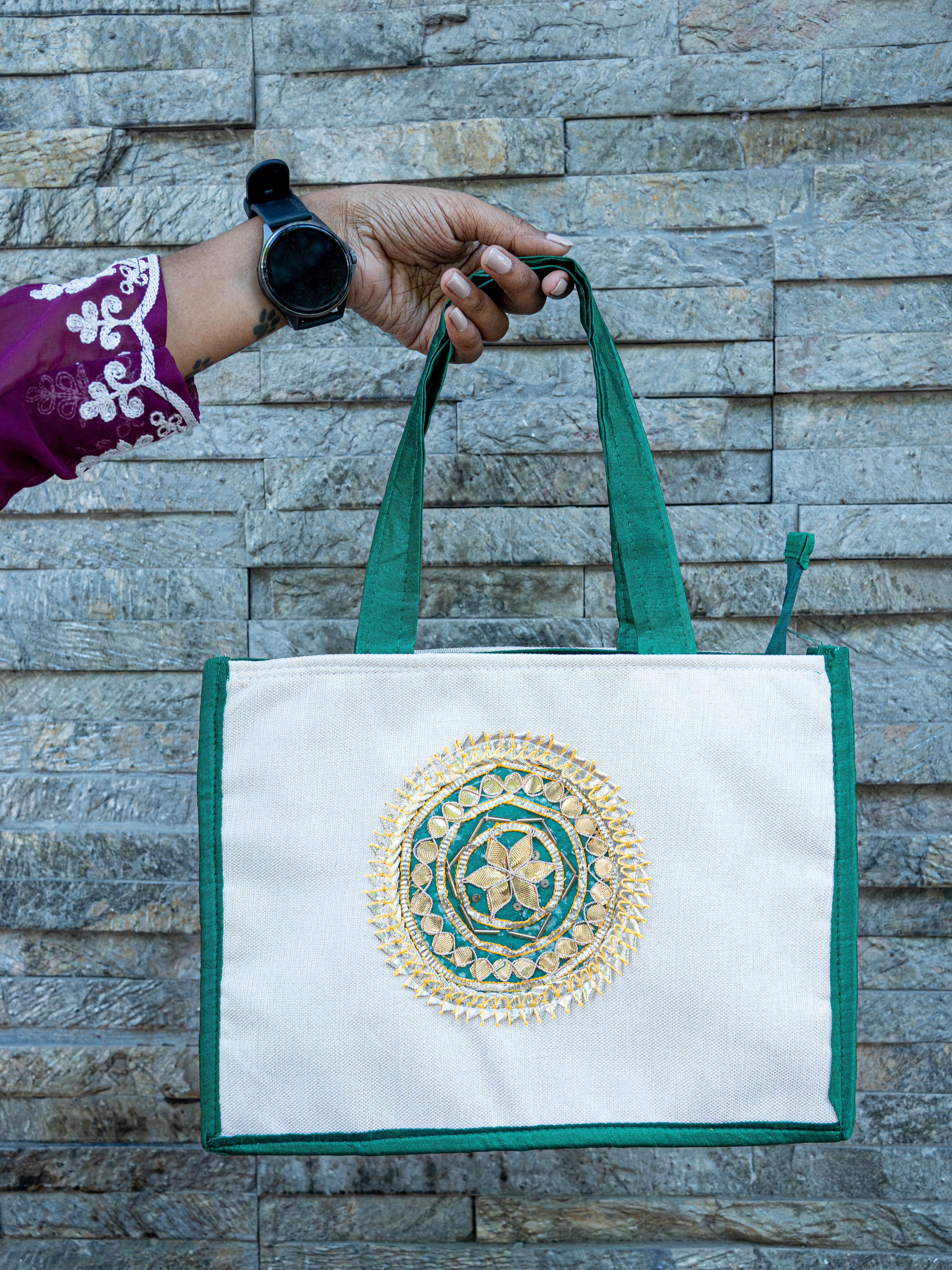 - Beige-Colored Jute Fabric with Raw Silk Handle and Border Gives the Bags a Sturdy and Eco-Friendly Appeal.