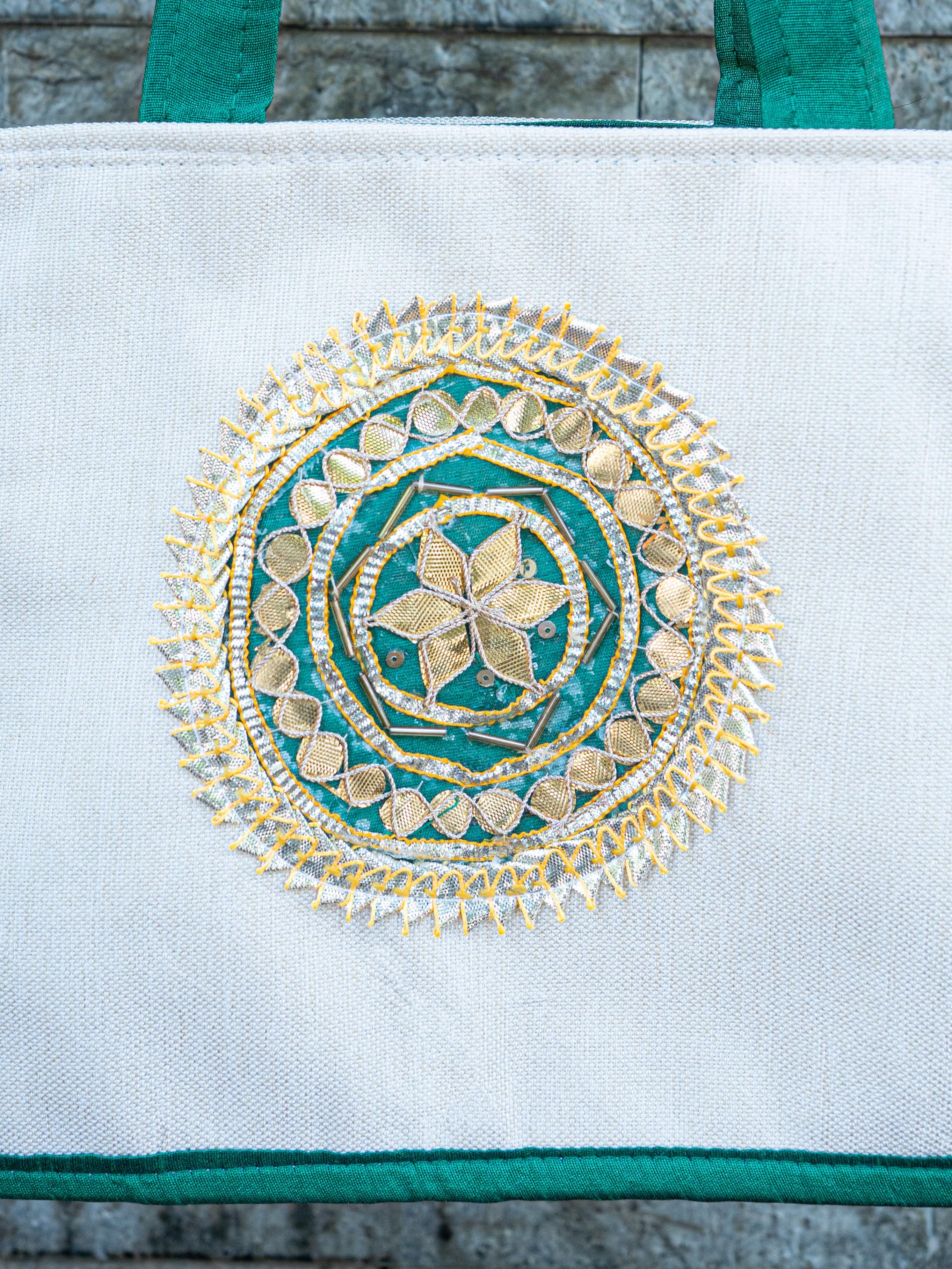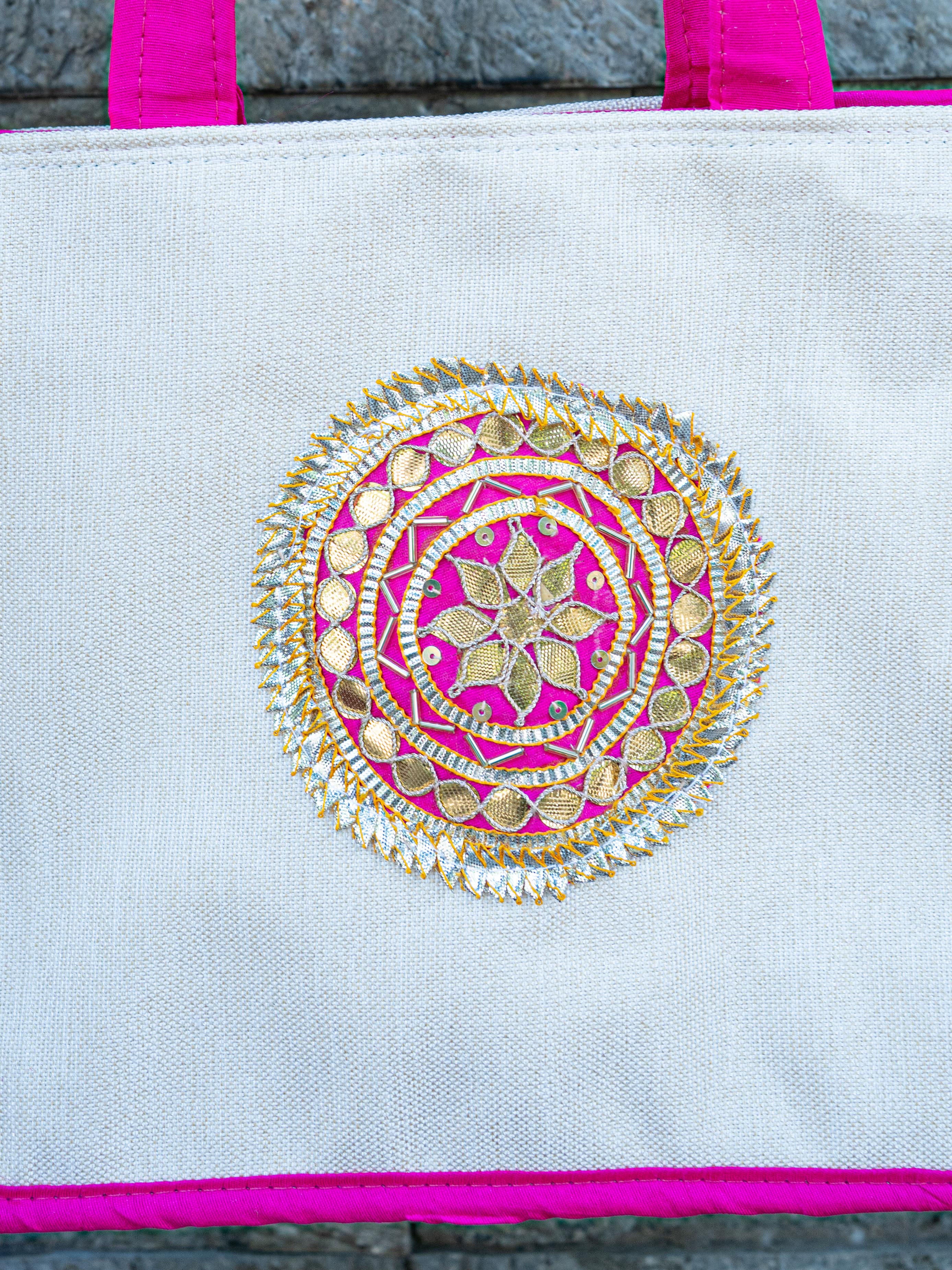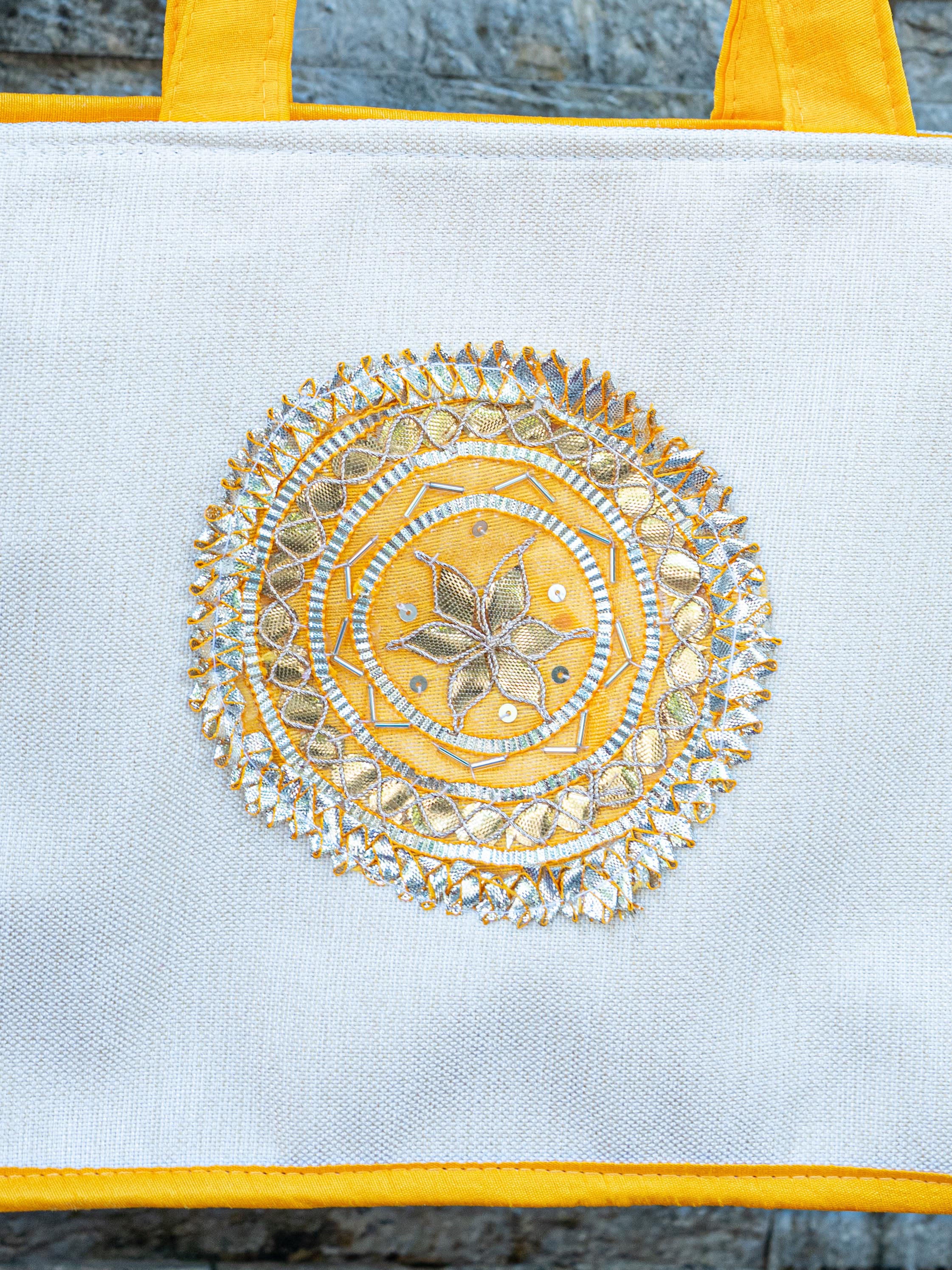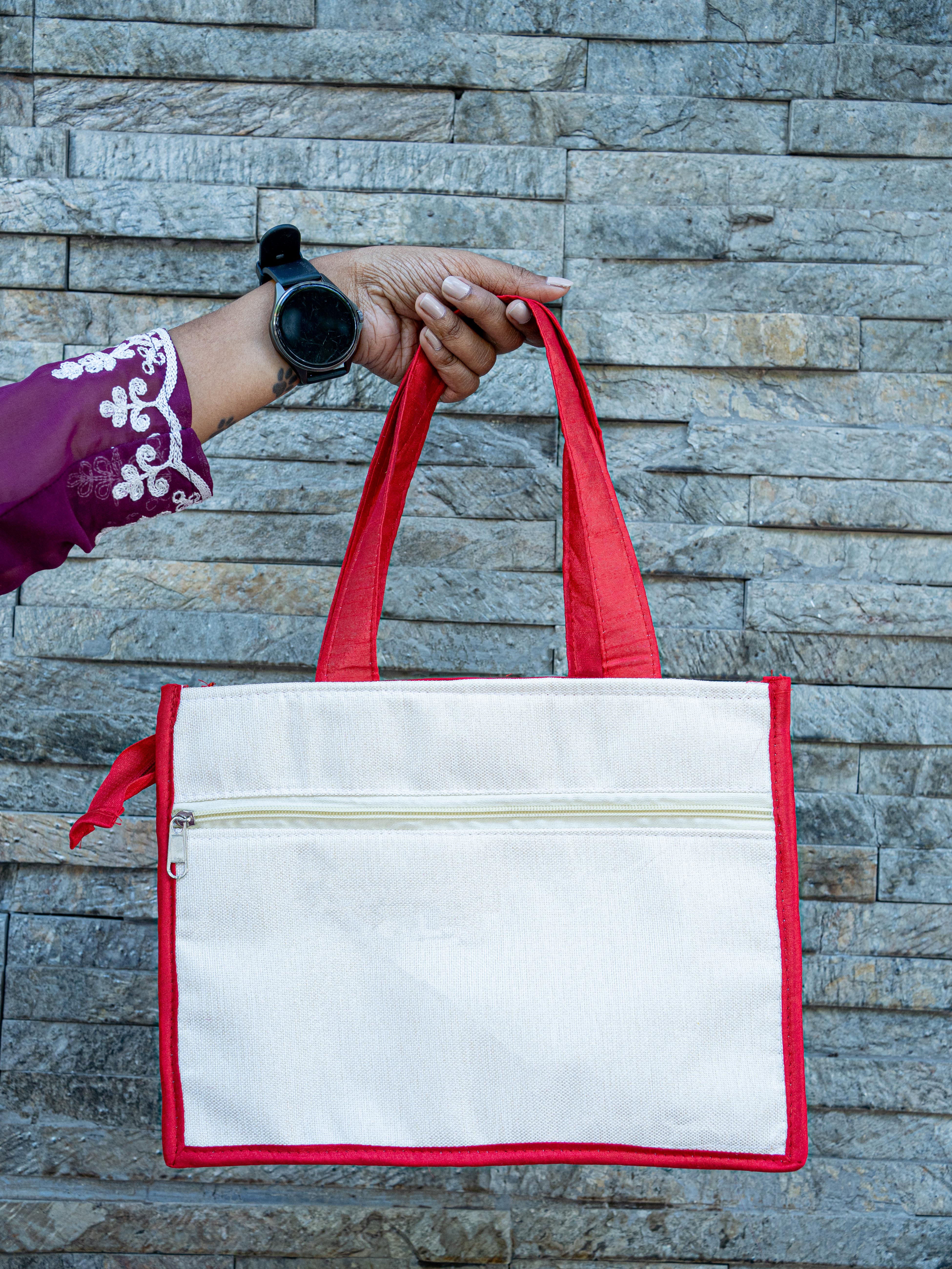 - Beige-Colored Jute Fabric with Raw Silk Handle and Border Gives the Bags a Sturdy and Eco-Friendly Appeal.