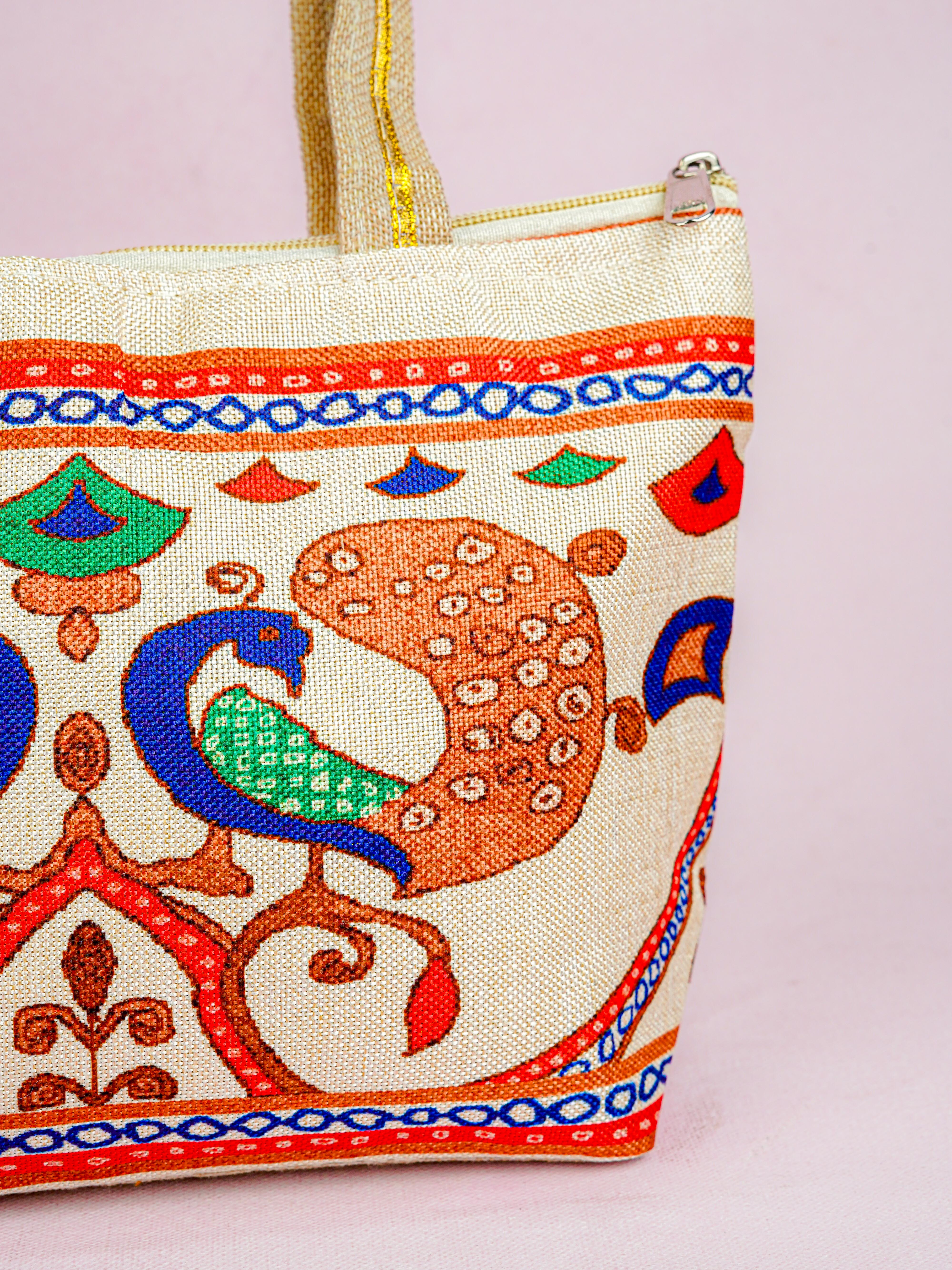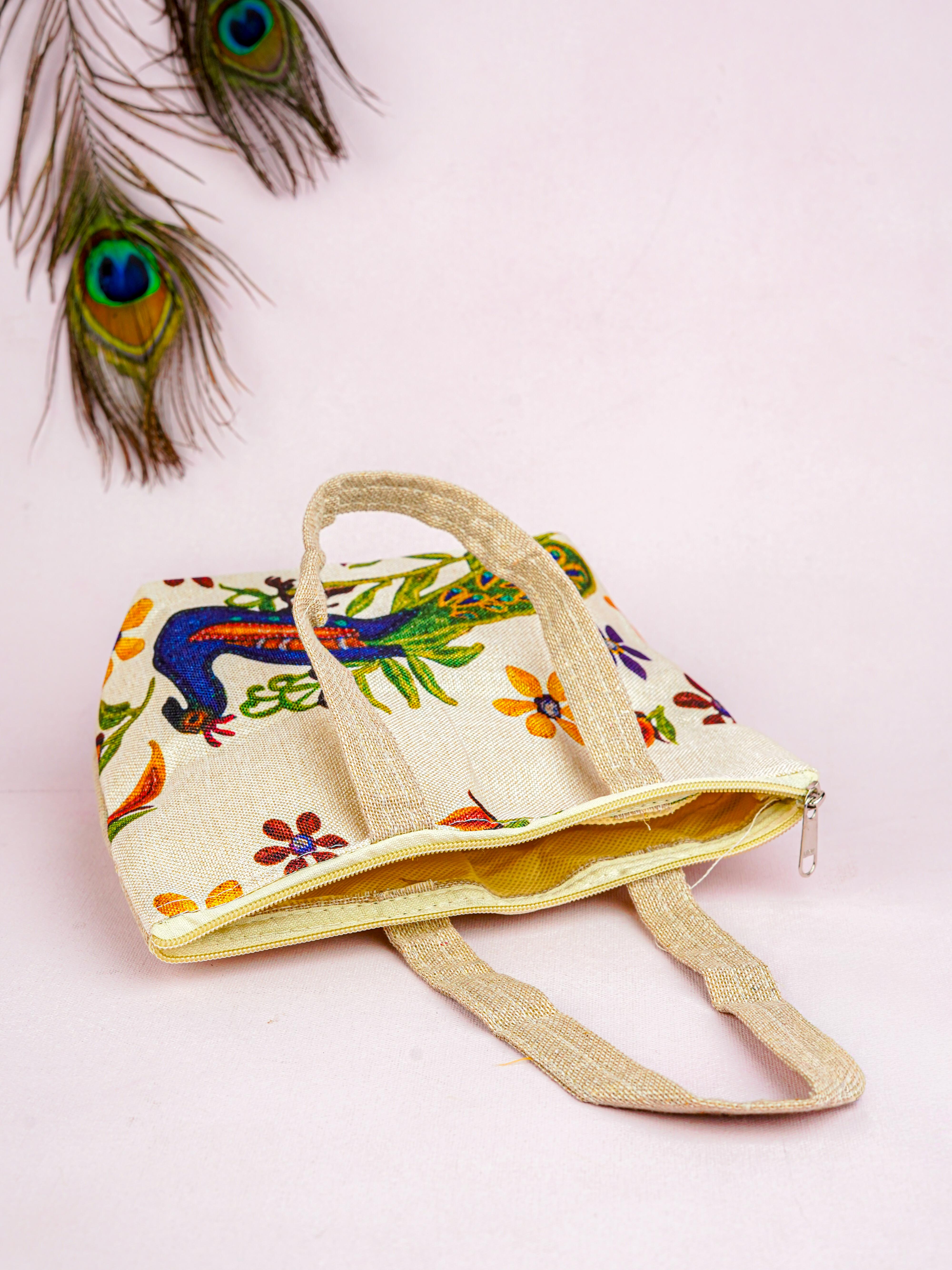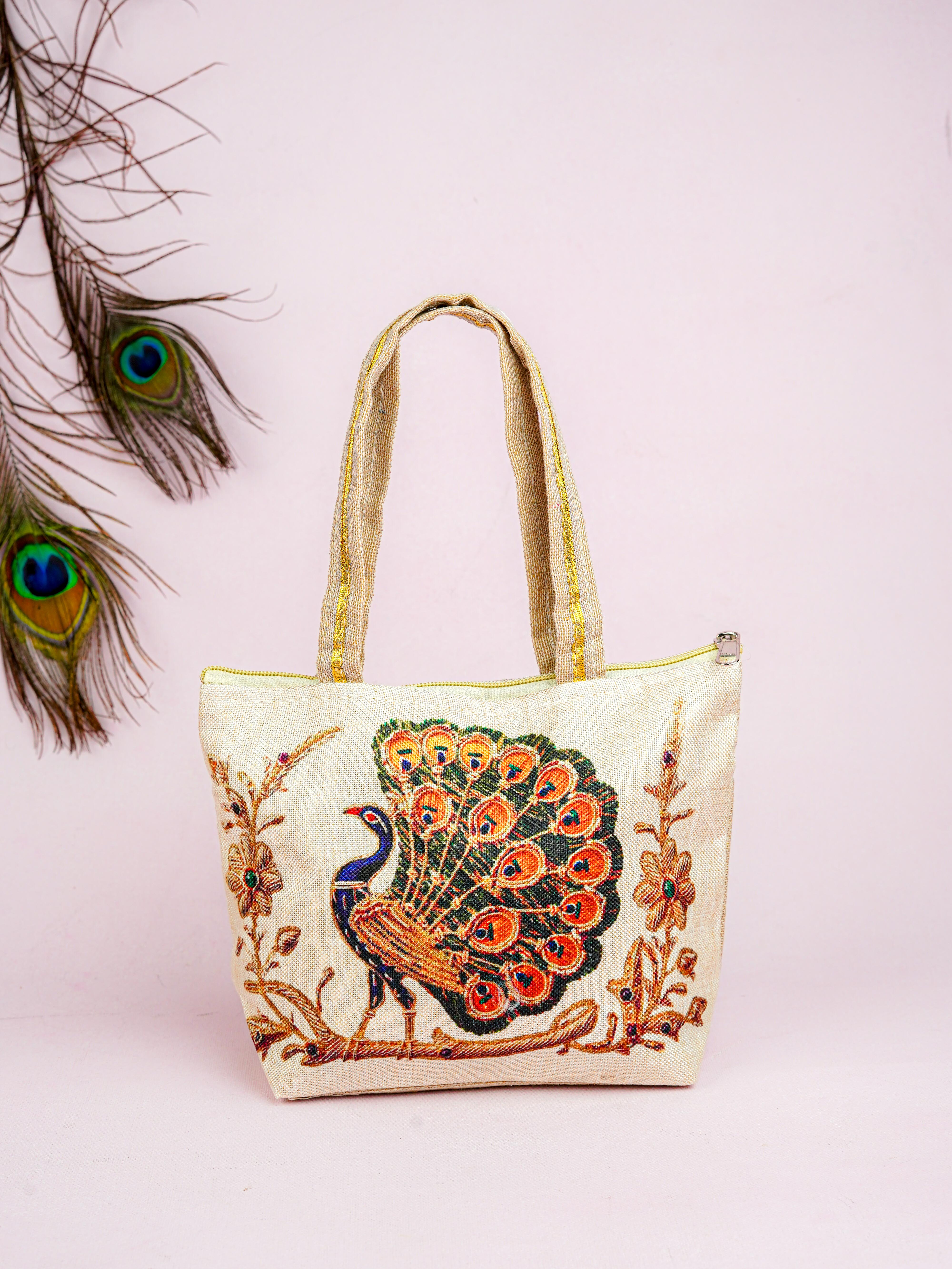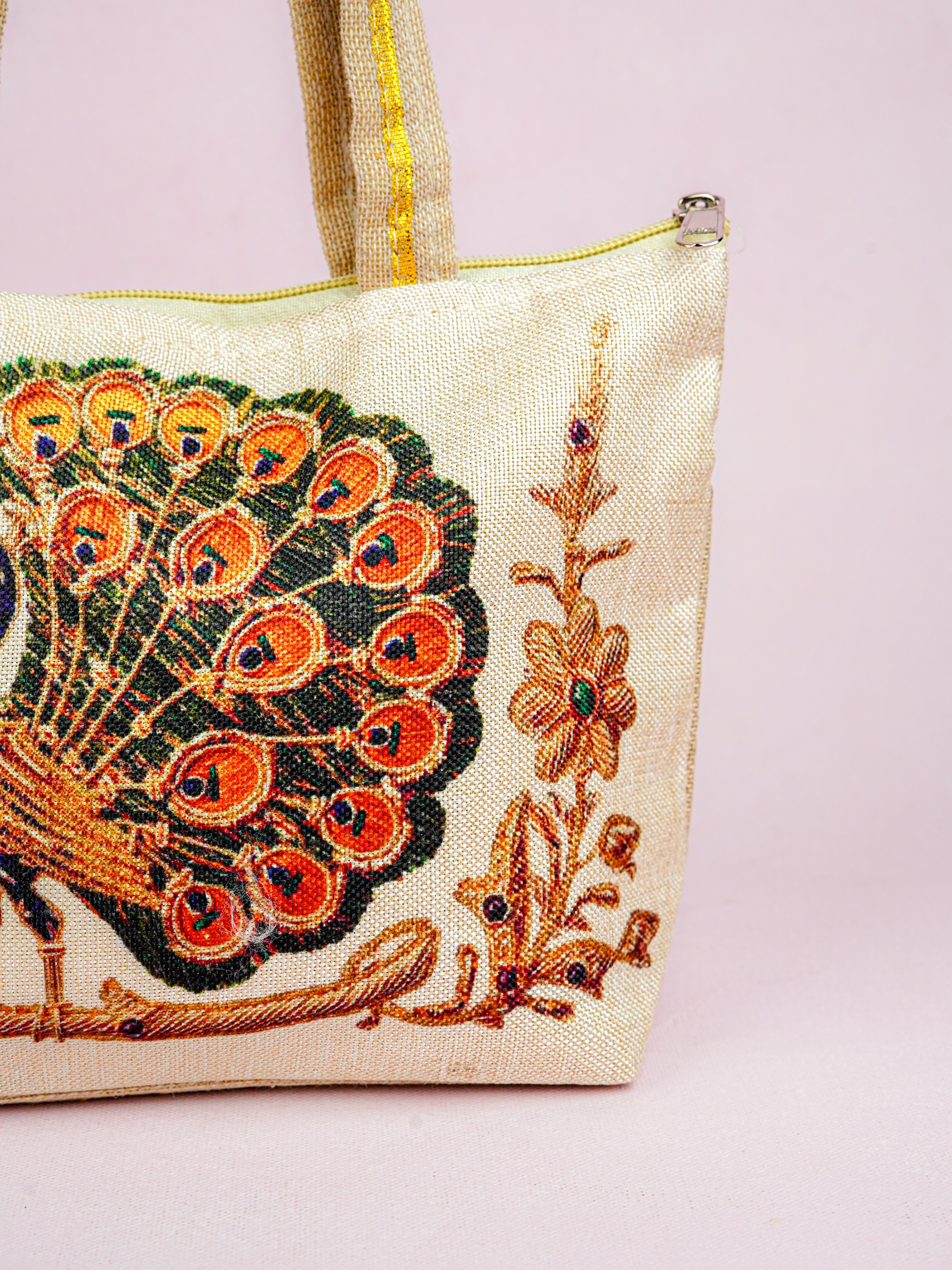 Make a Stylish and Sustainable Statement with Our Hand Bag featuring a Stunning Peacock Design.