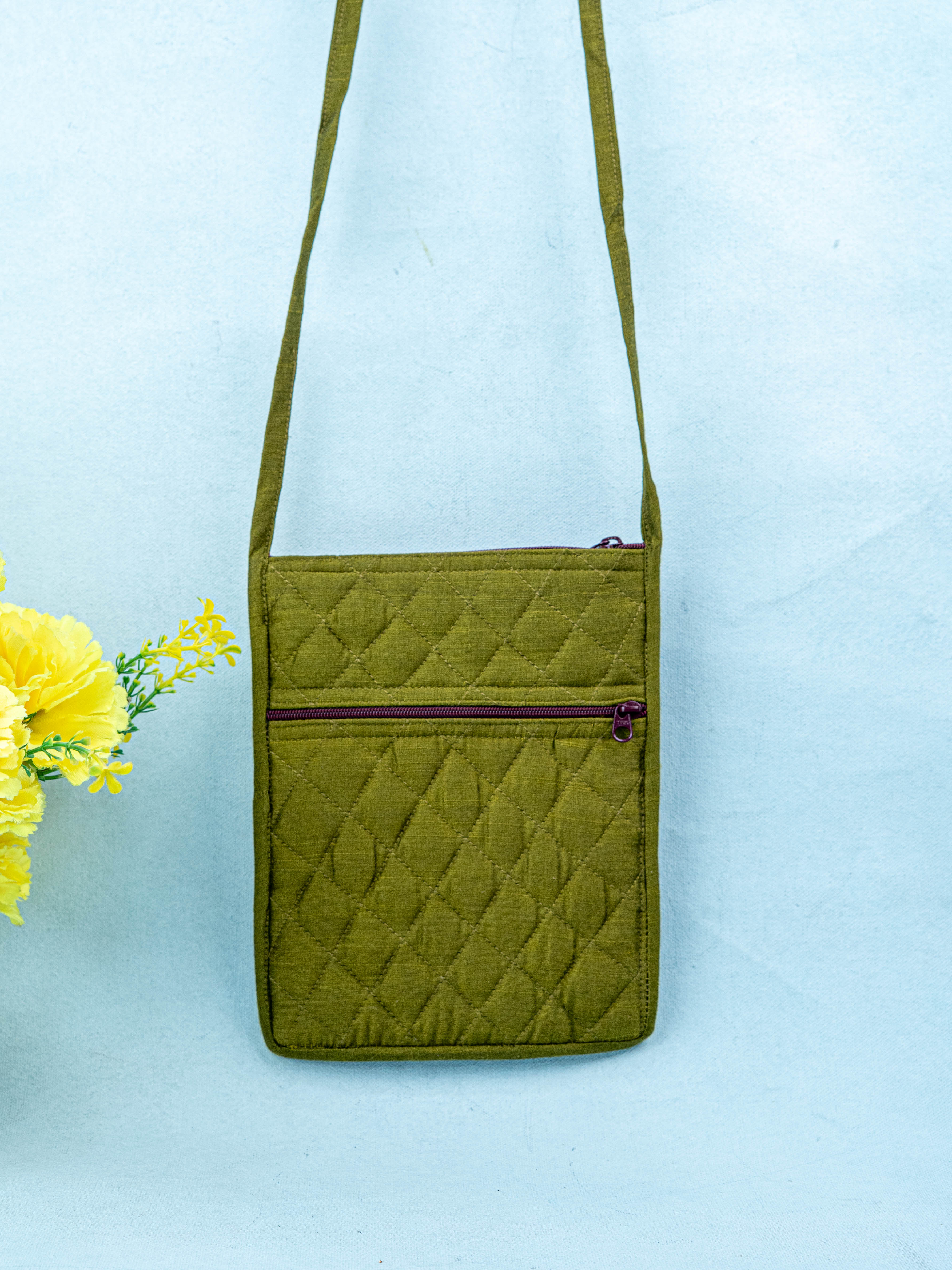 - Olive-Green Fabric Borders and Strap, Adding Contrast and Structure.