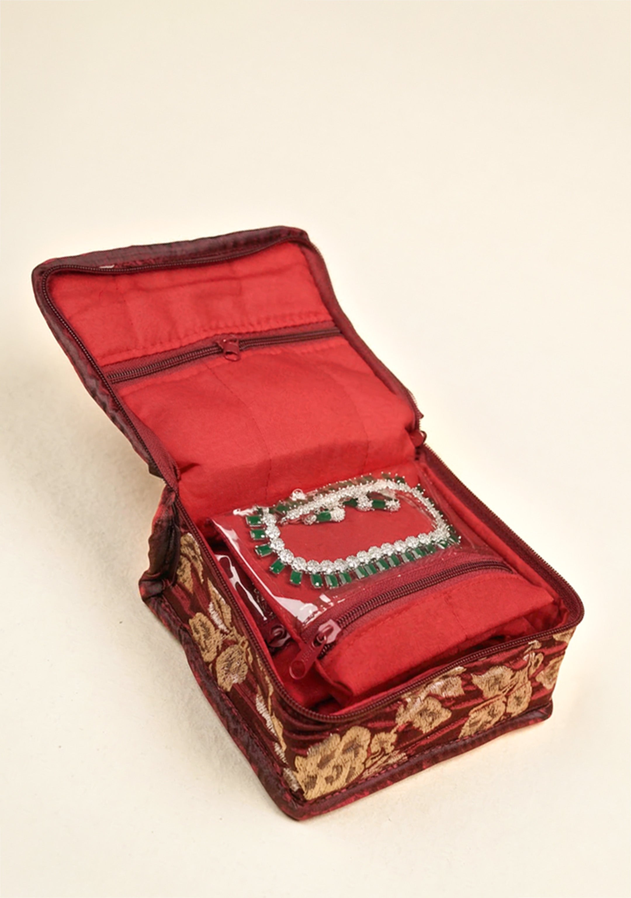 - The Jewel Pouch features a luxurious printed golden floral design, adding a touch of elegance and sophistication.