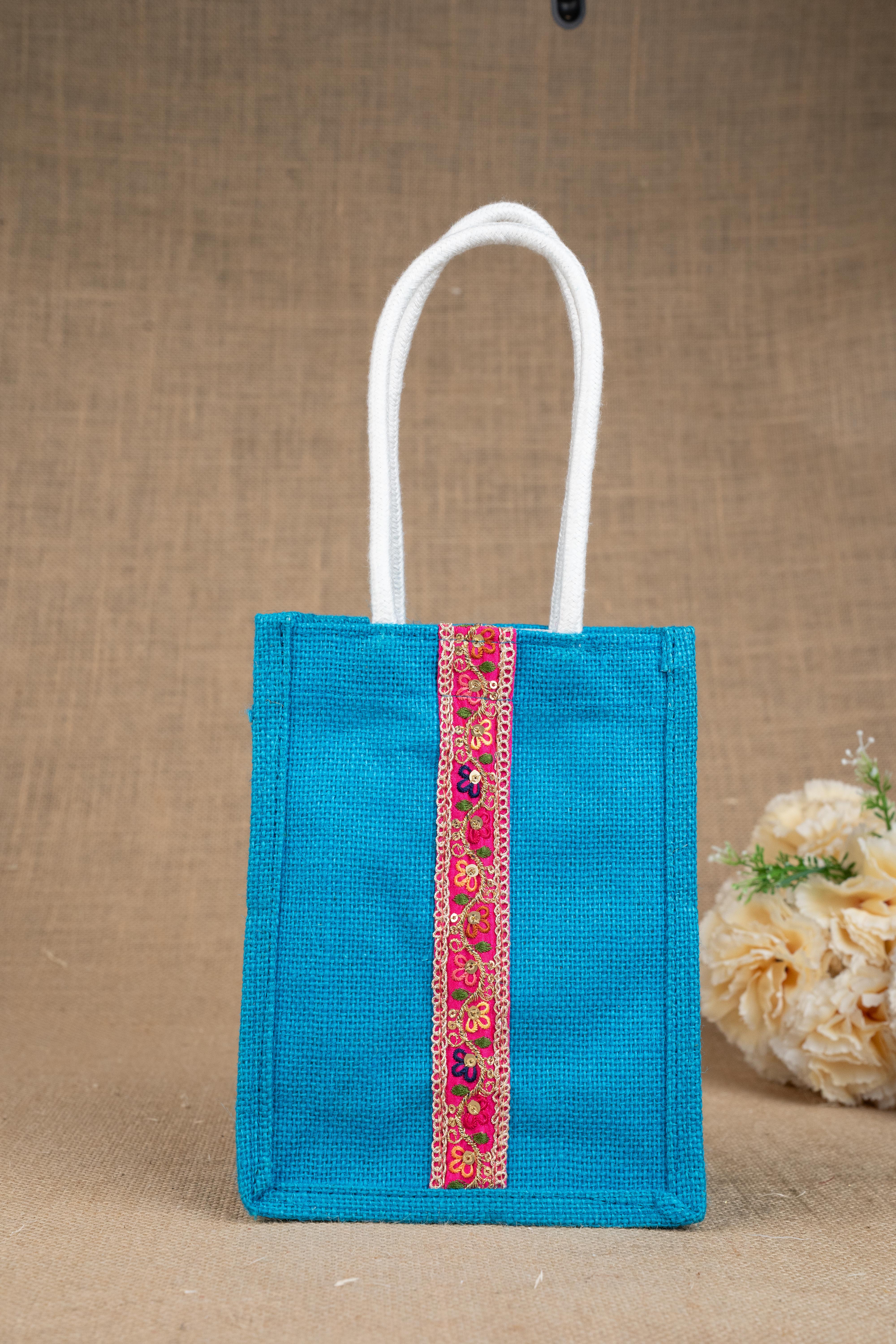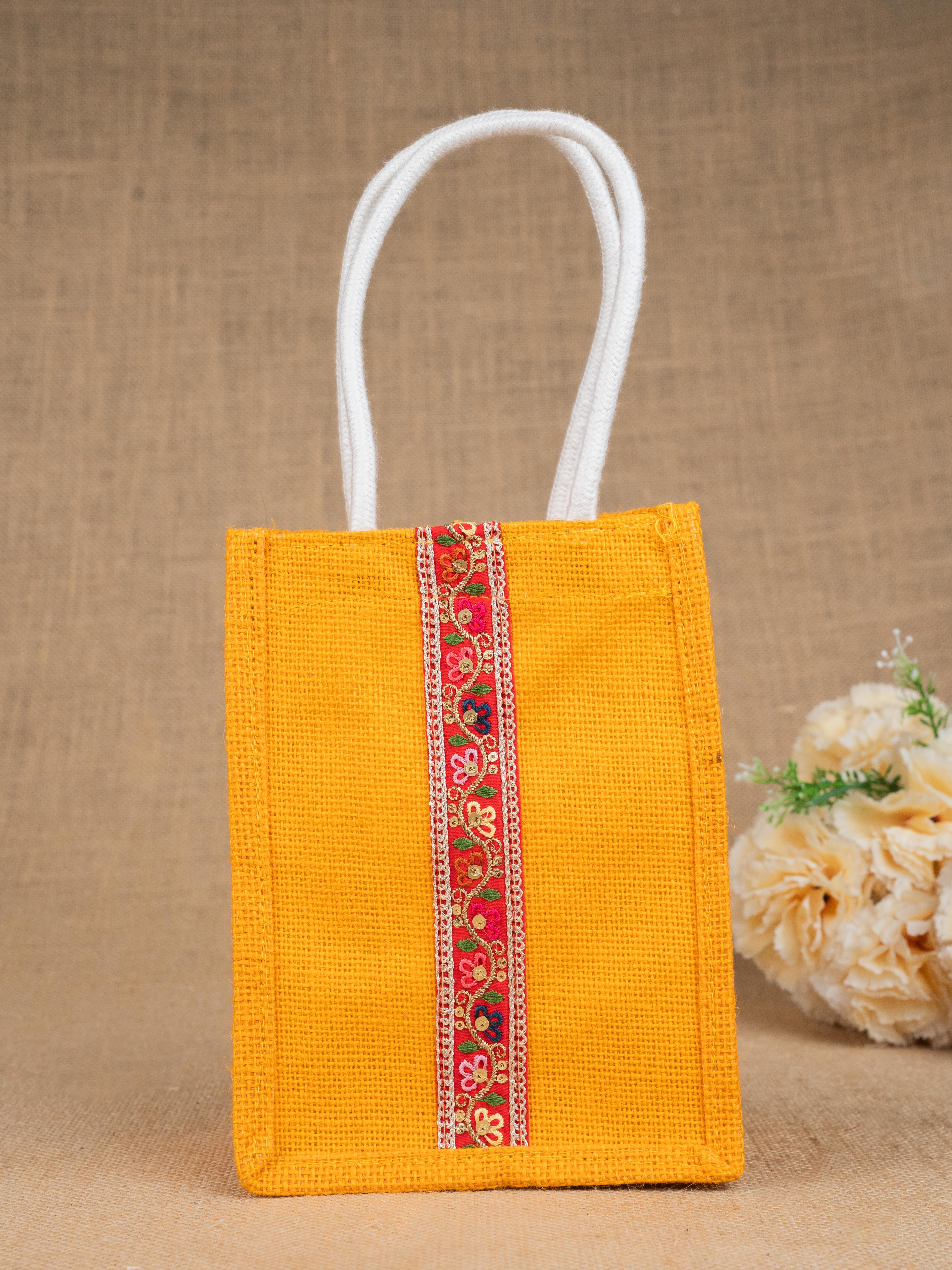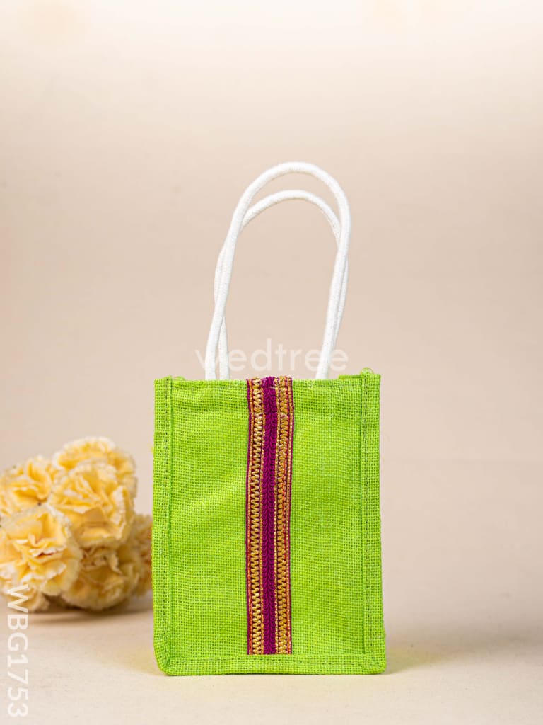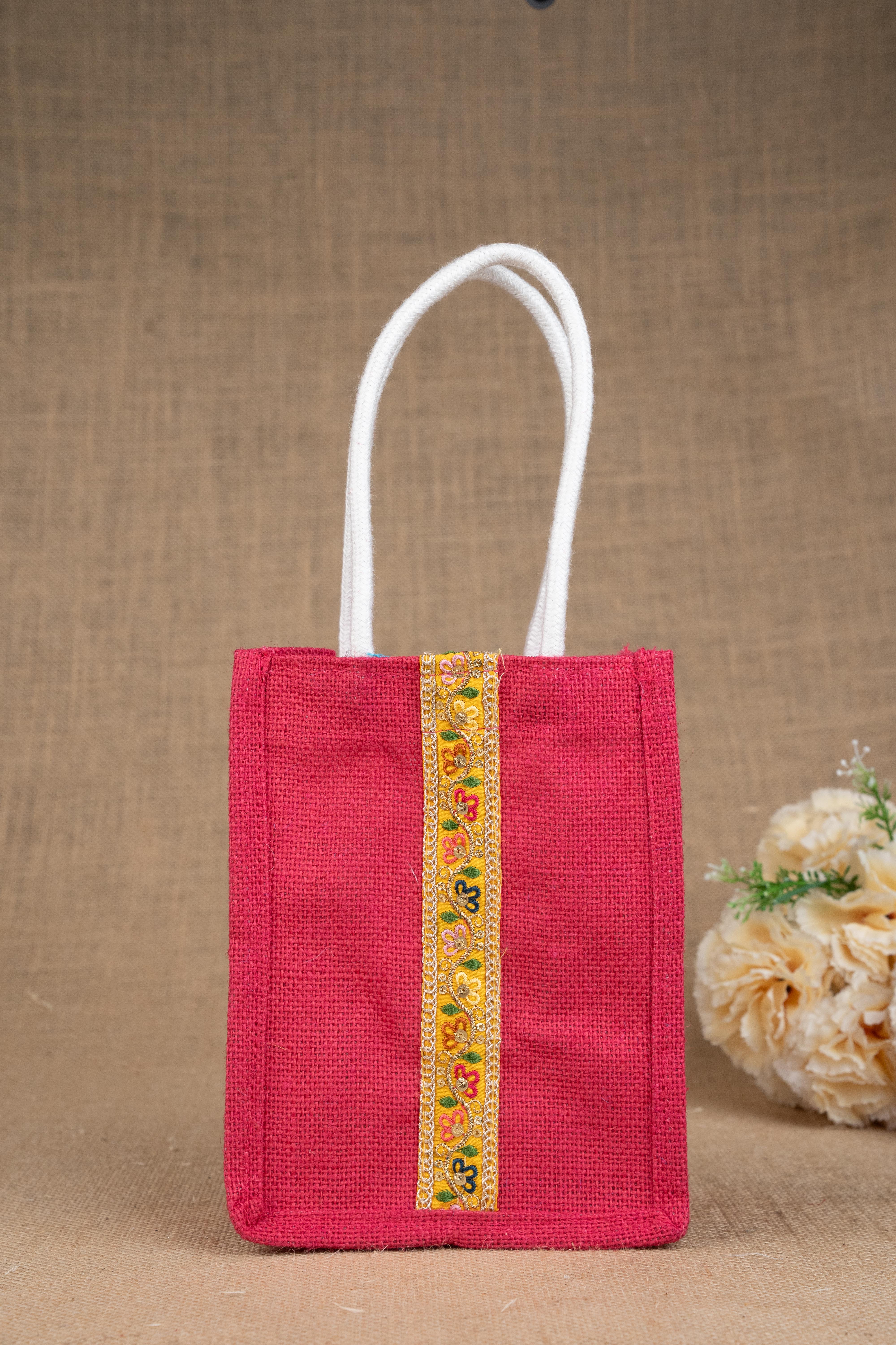 Add a Vibrant Touch to Eco-conscious Living with Our Assorted Color Jute Bags, Accentuated by a Rich, Traditional Zari Border.