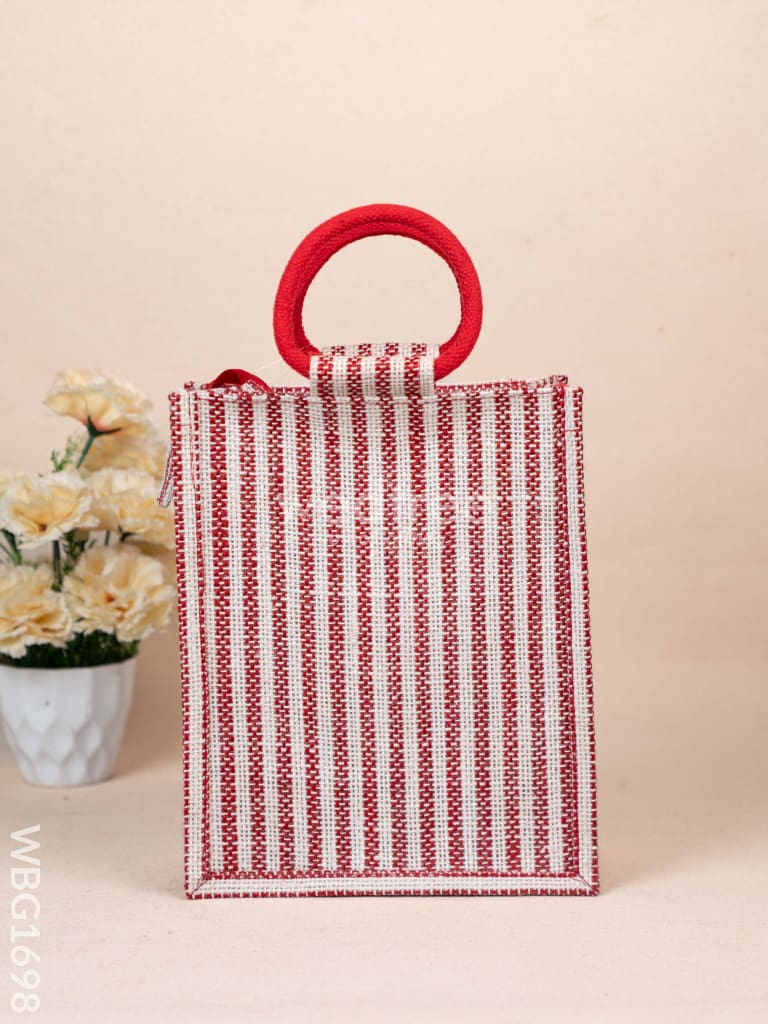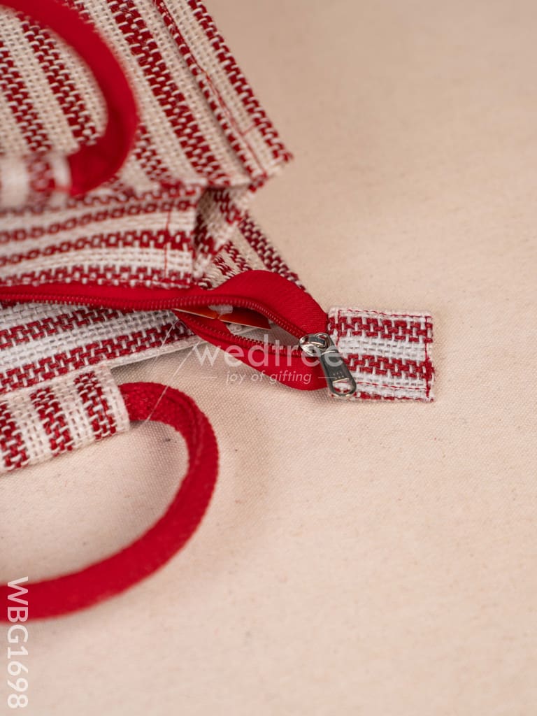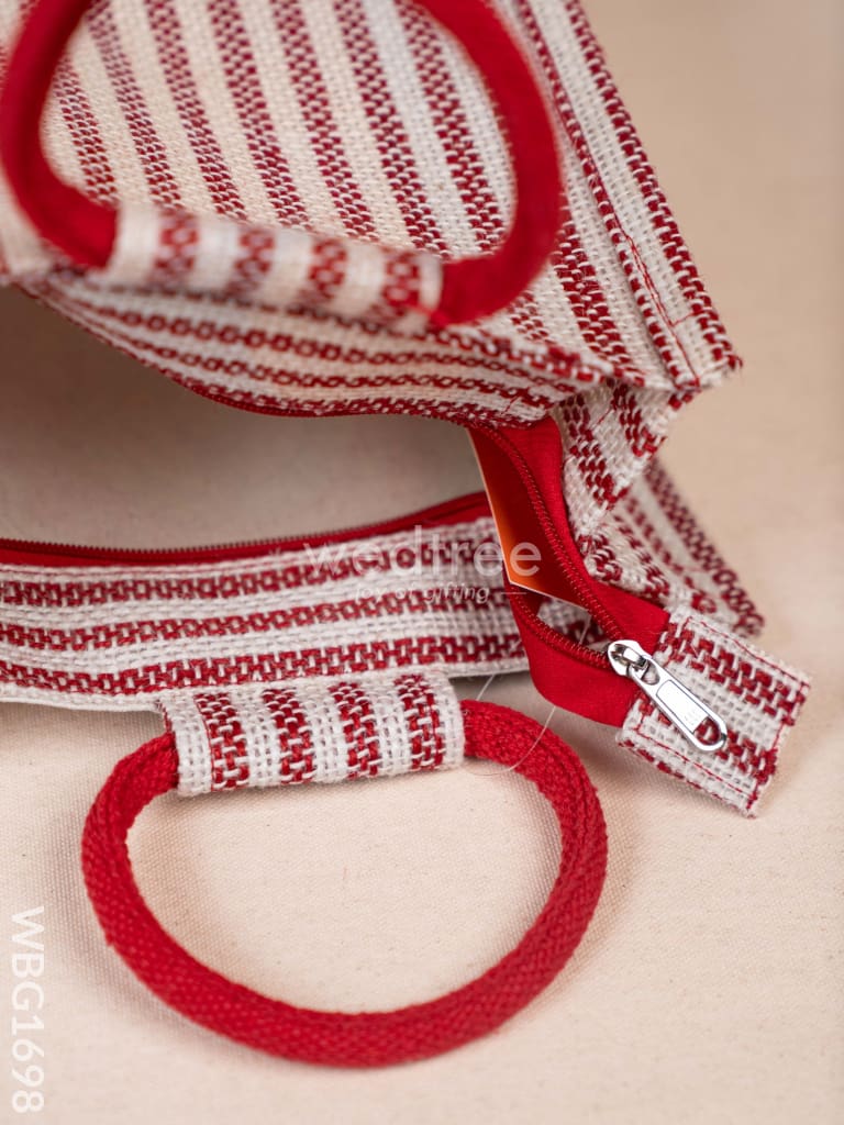 - Made from Eco-friendly Natural Jute, the Bag is Framed with Red and Cream Color contrast Handles and Borders, making it Sturdy, Stylish, and Reusable.