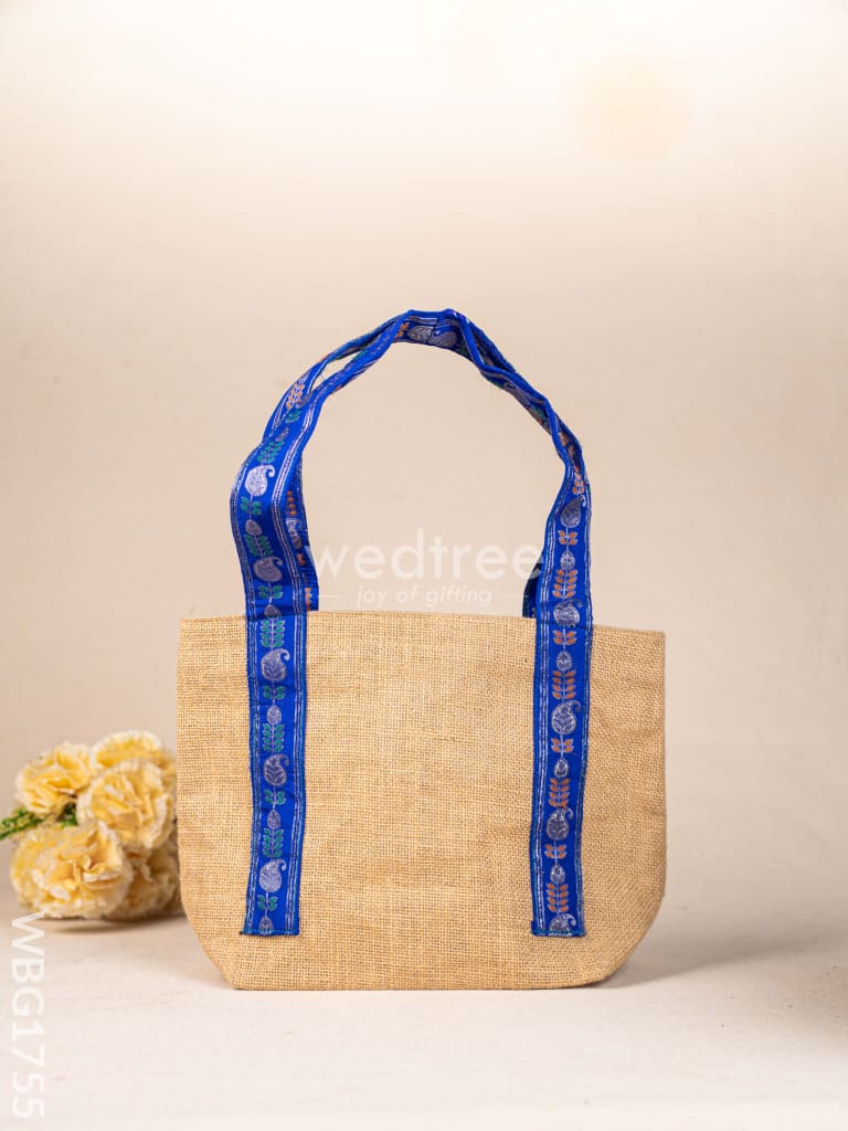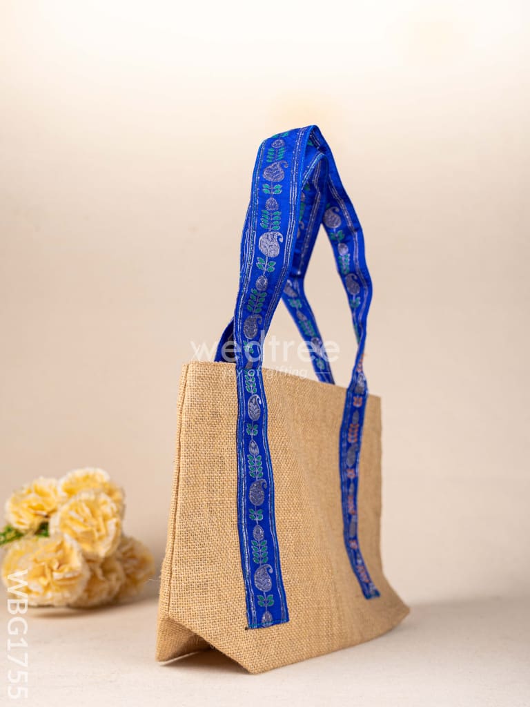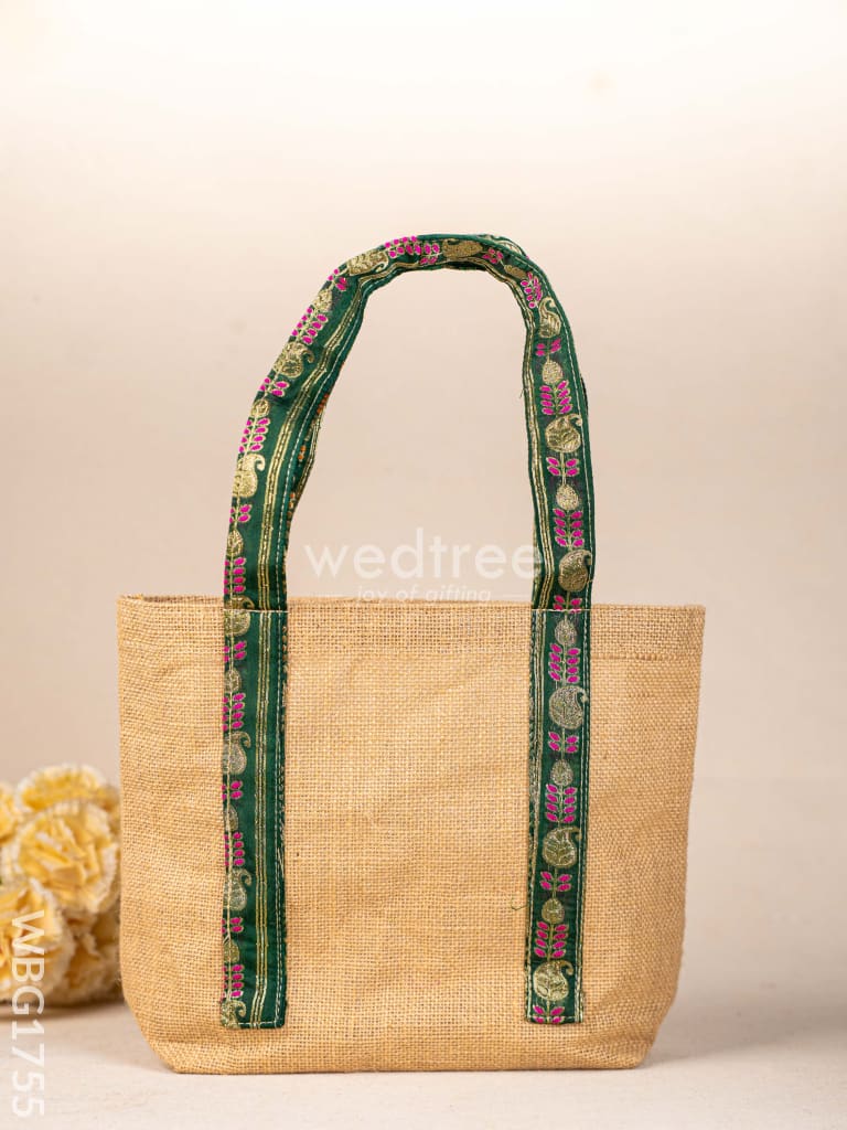- Carry your Essentials in Eco-Friendly Style with this Beautifully Crafted Jute Bag, Adorned with a Shimmering Zari Border for a Touch of Traditional Elegance.