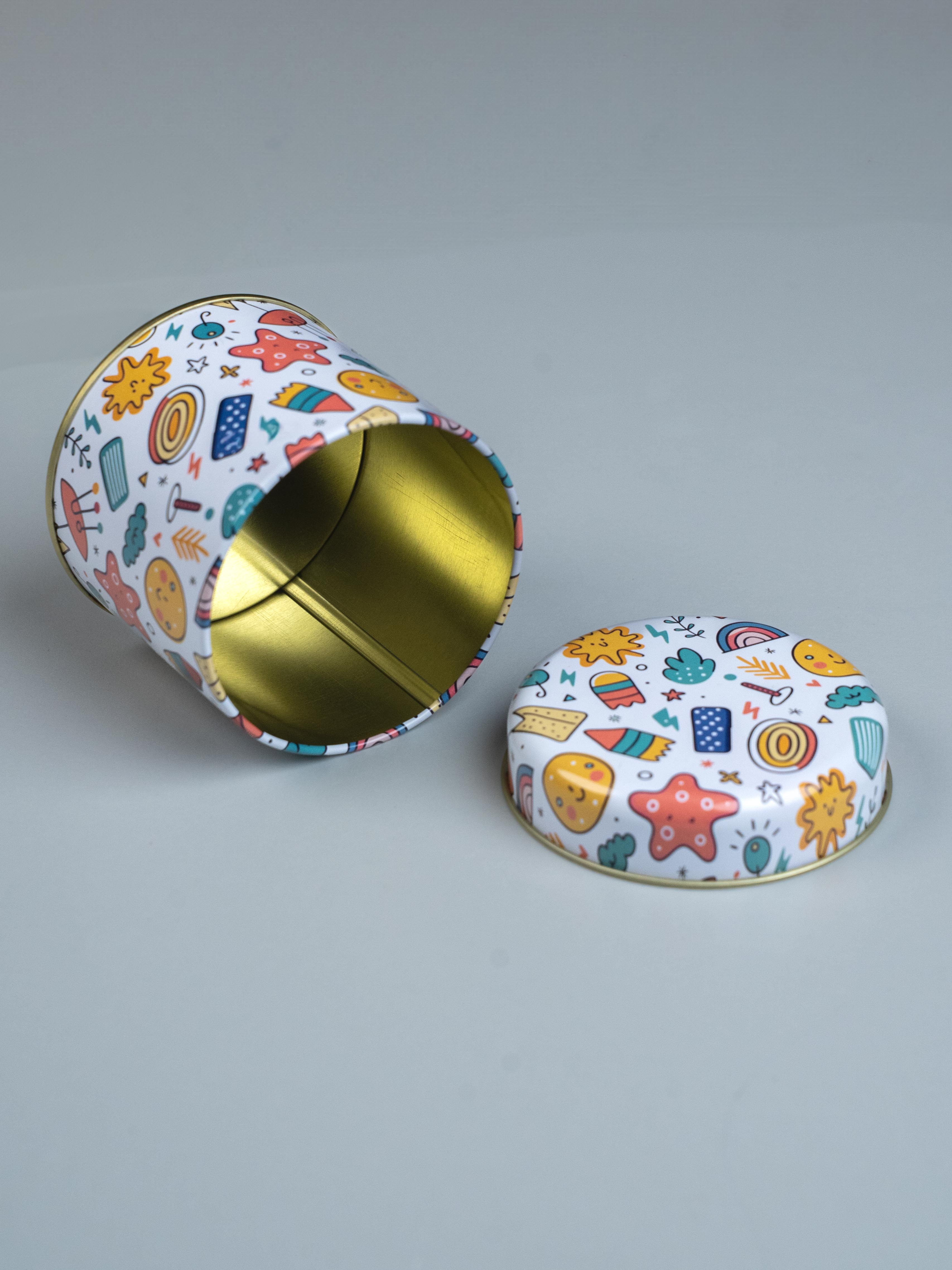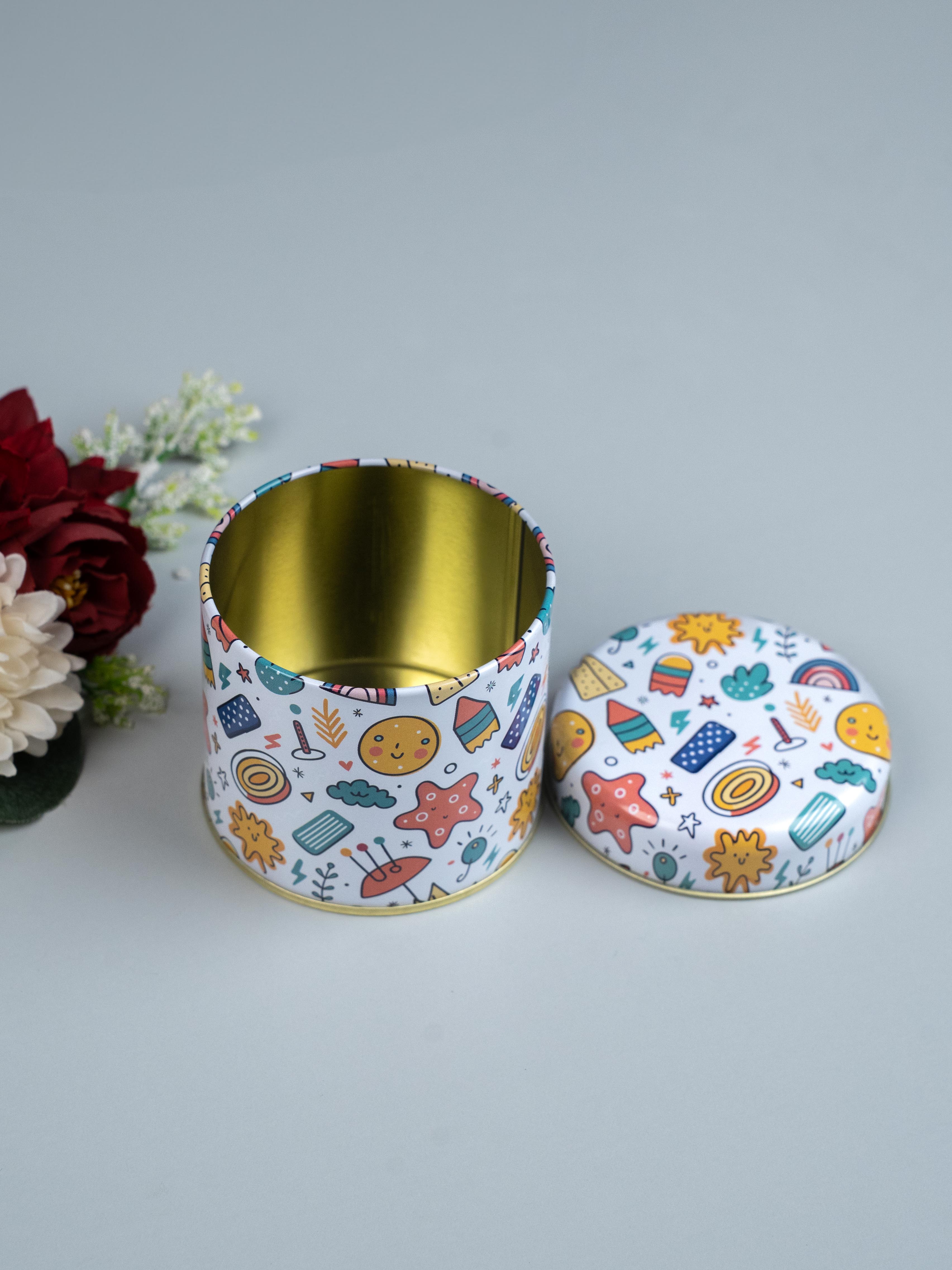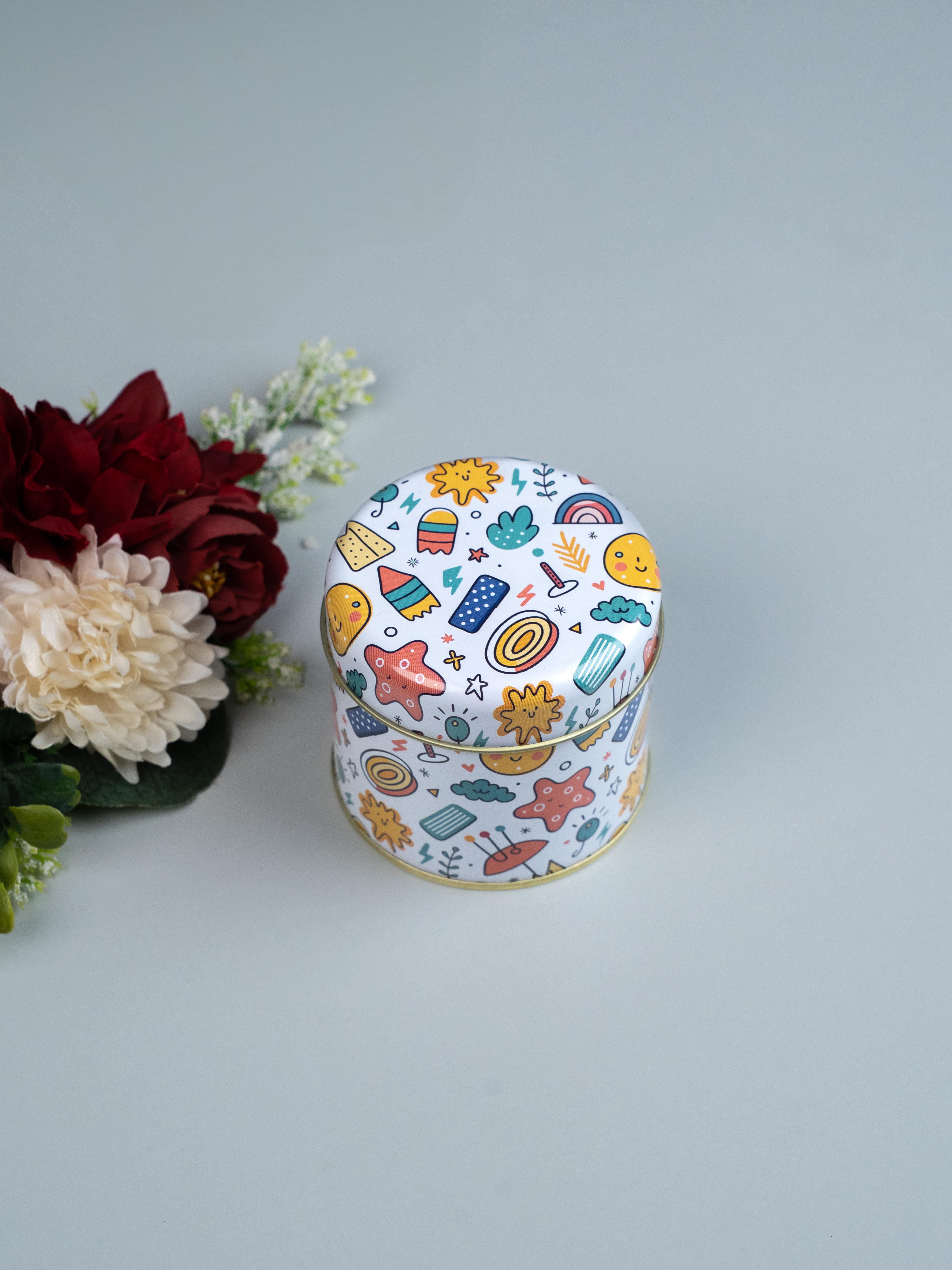 - Brighten up your Storage with this Vibrant Round Tin Jar, featuring a Playful and Artistic Print in Bold, Cheerful Colors.