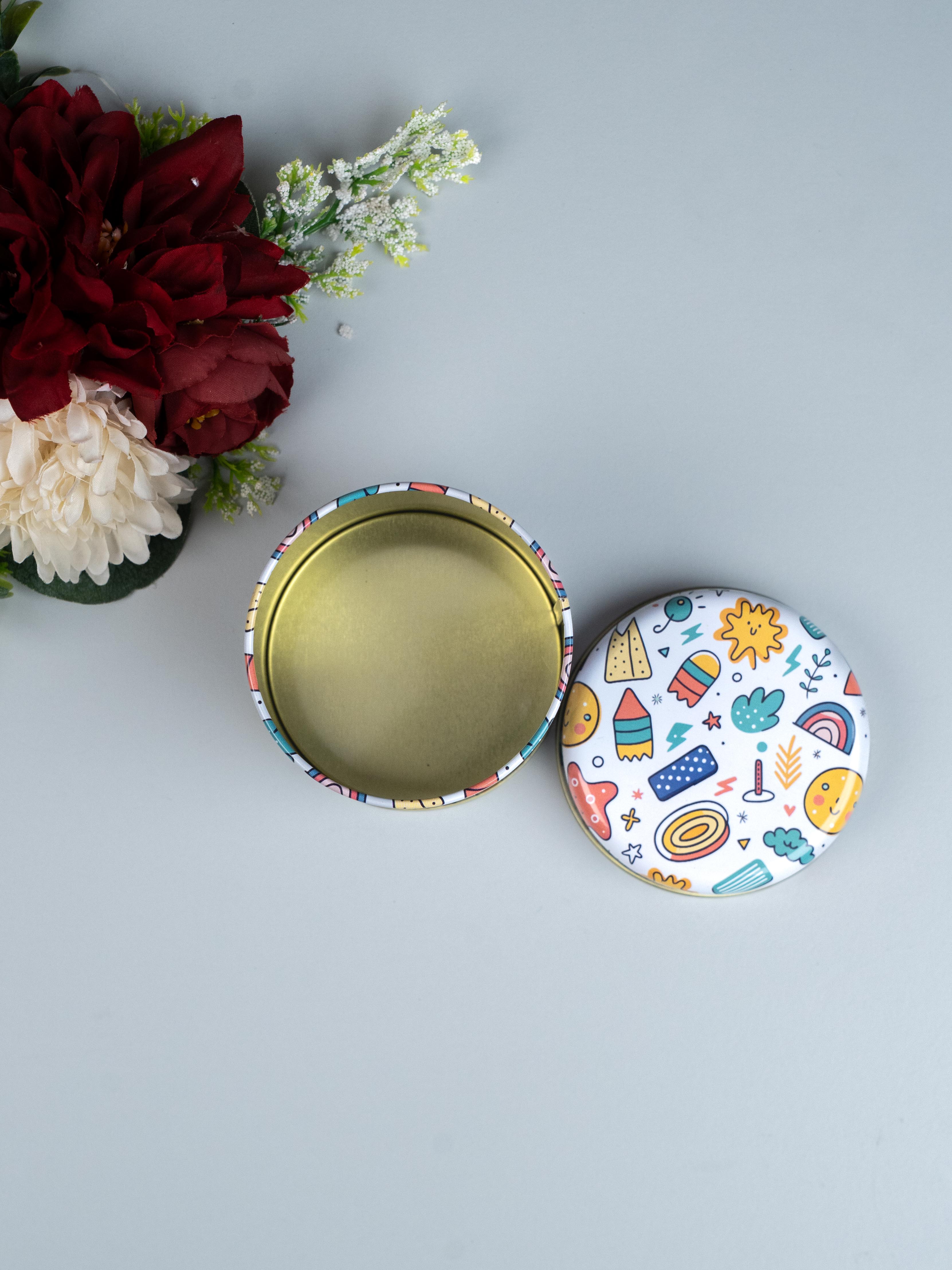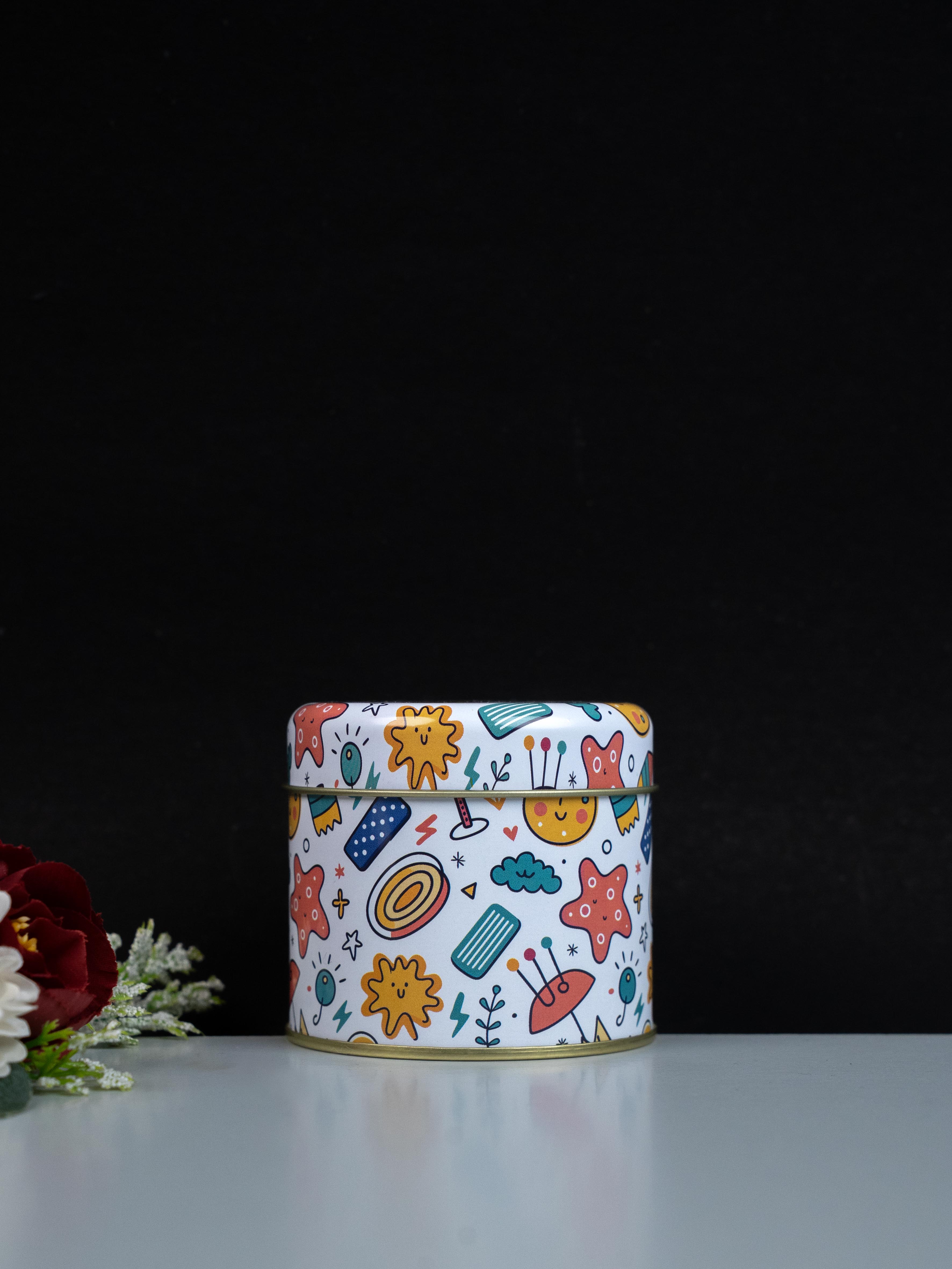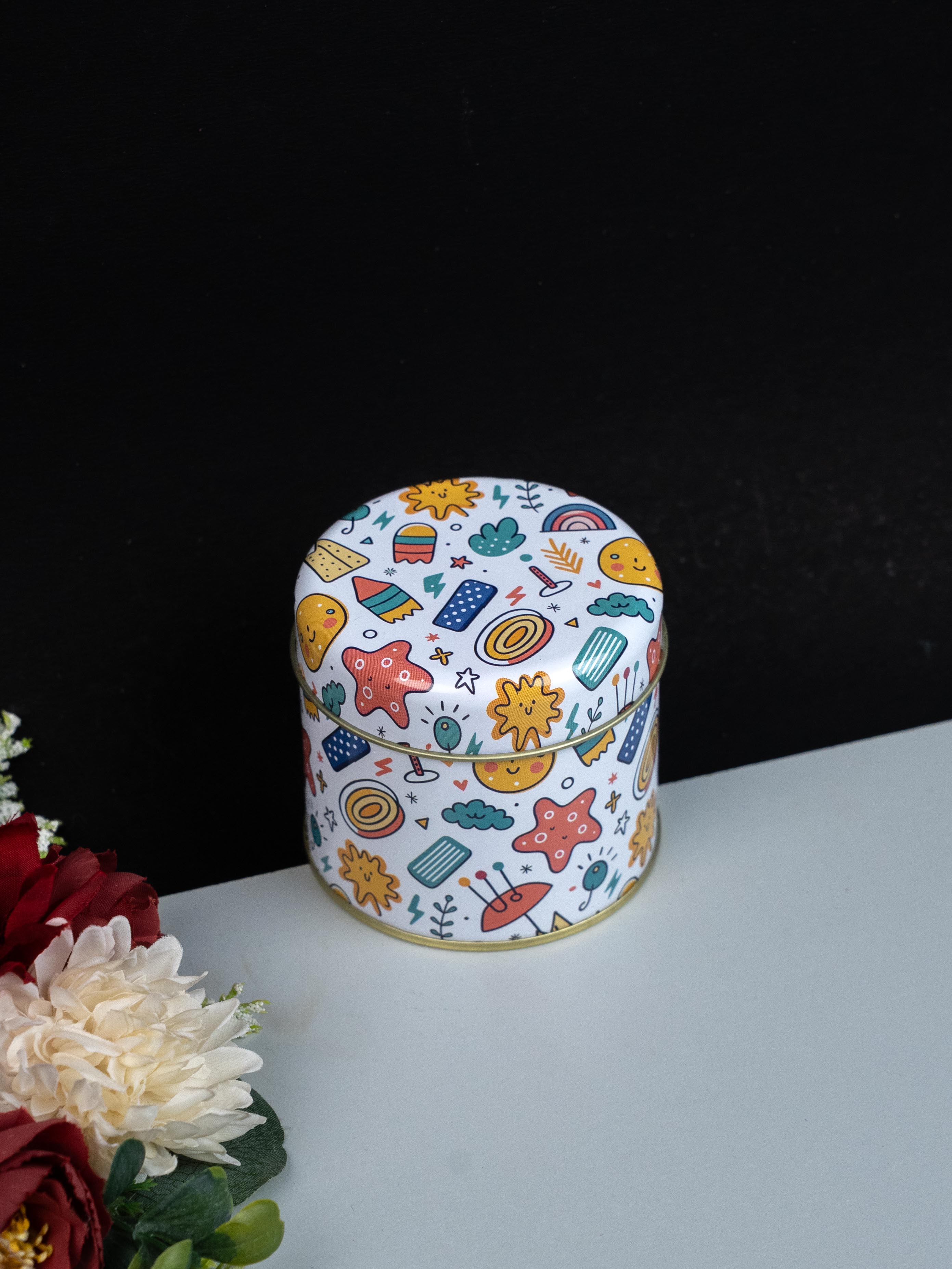 - Brighten up your Storage with this Vibrant Round Tin Jar, featuring a Playful and Artistic Print in Bold, Cheerful Colors.