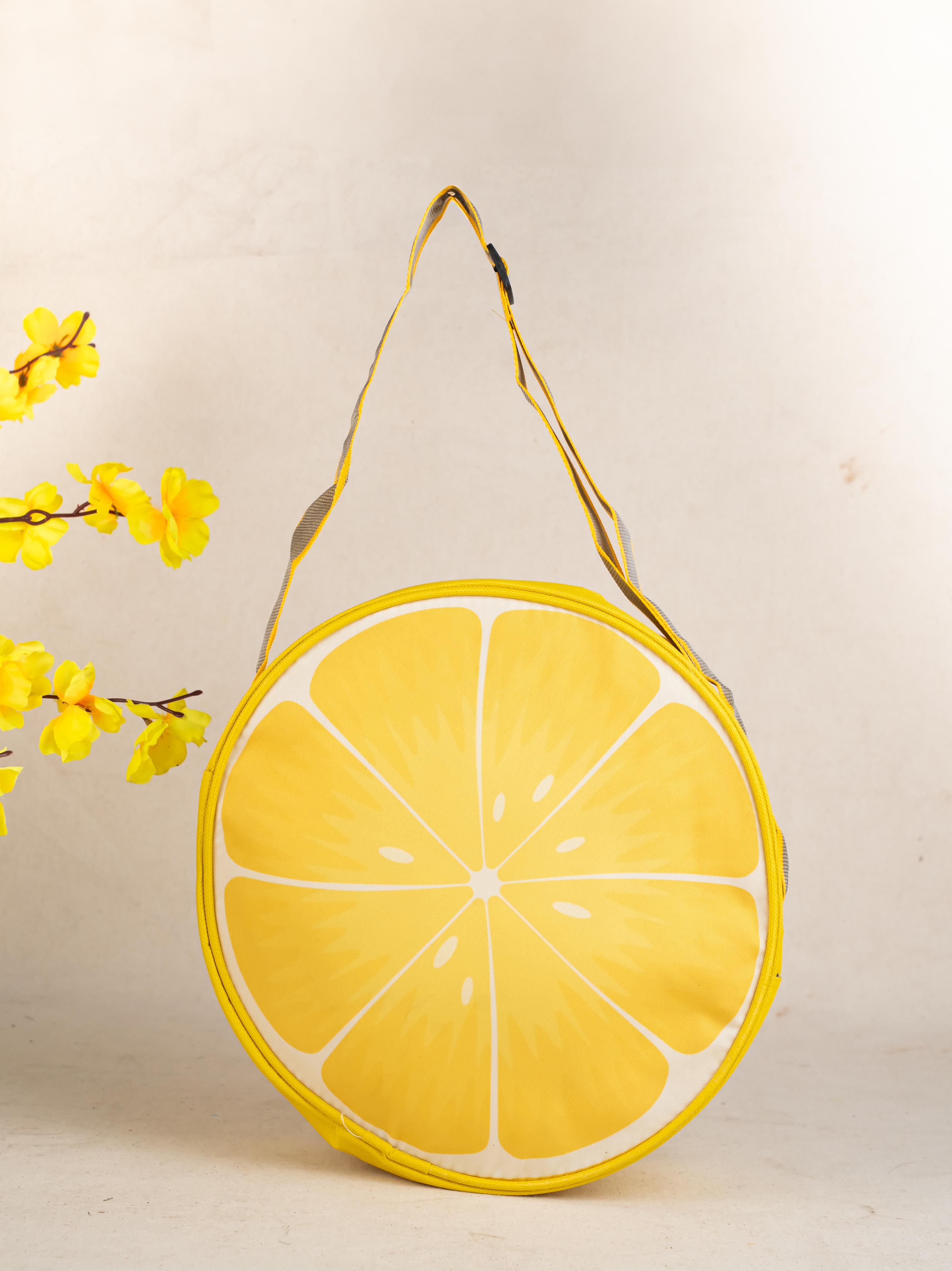 - Round Bag with a Vibrant Orange Fruit Slice Print.