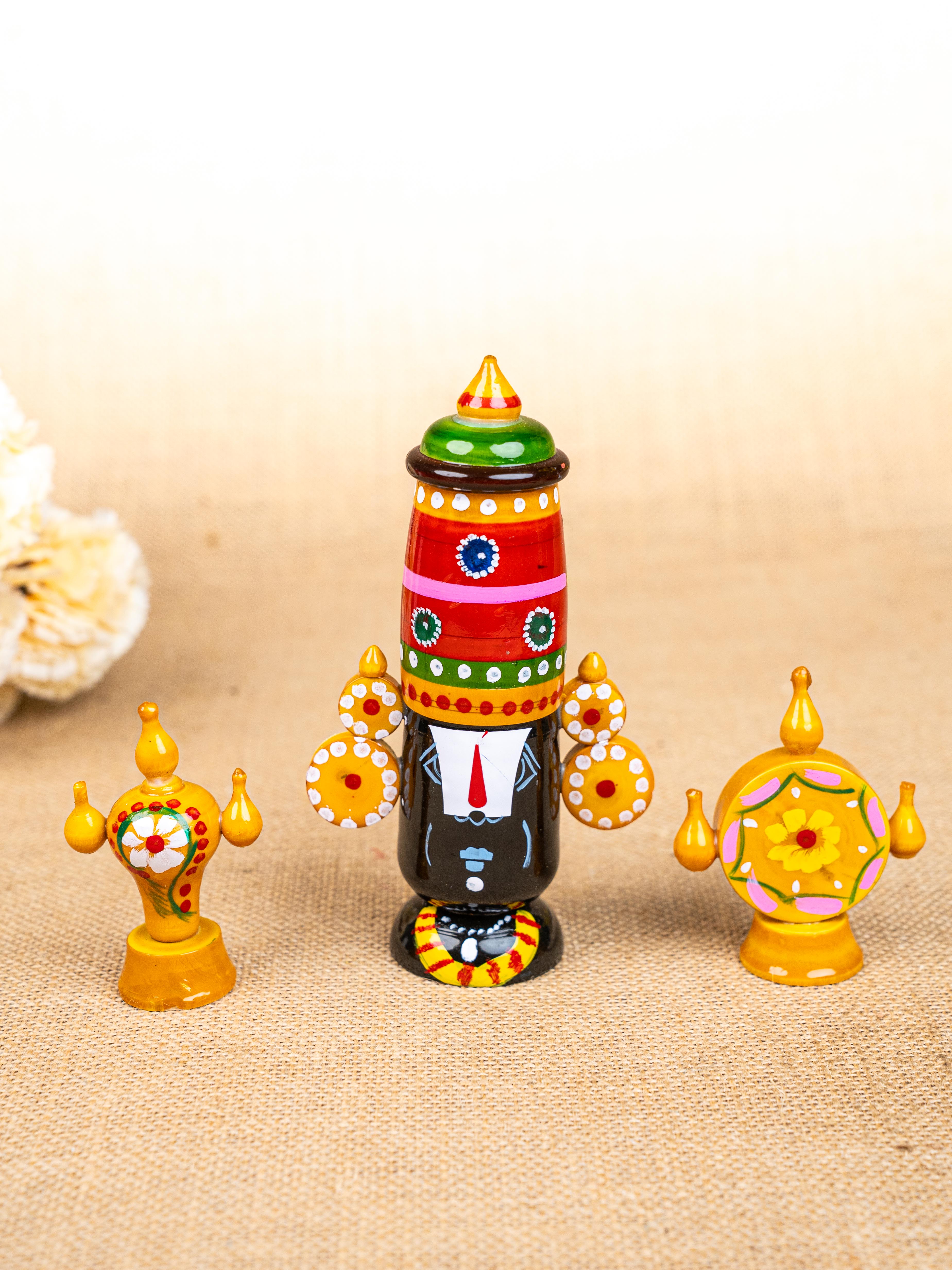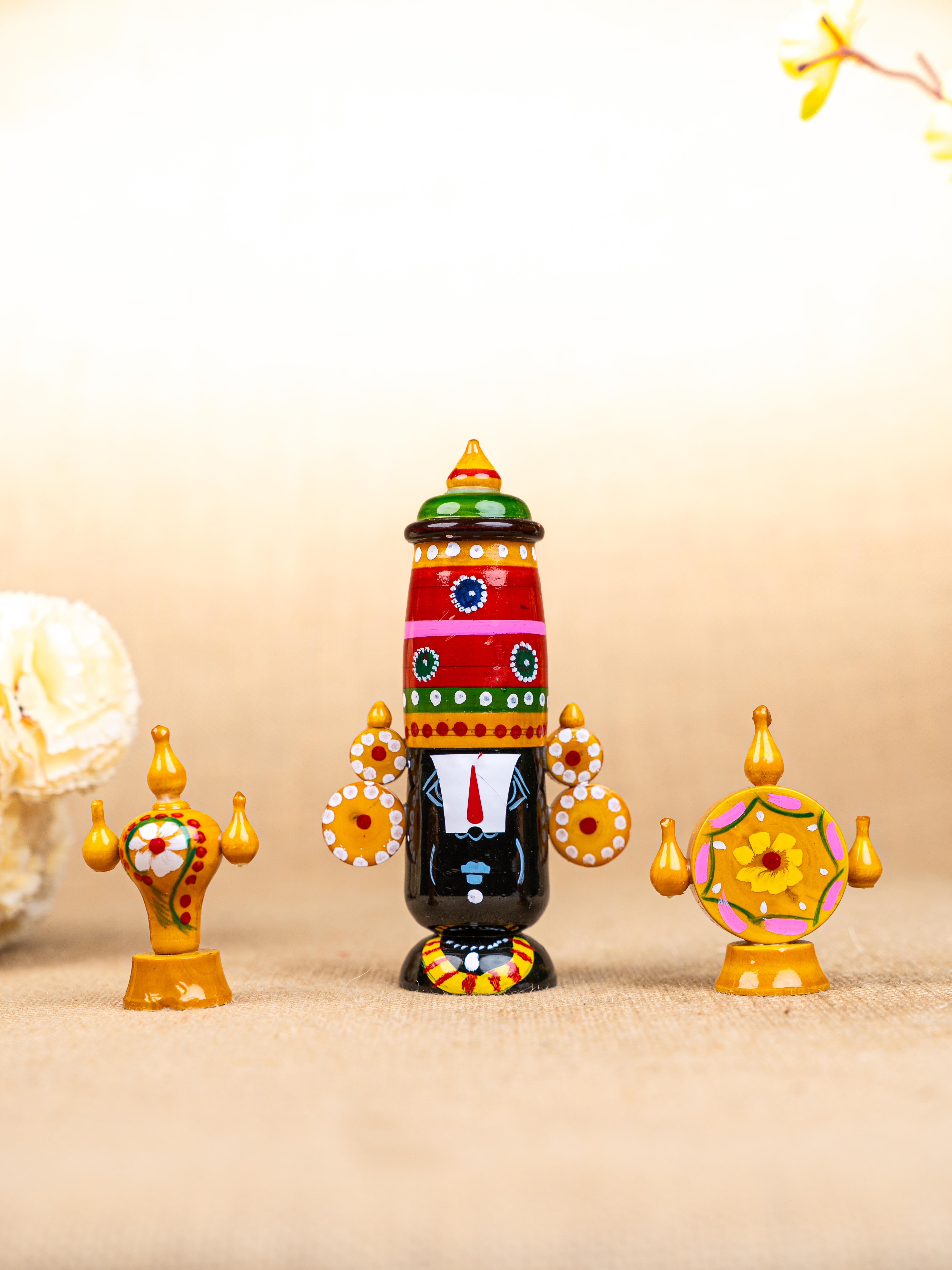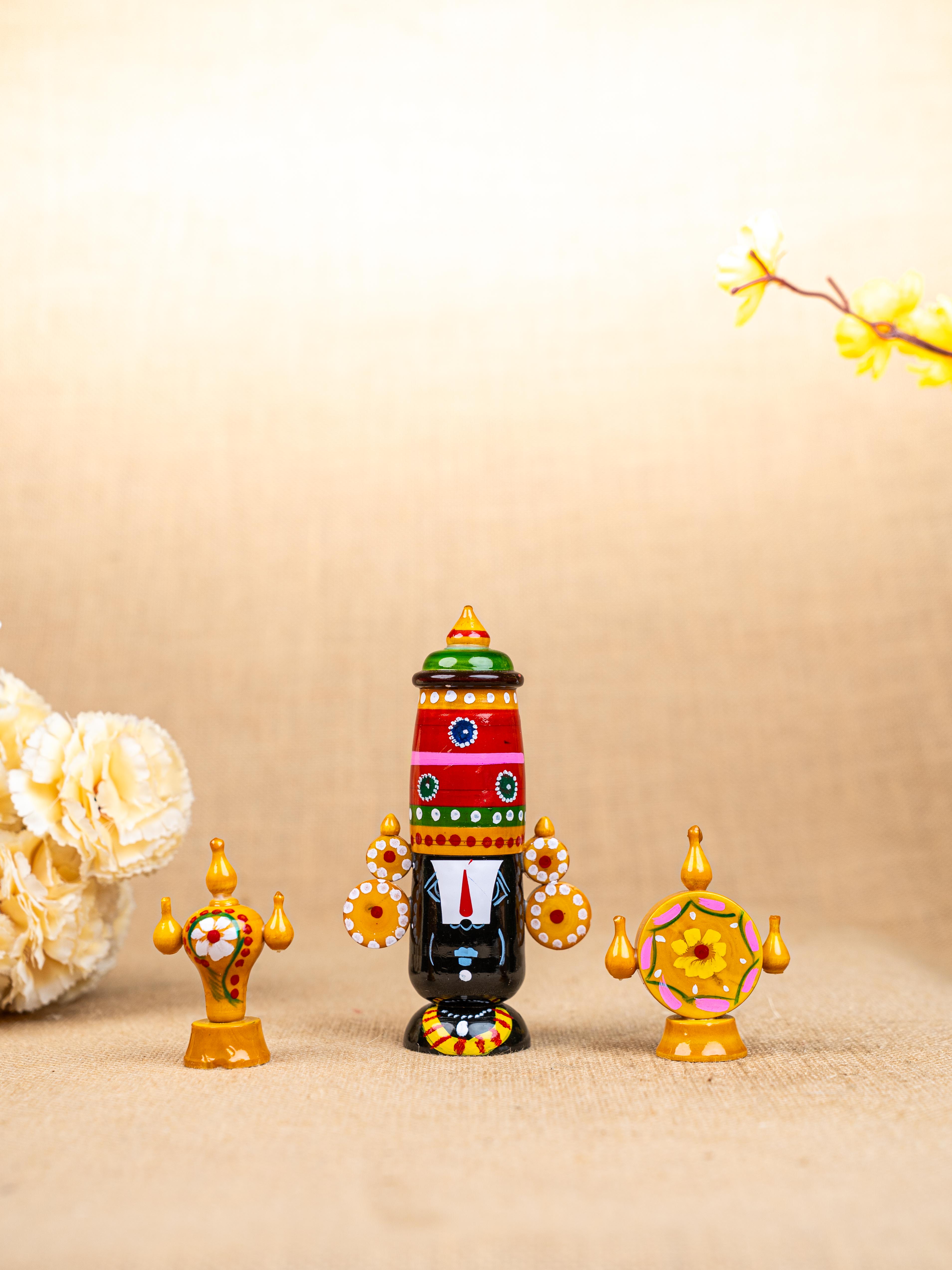 - This is a Handcrafted Kondapalli Wooden Set representing Lord Venkateswara (Balaji) along with his Divine Symbols.
