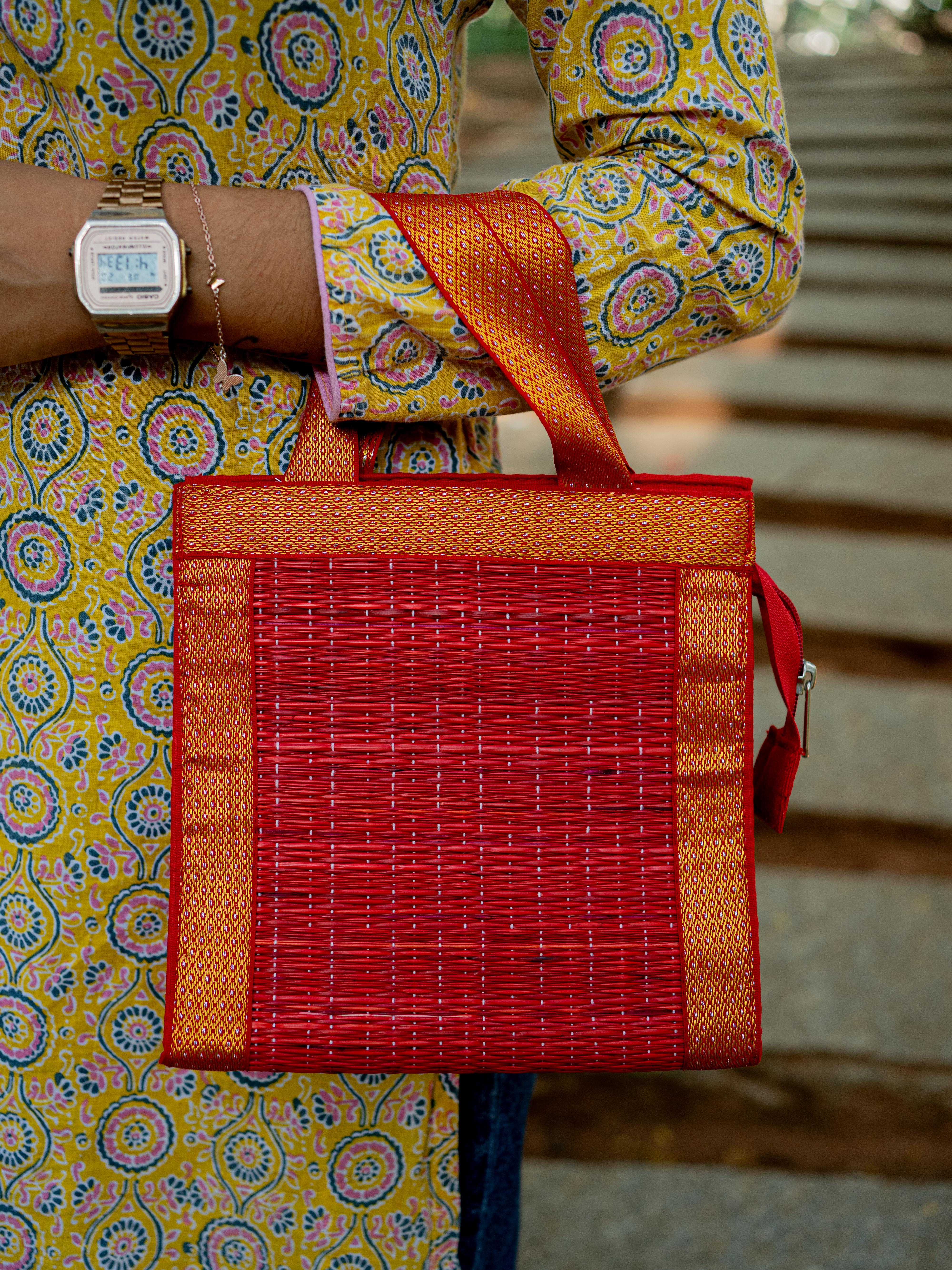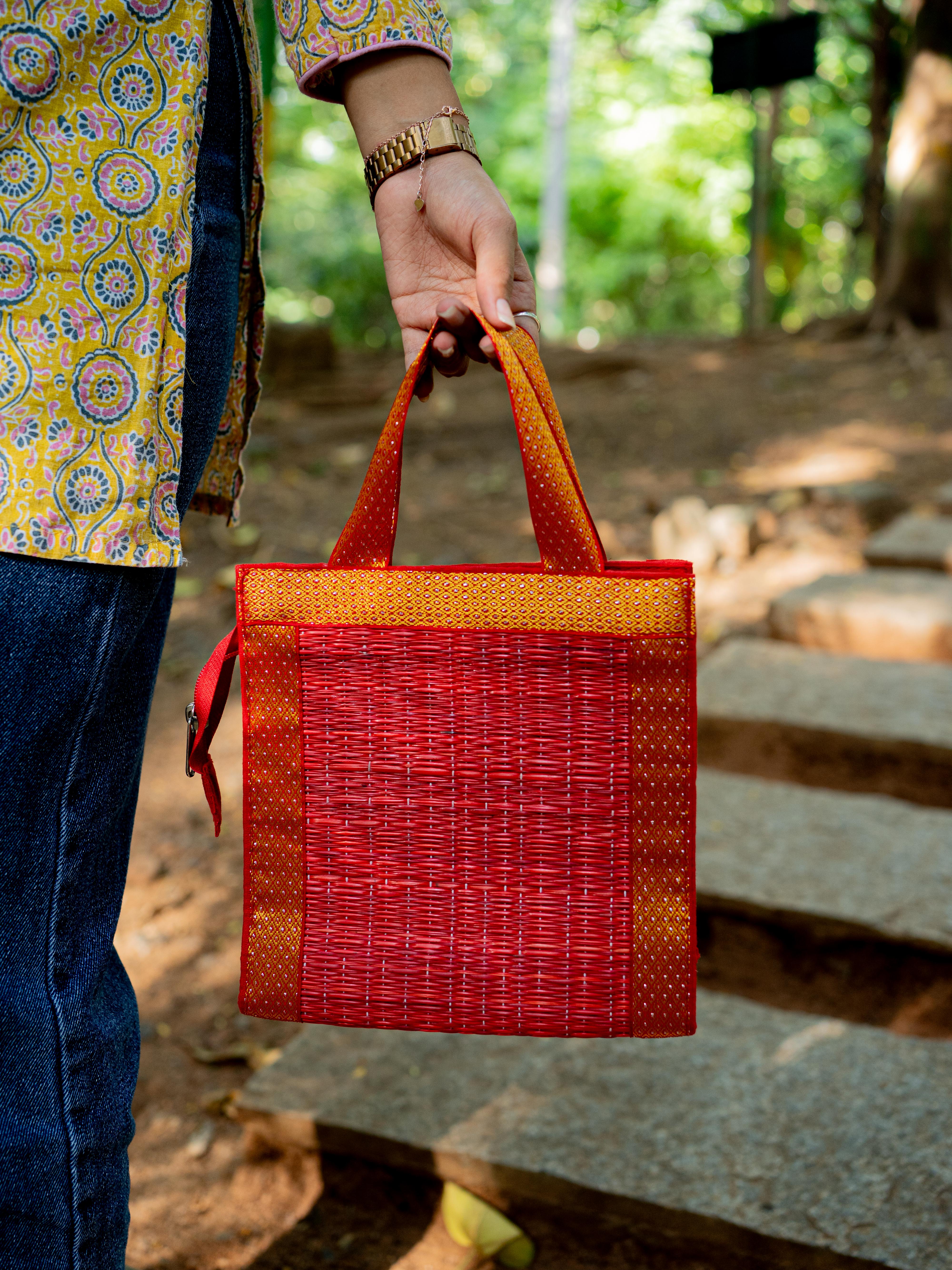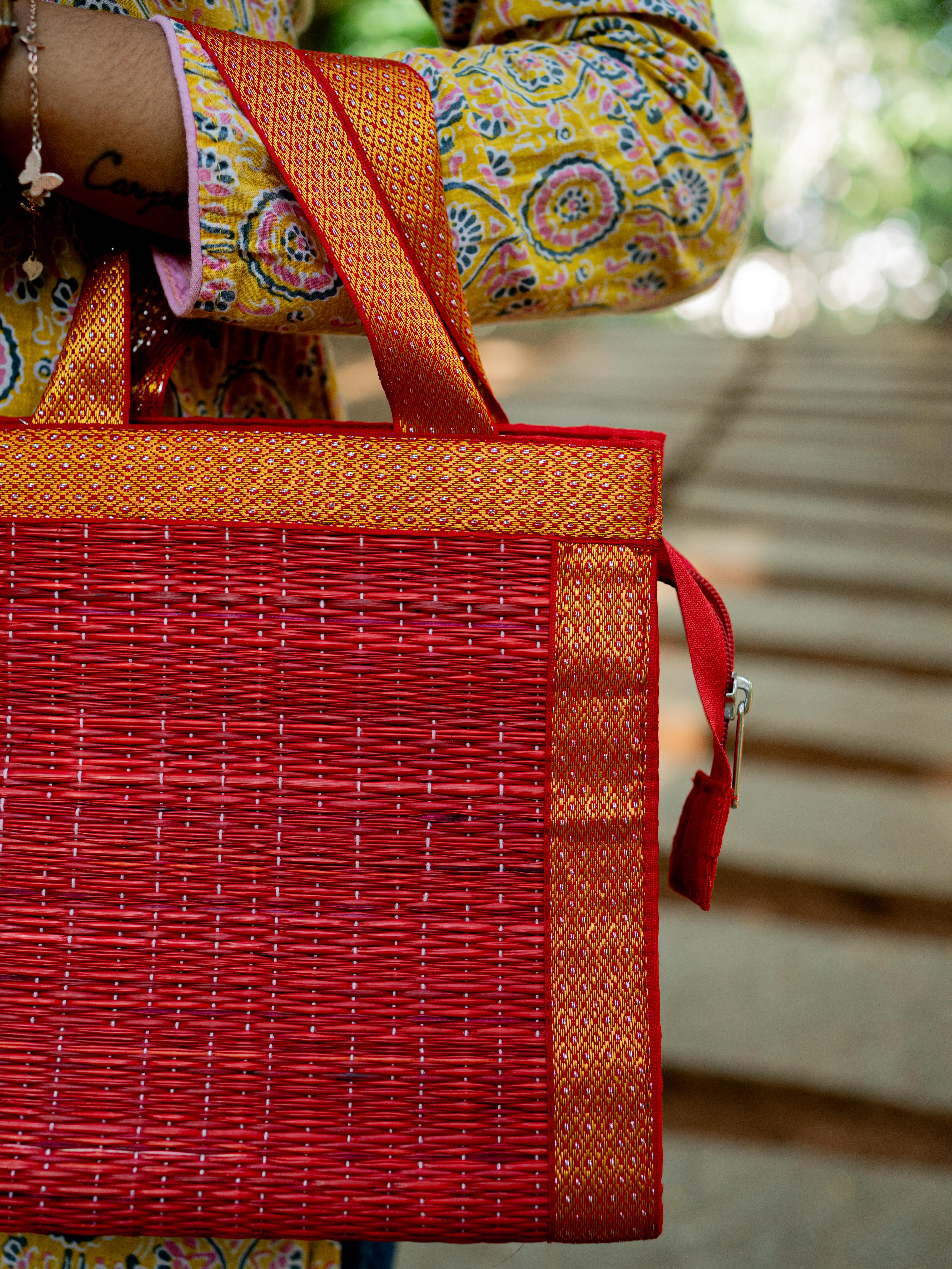 - Handcrafted Red Korai Bag, made from Traditional Korai Grass Weaving that Gives it a Natural, Eco-Friendly Appeal.