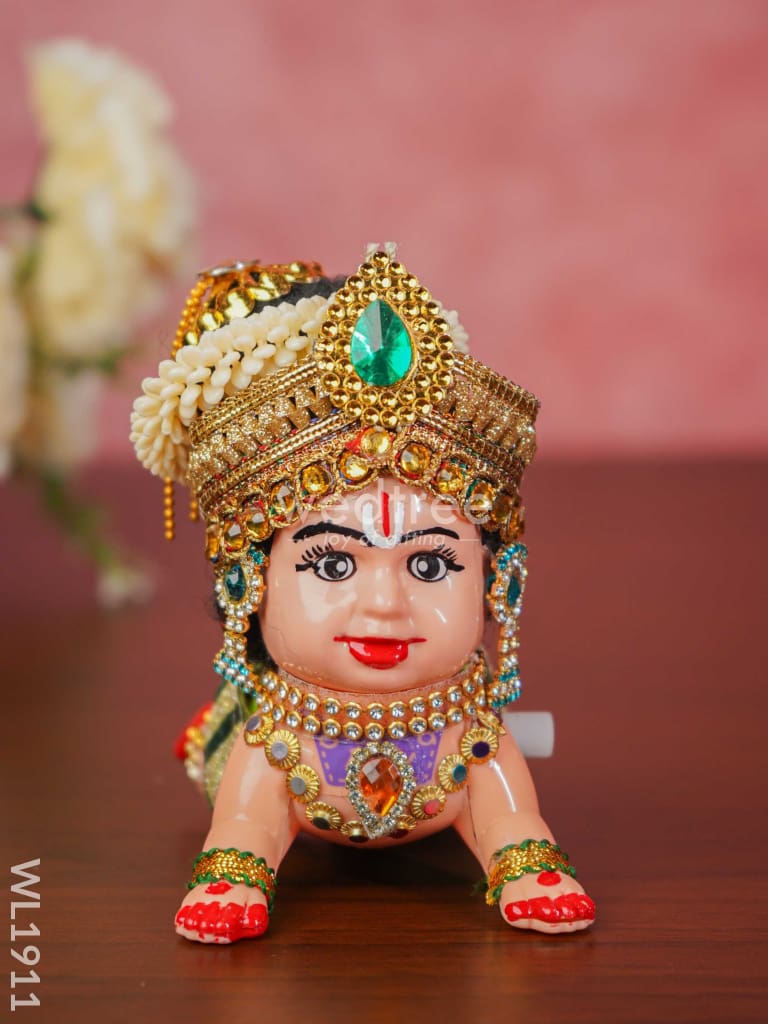 - The doll has very pretty Kundan stone work done and has a twist key on the side by which the doll crawls.