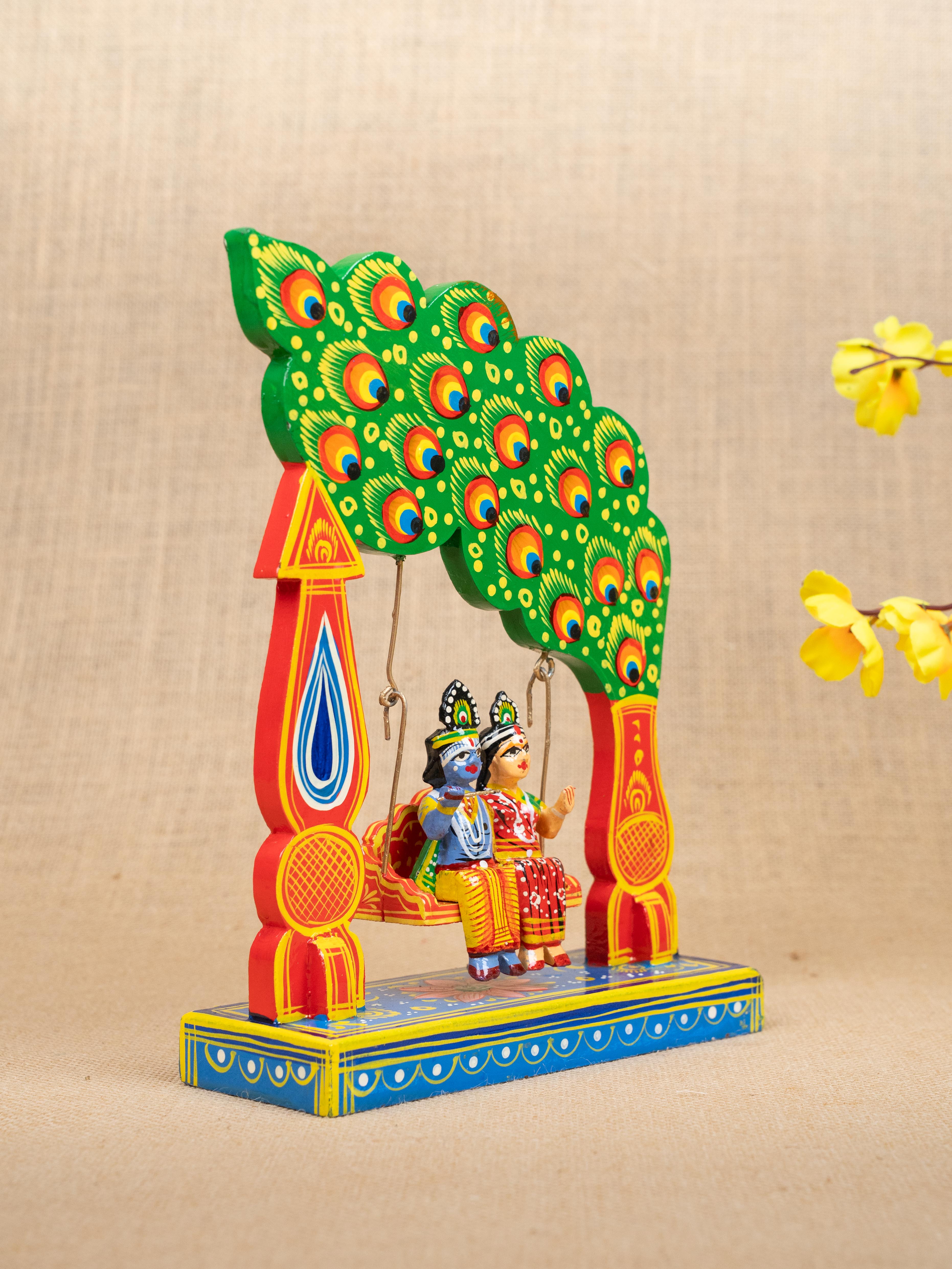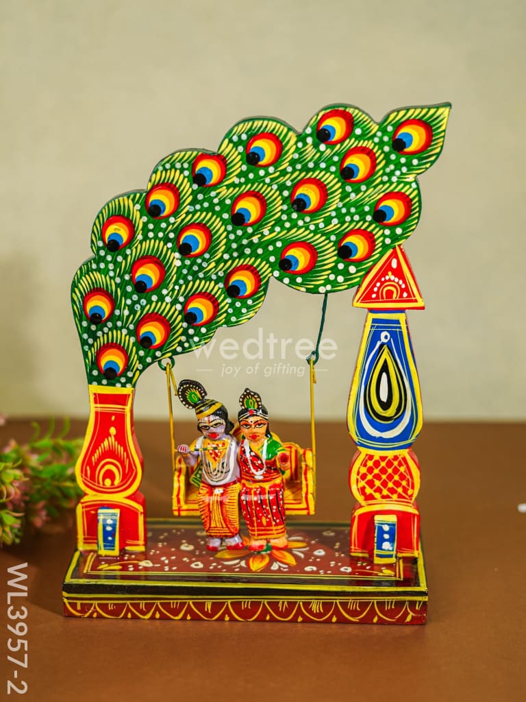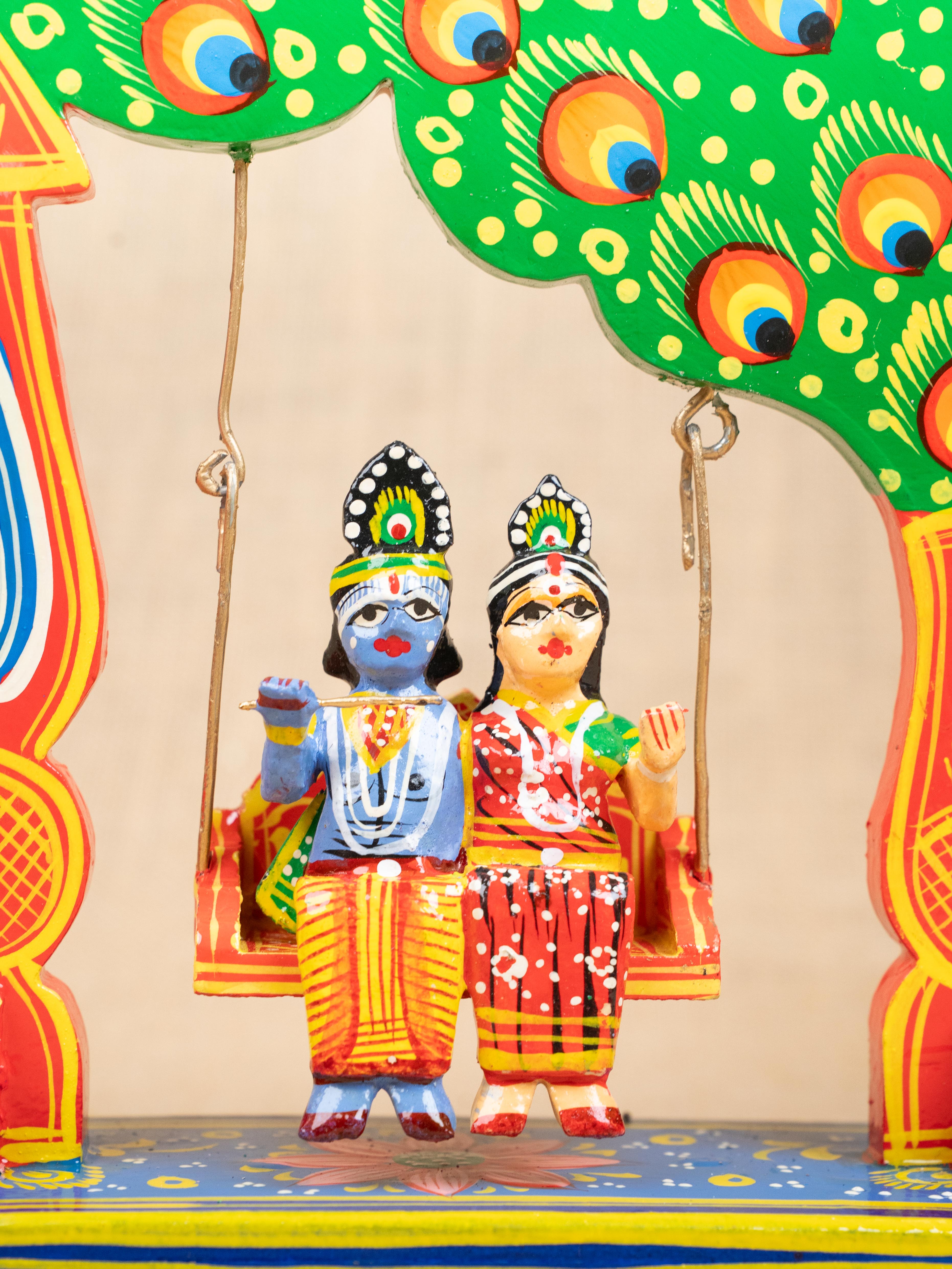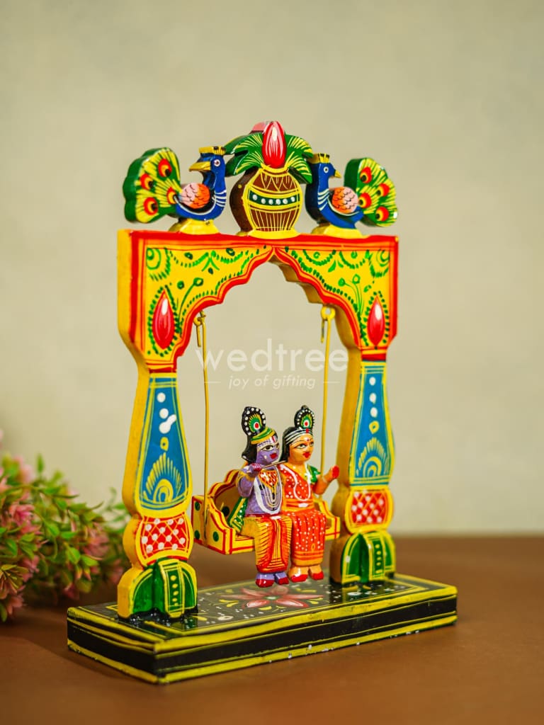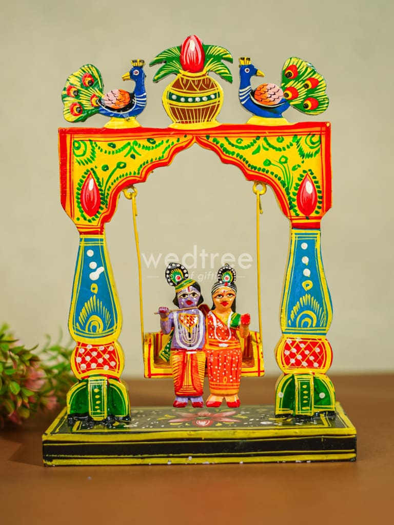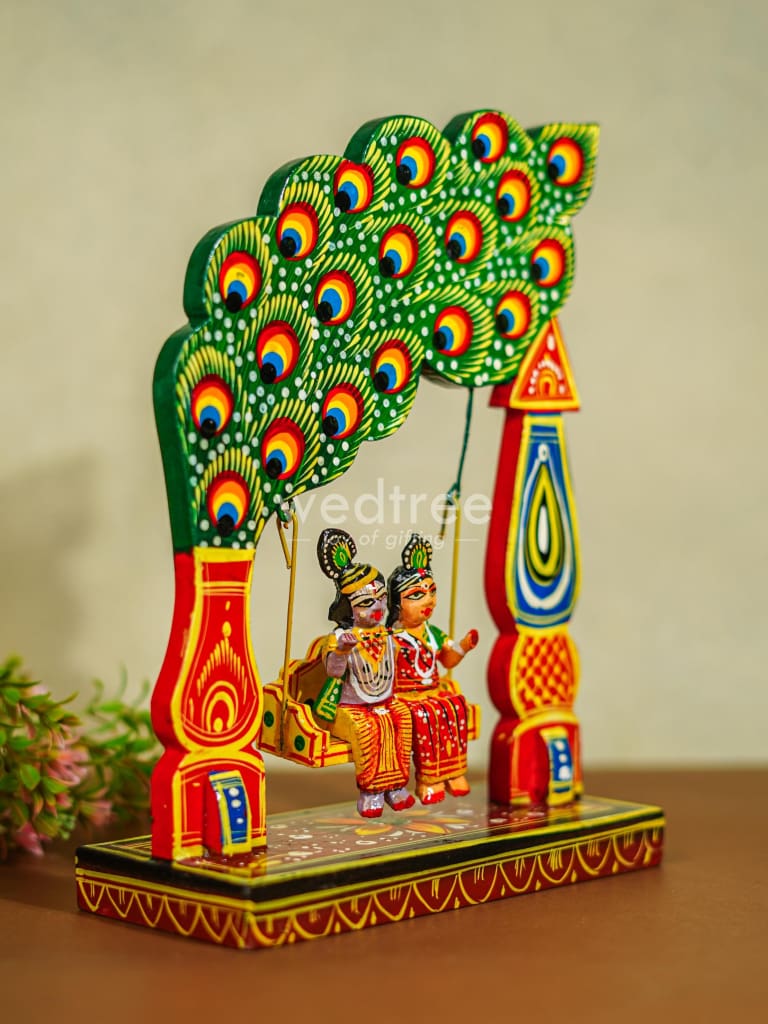 - It features Krishna & Radha beautifully swinging on Jhula and comes in 3 different designs - Tree, Peacock Feather and Peacock Mandap design.