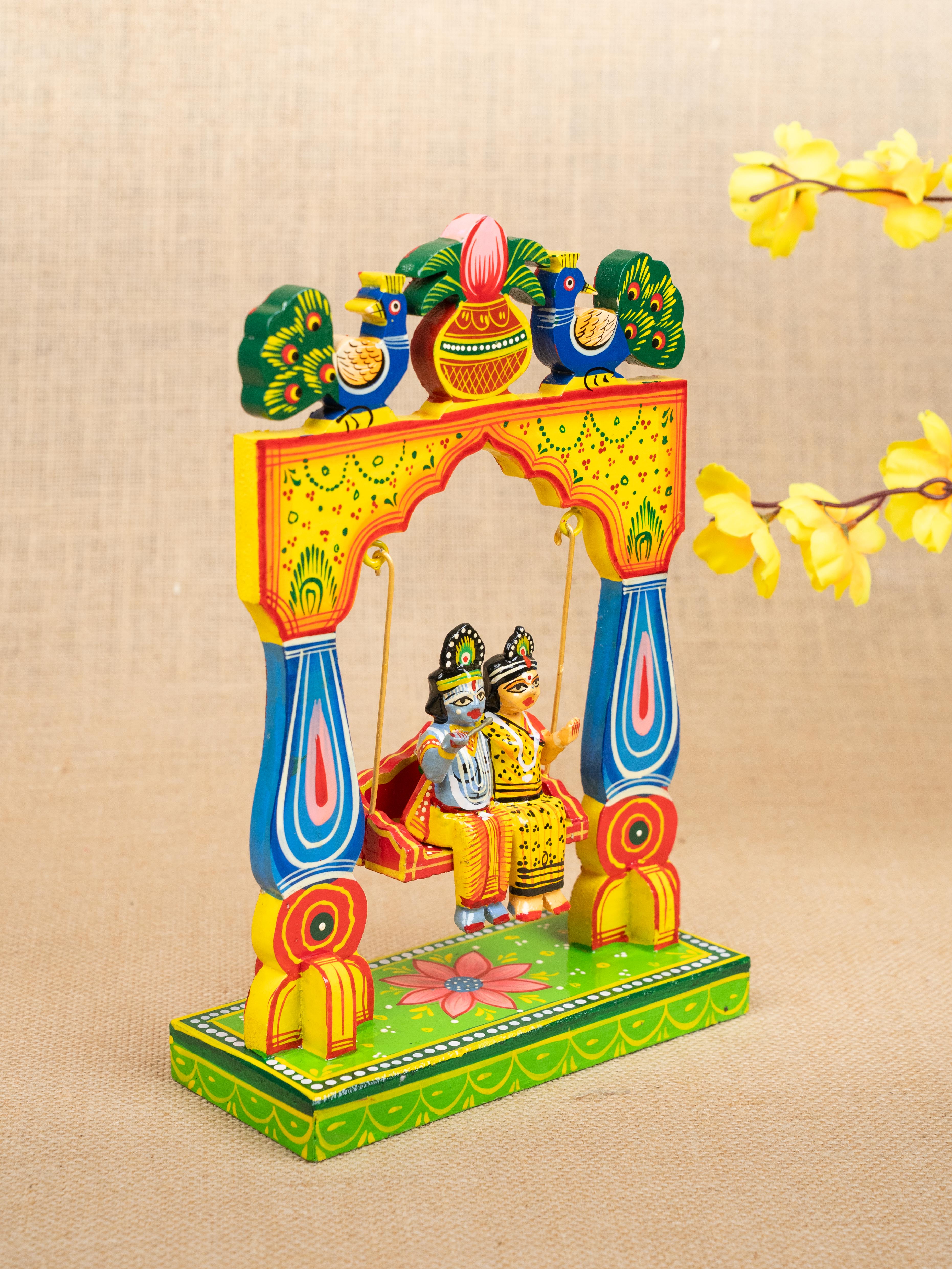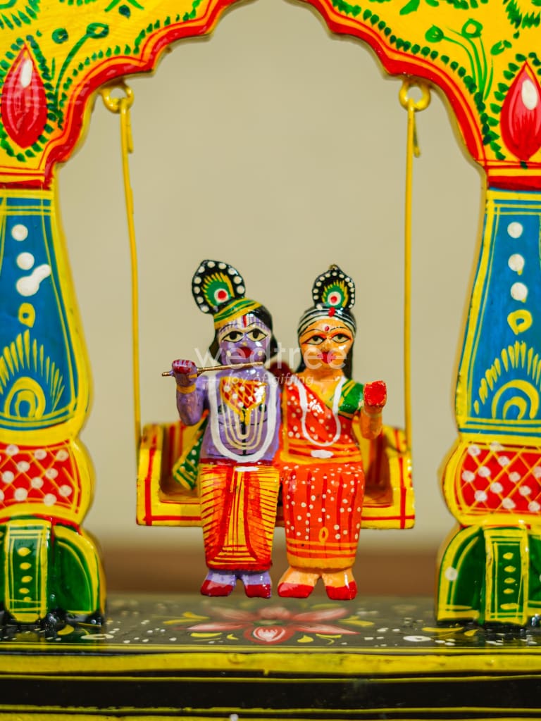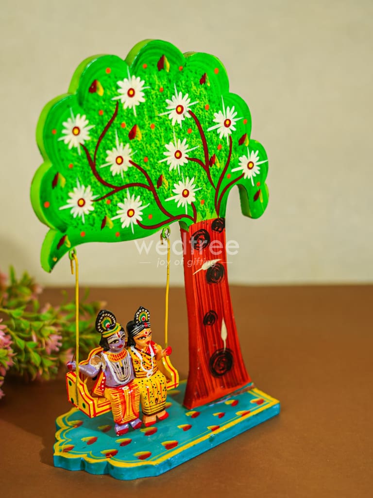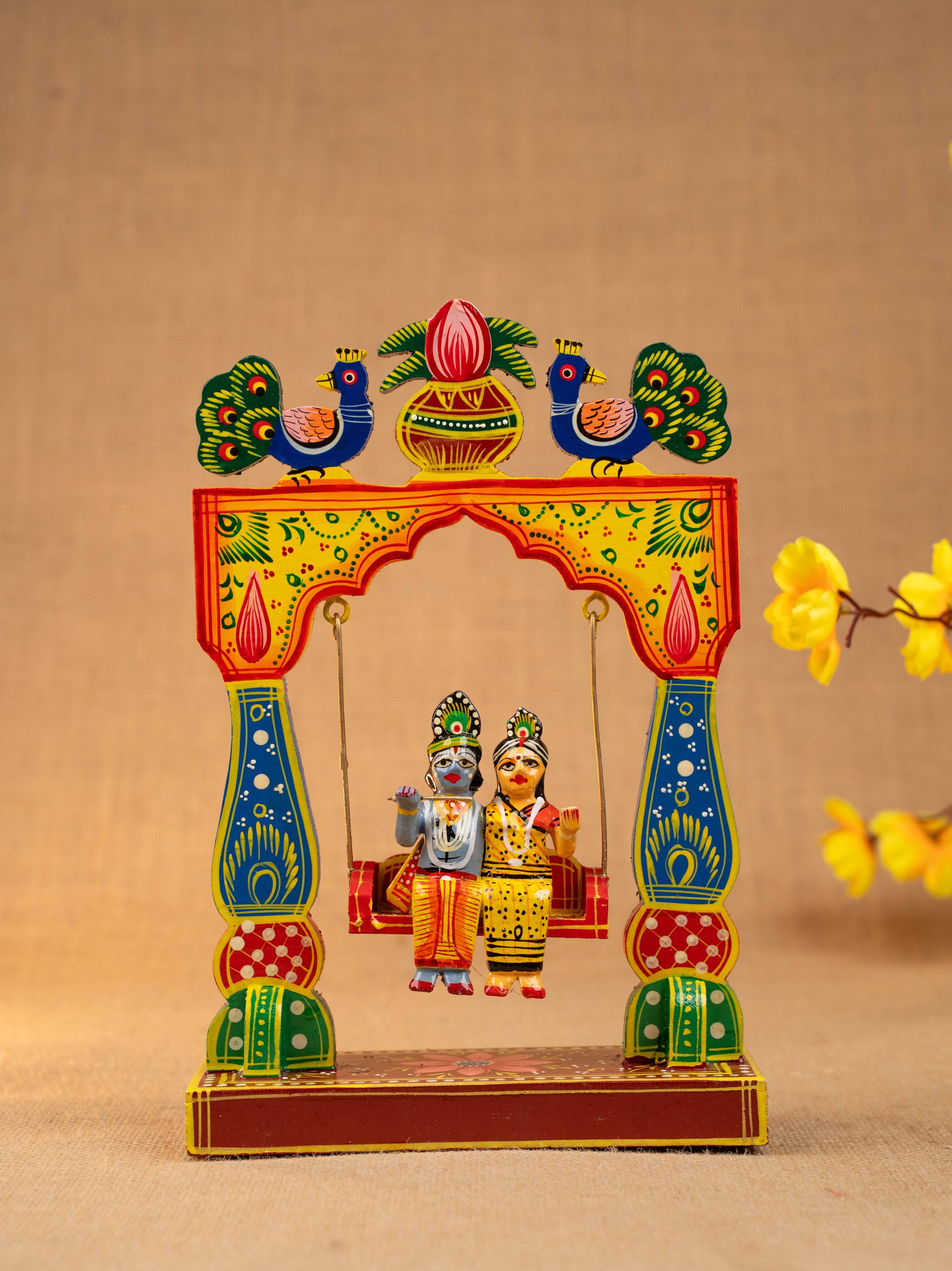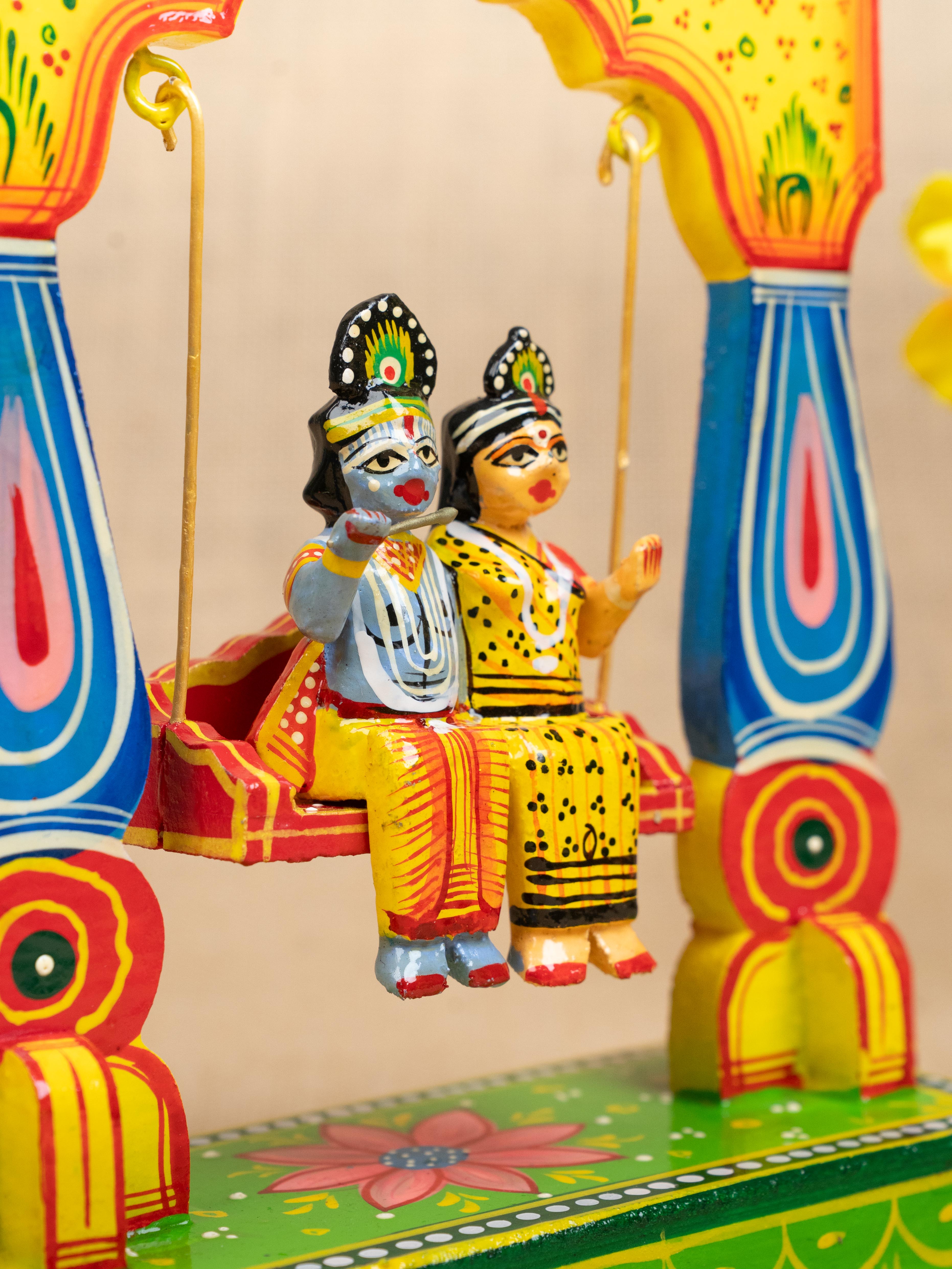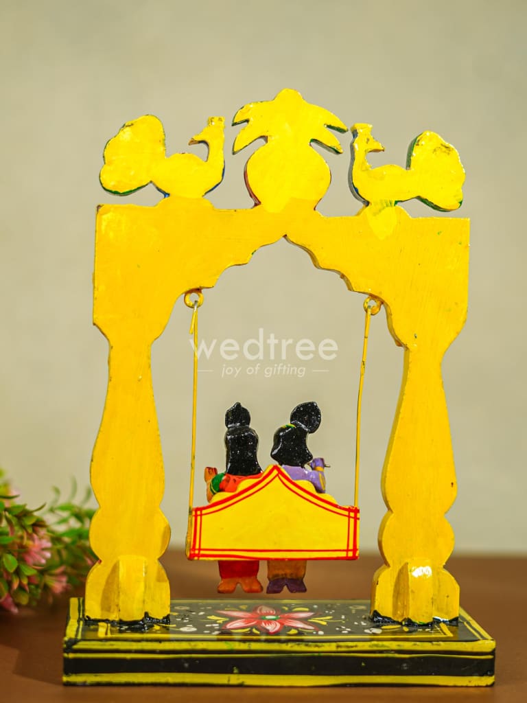 - It features Krishna & Radha beautifully swinging on Jhula and comes in 3 different designs - Tree, Peacock Feather and Peacock Mandap design.