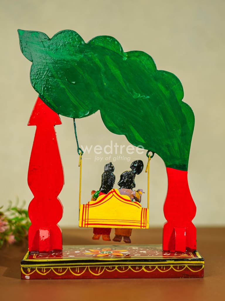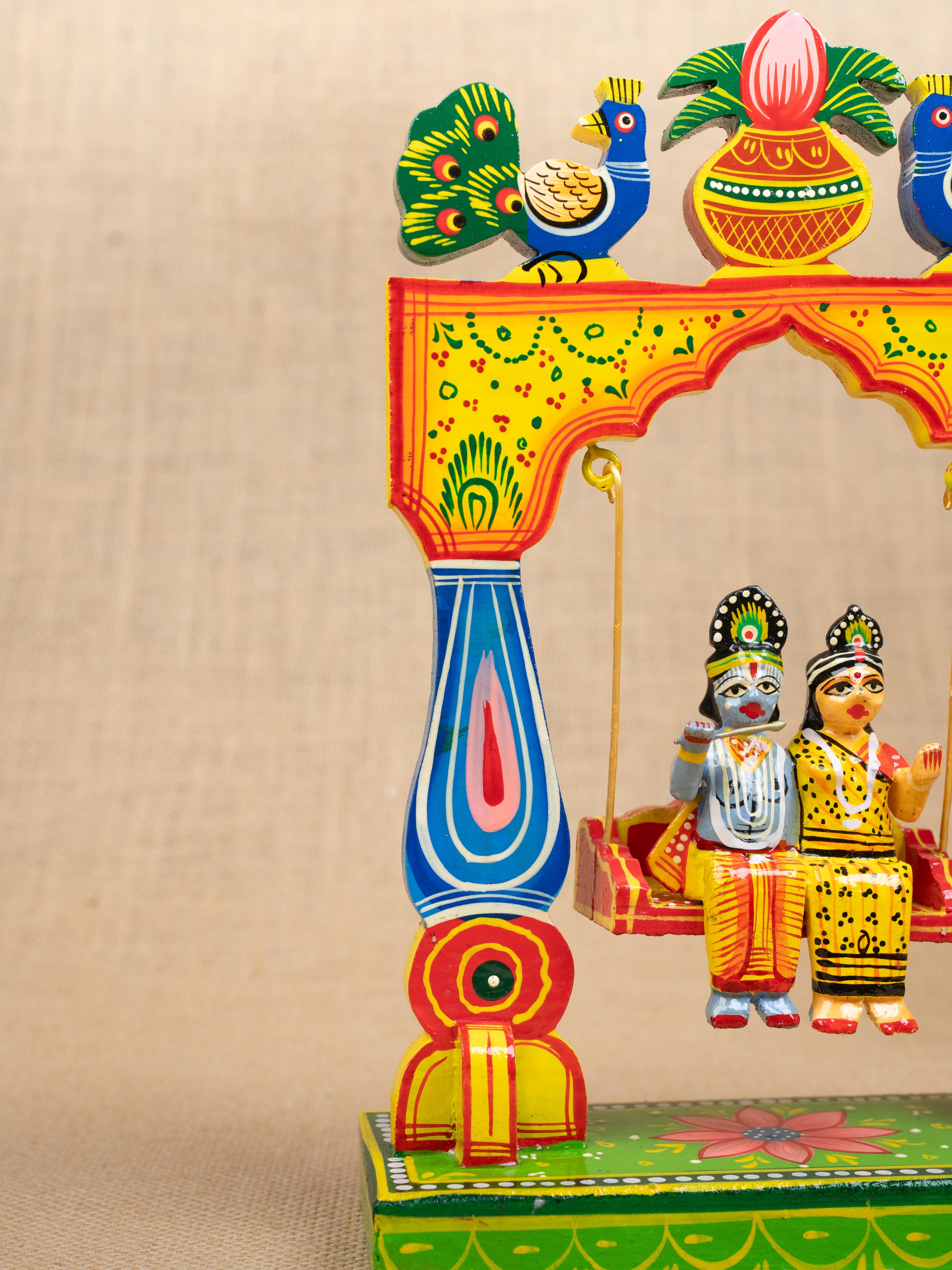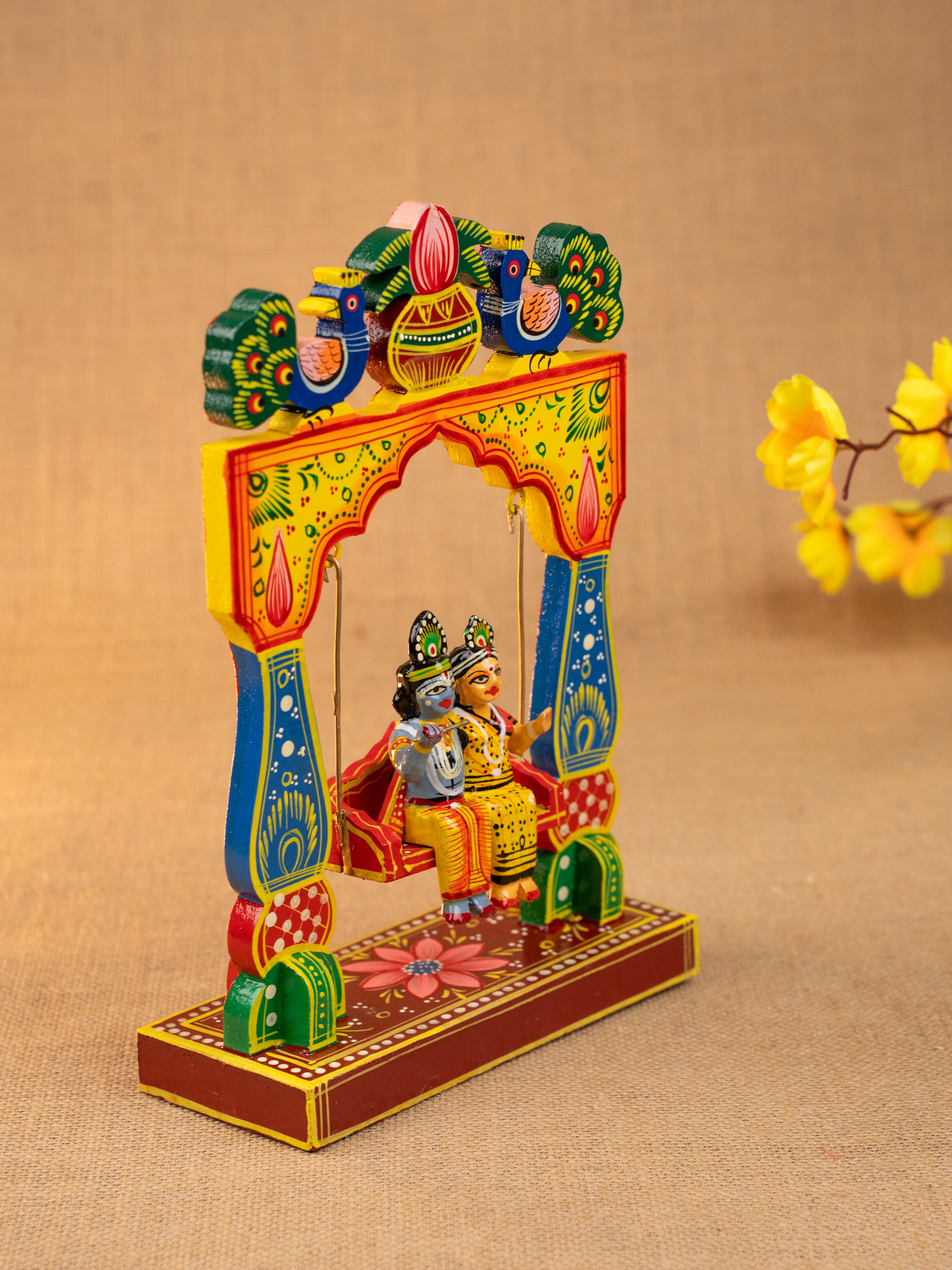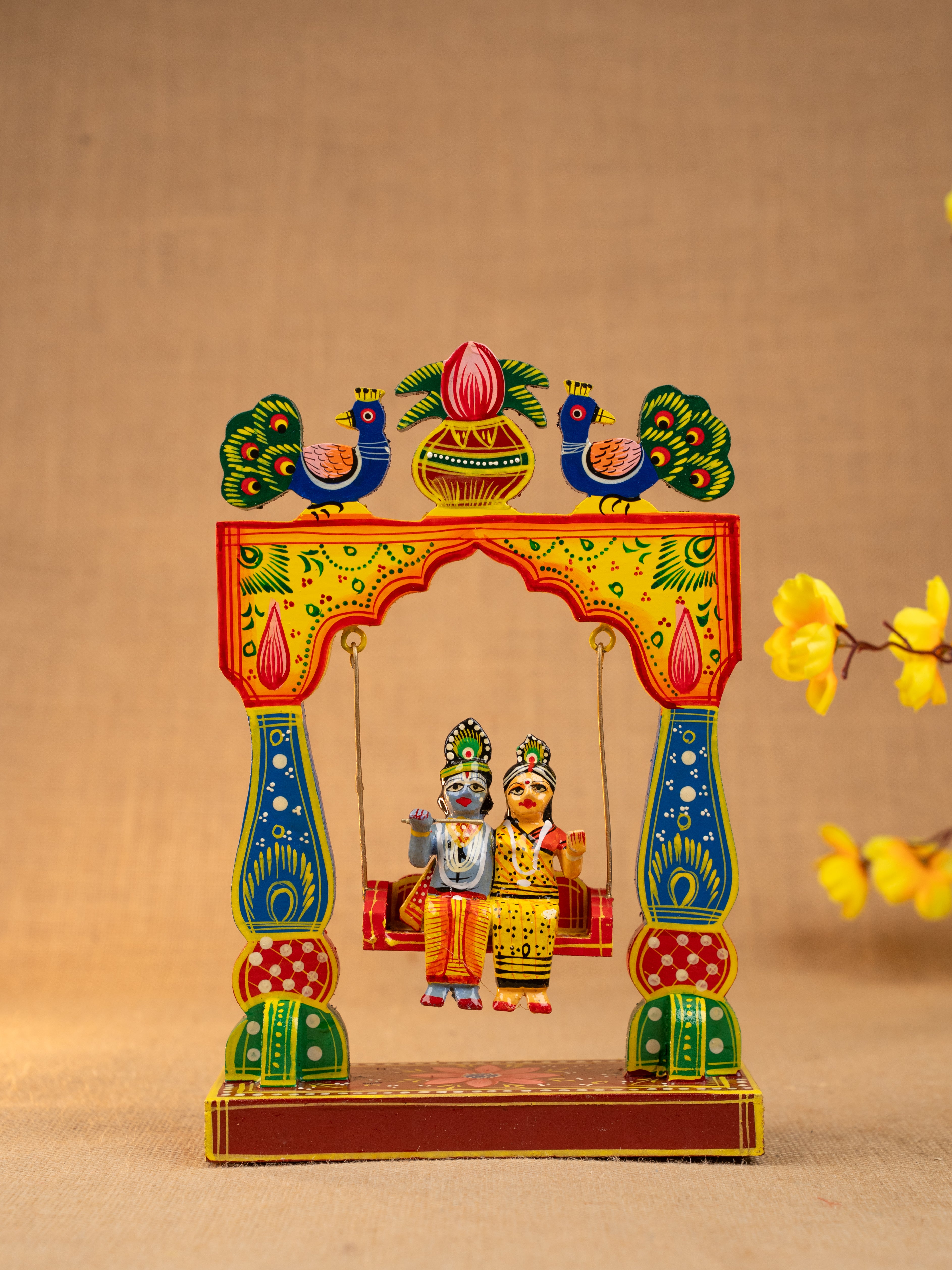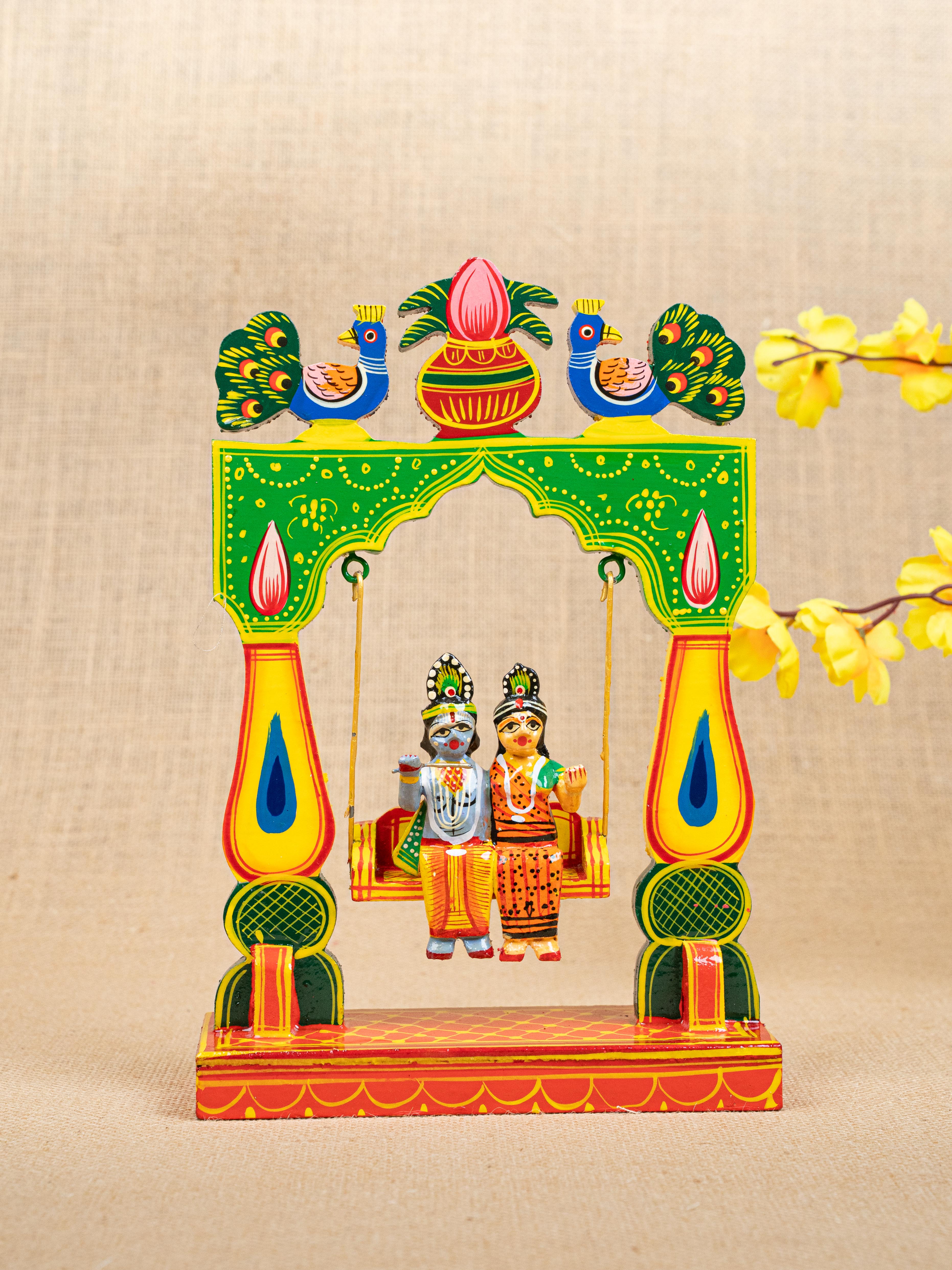 - It features Krishna & Radha beautifully swinging on Jhula and comes in 3 different designs - Tree, Peacock Feather and Peacock Mandap design.