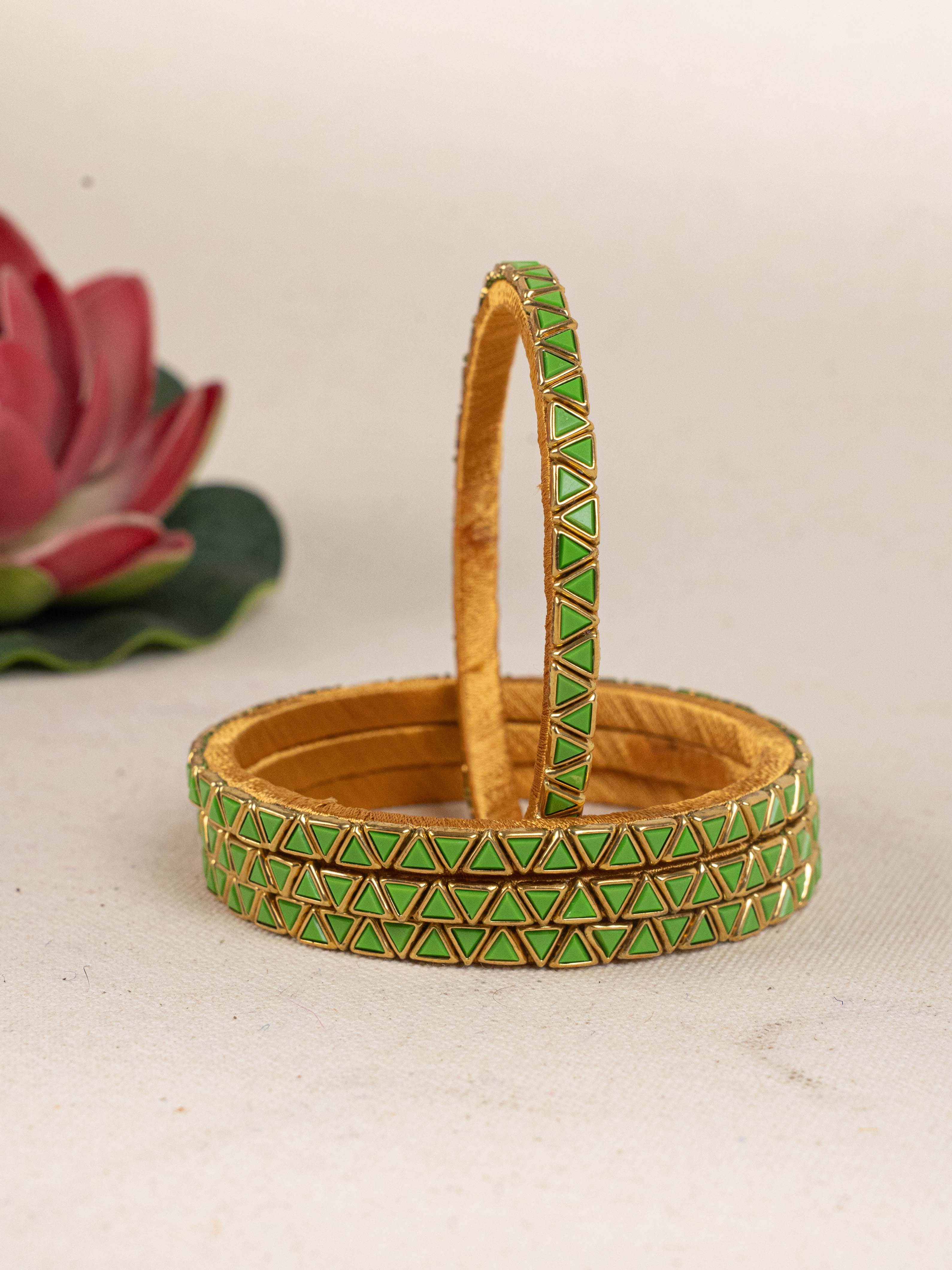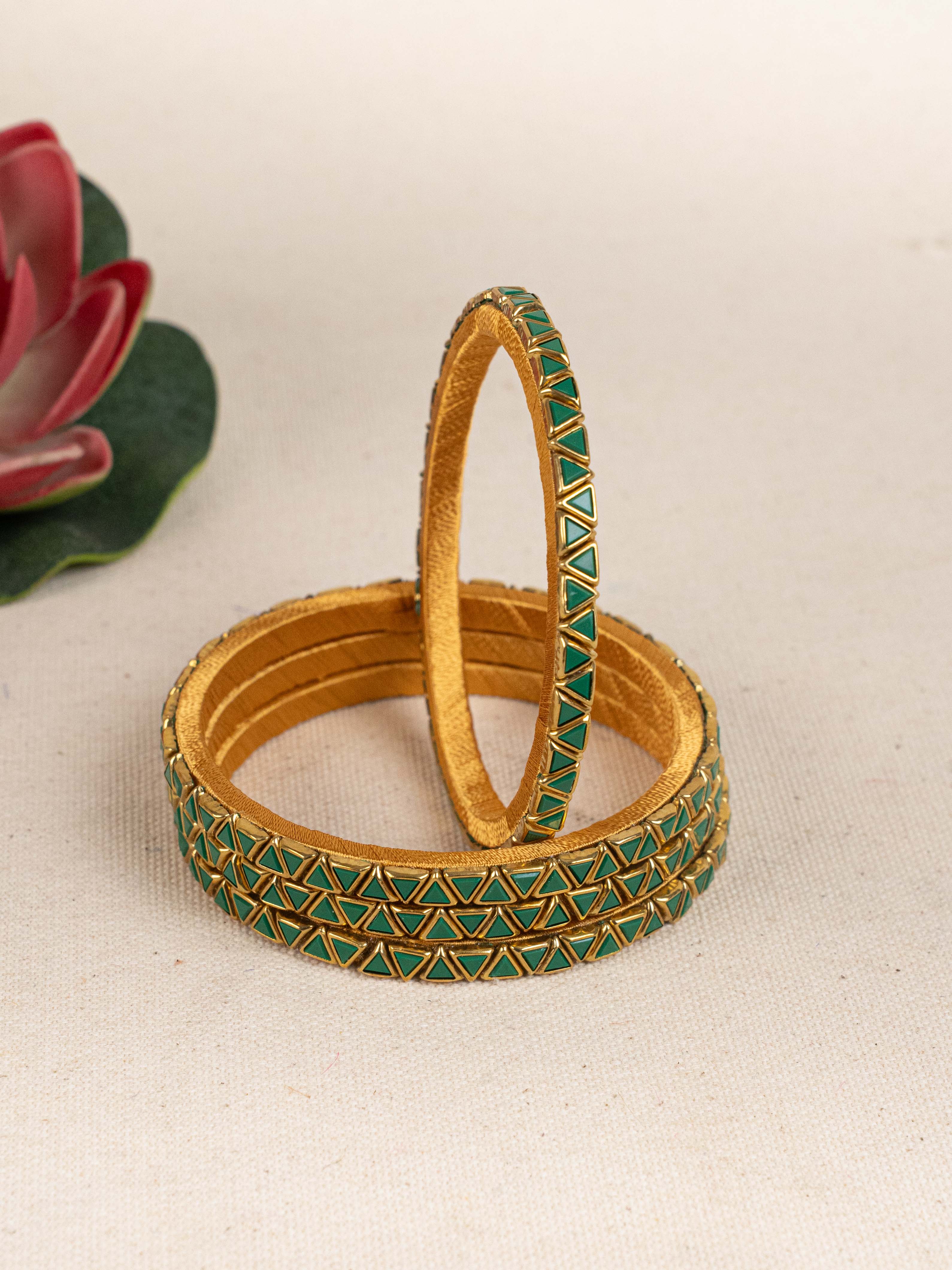 The Bangles Feature a Rich Emerald Enamel Work Embedded within a Triangular Grid Design, Giving them a Sharp and Modern Ethnic Appeal.