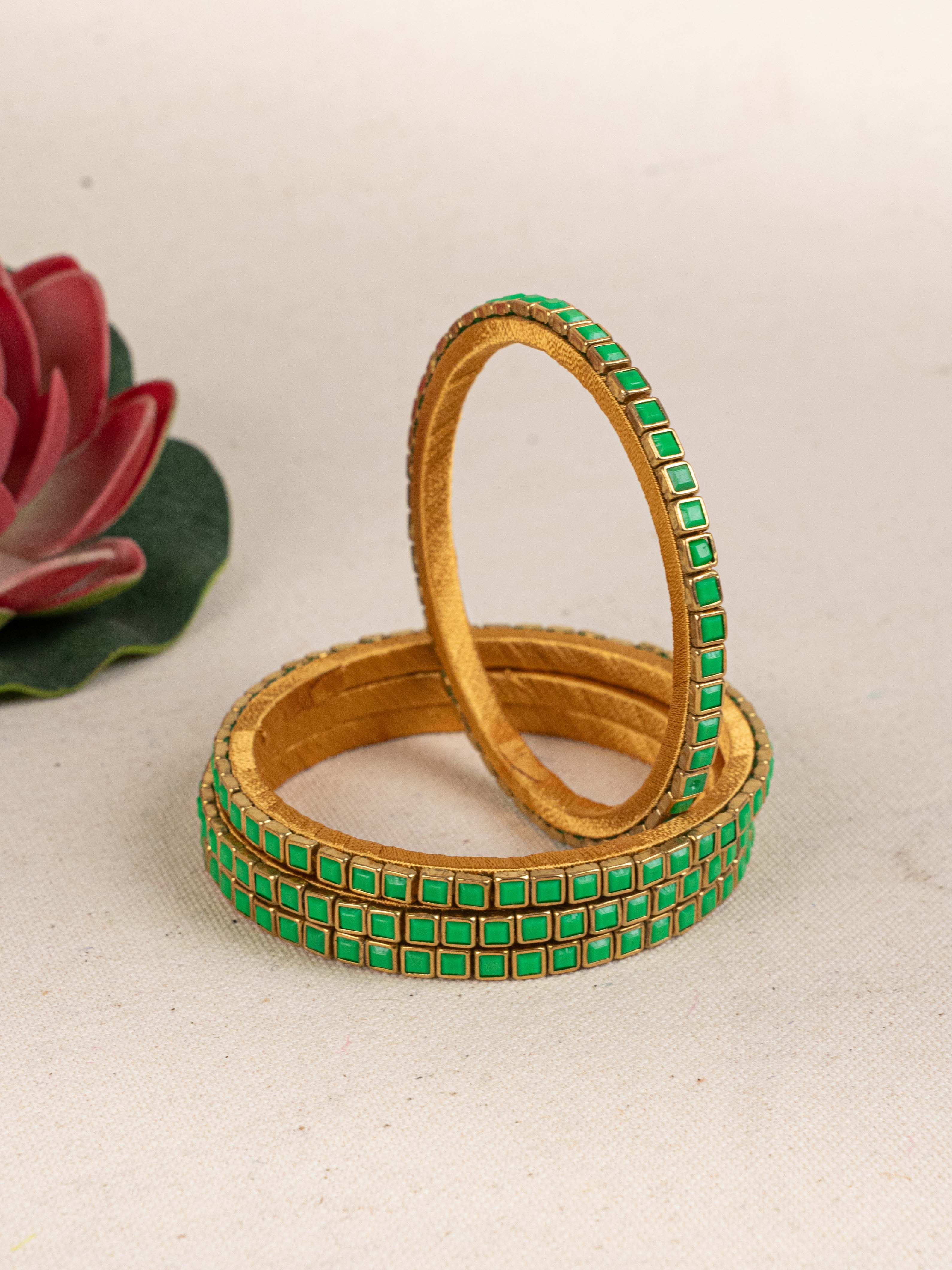 The Bangles Feature a Rich Emerald Enamel Work Embedded within a Rectangular Grid Design, Giving them a Sharp and Modern Ethnic Appeal.