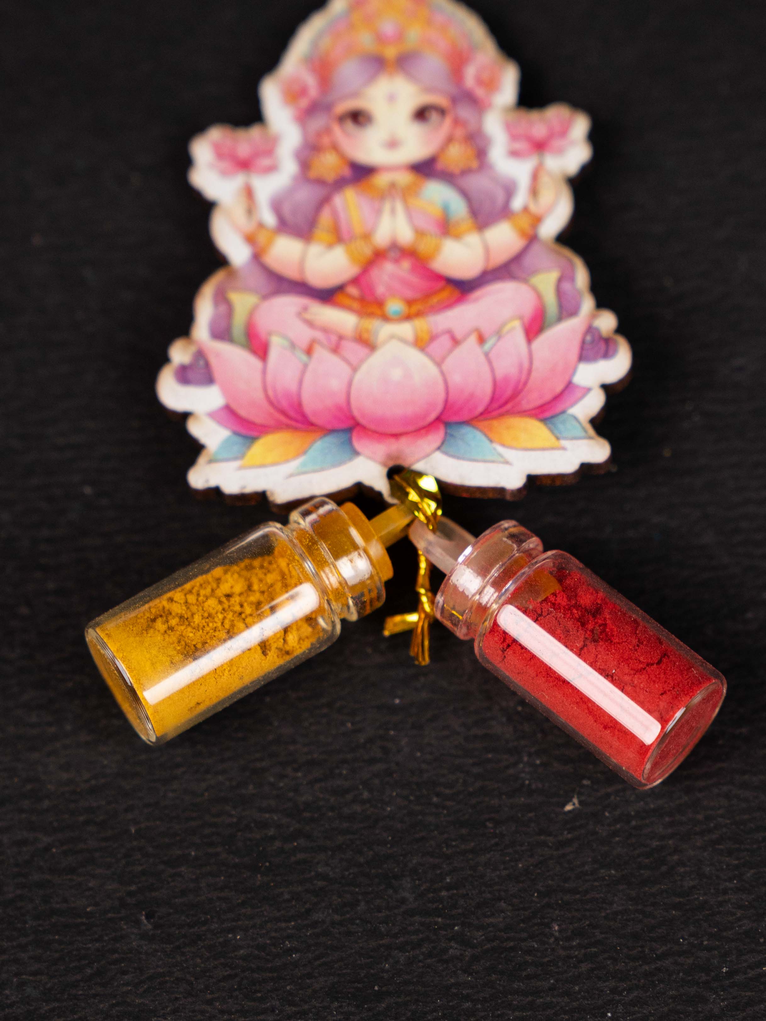 - Comes with Two Tiny Glass Vials Containing Kumkum (red powder) and Haldi (turmeric powder)