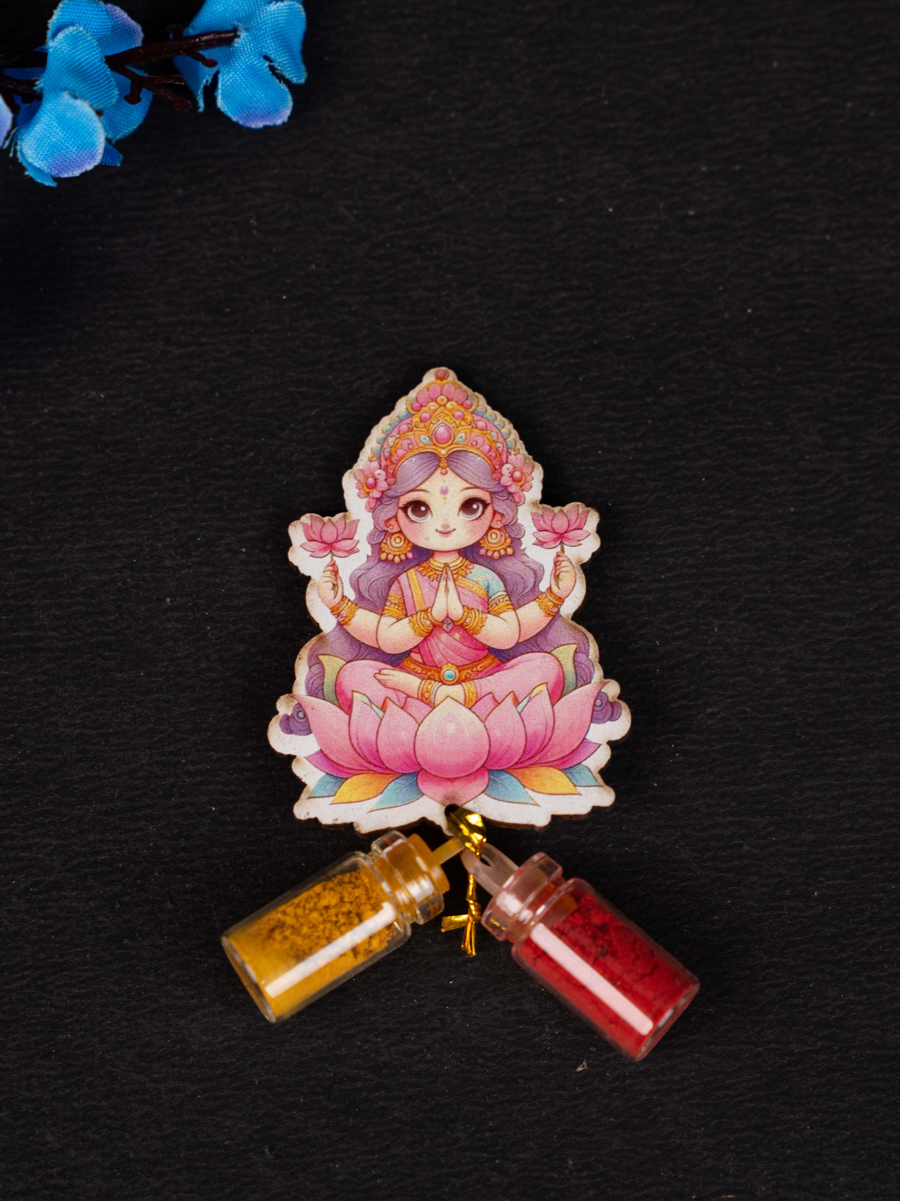 - Delightful Fridge Magnet with Haldi Kumkum featuring an Adorable, child-like depiction of Goddess Lakshmi.