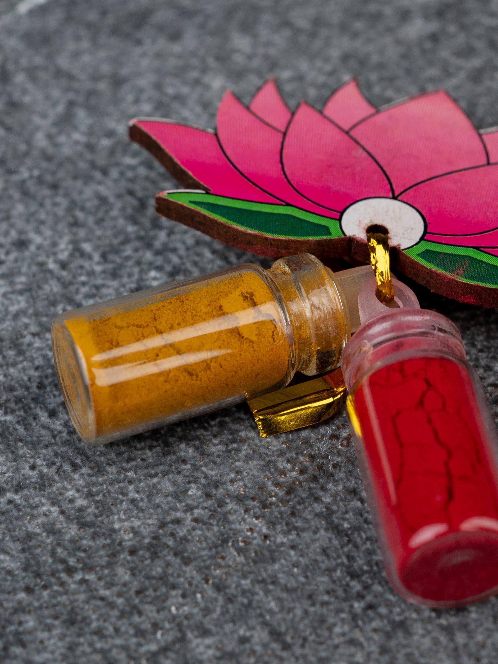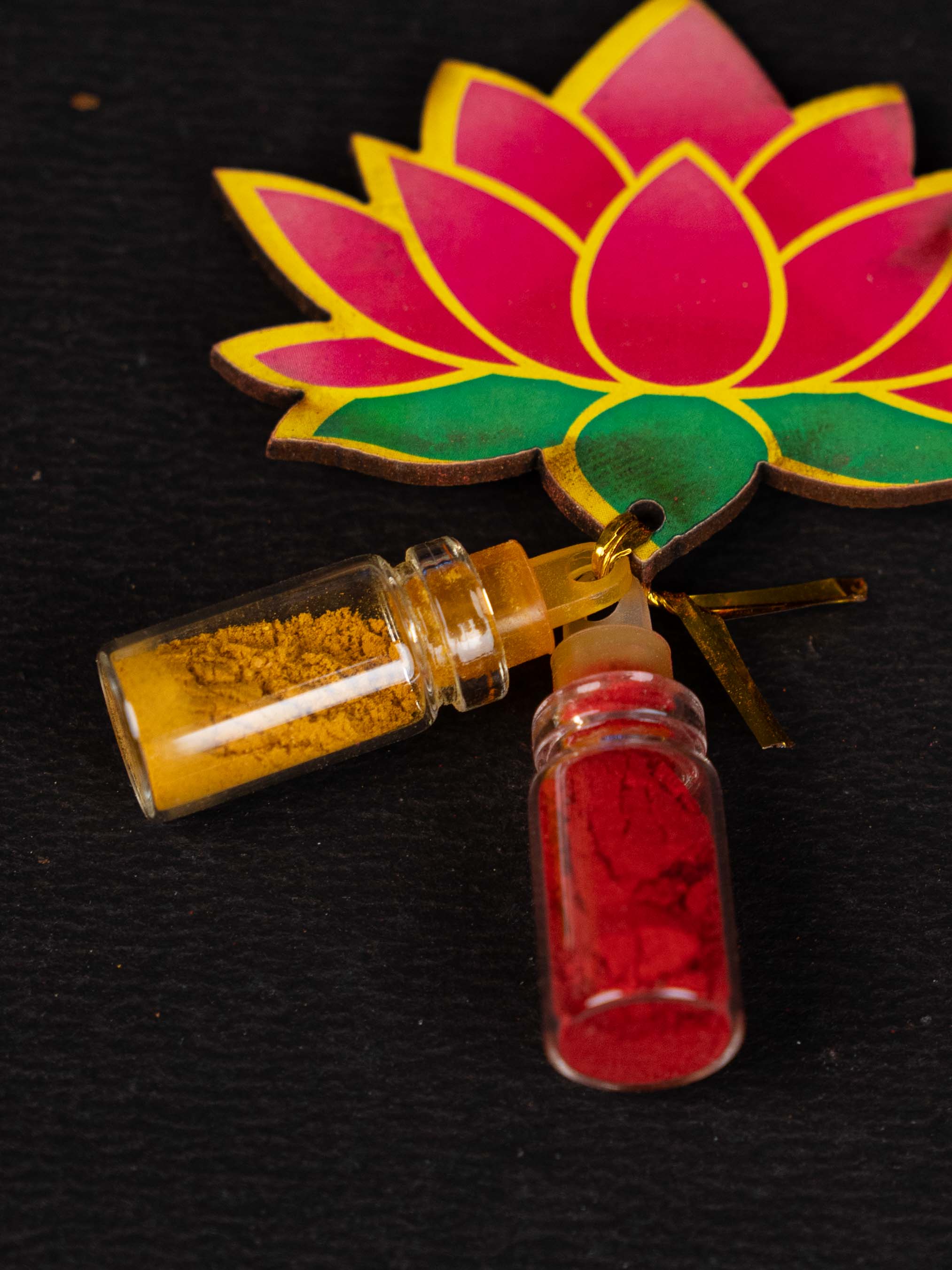 - Magnet is Attached at the back and Two Tiny Glass Vials Containing Kumkum (red powder) and Haldi (turmeric powder)