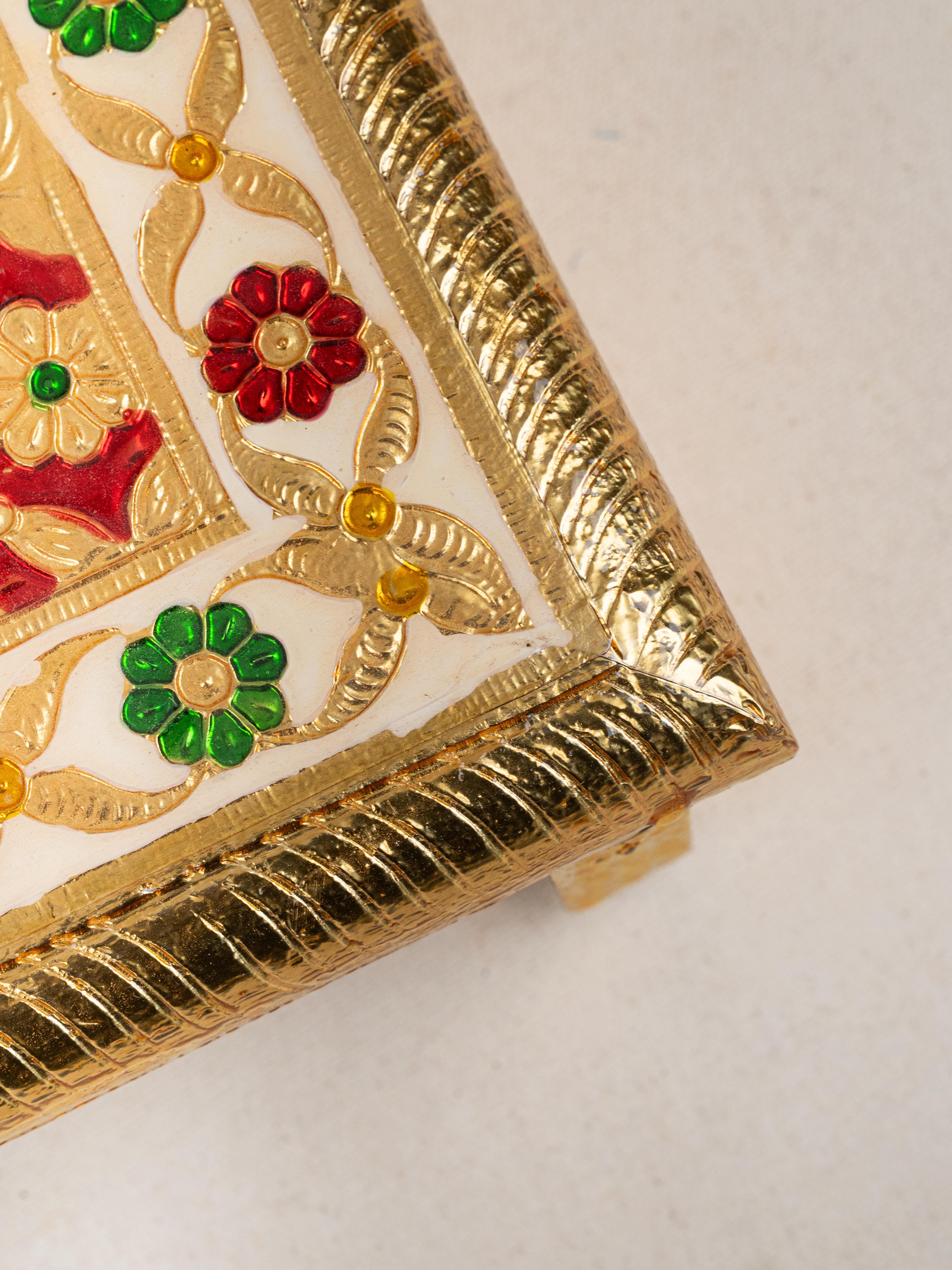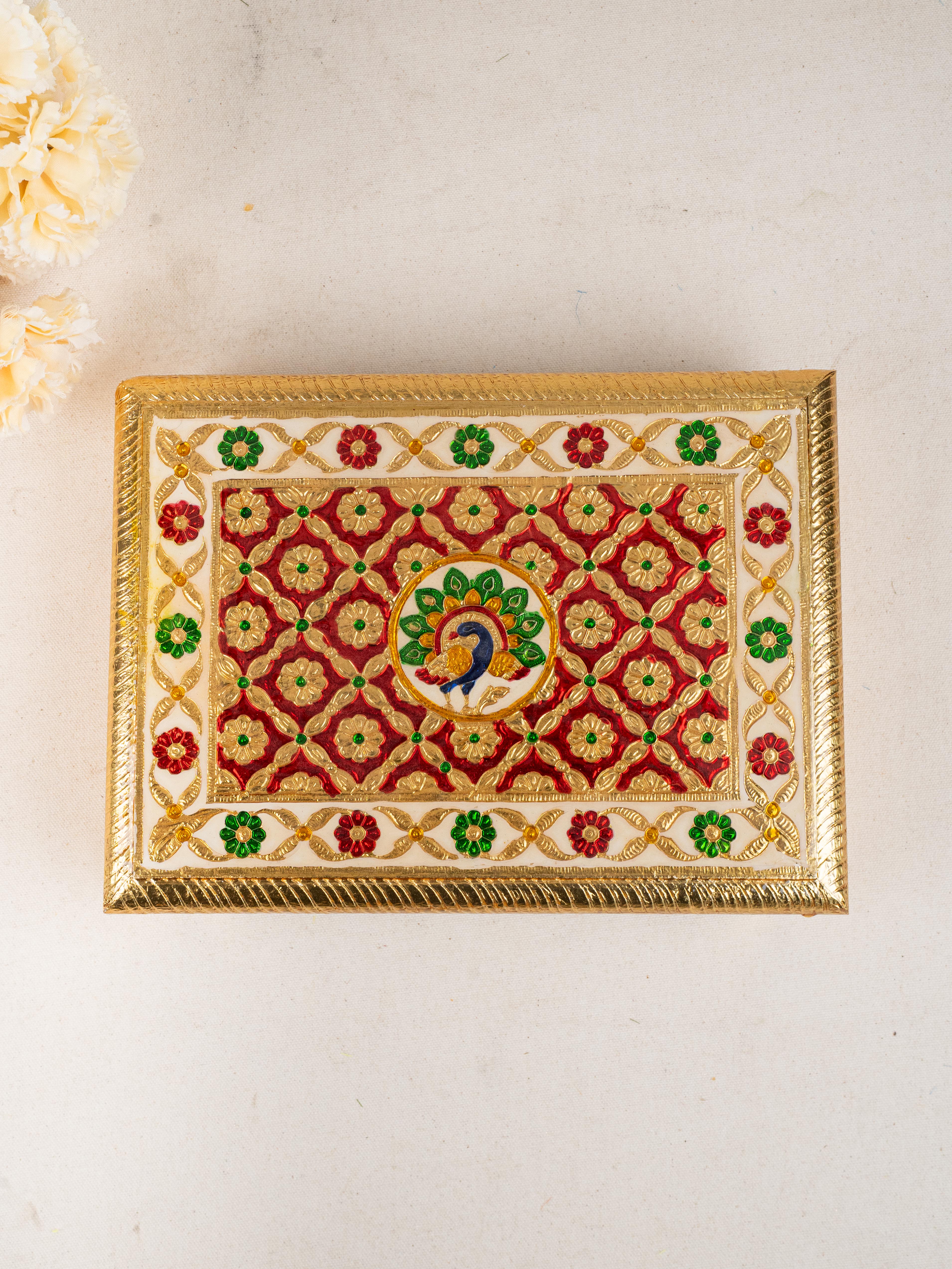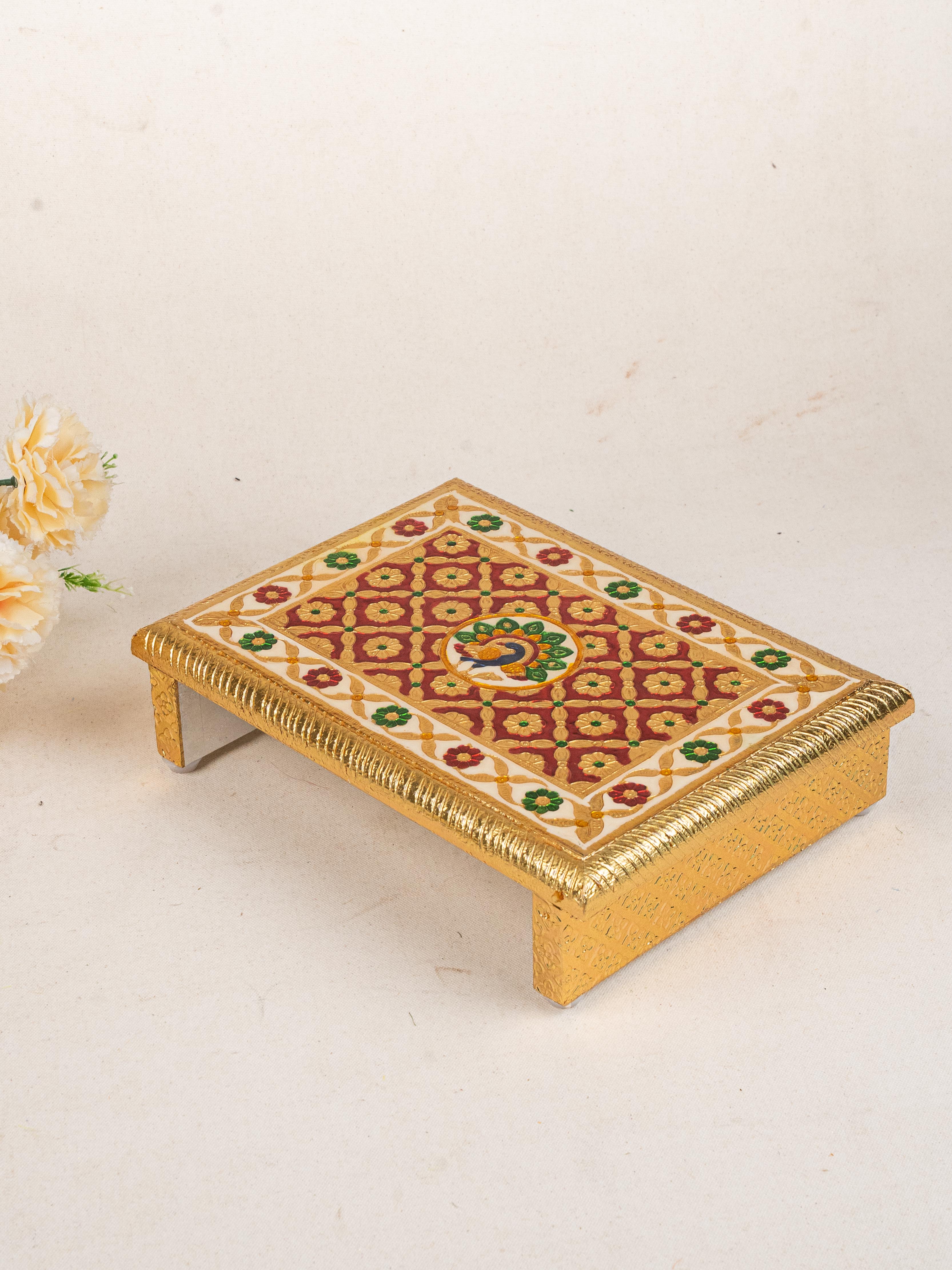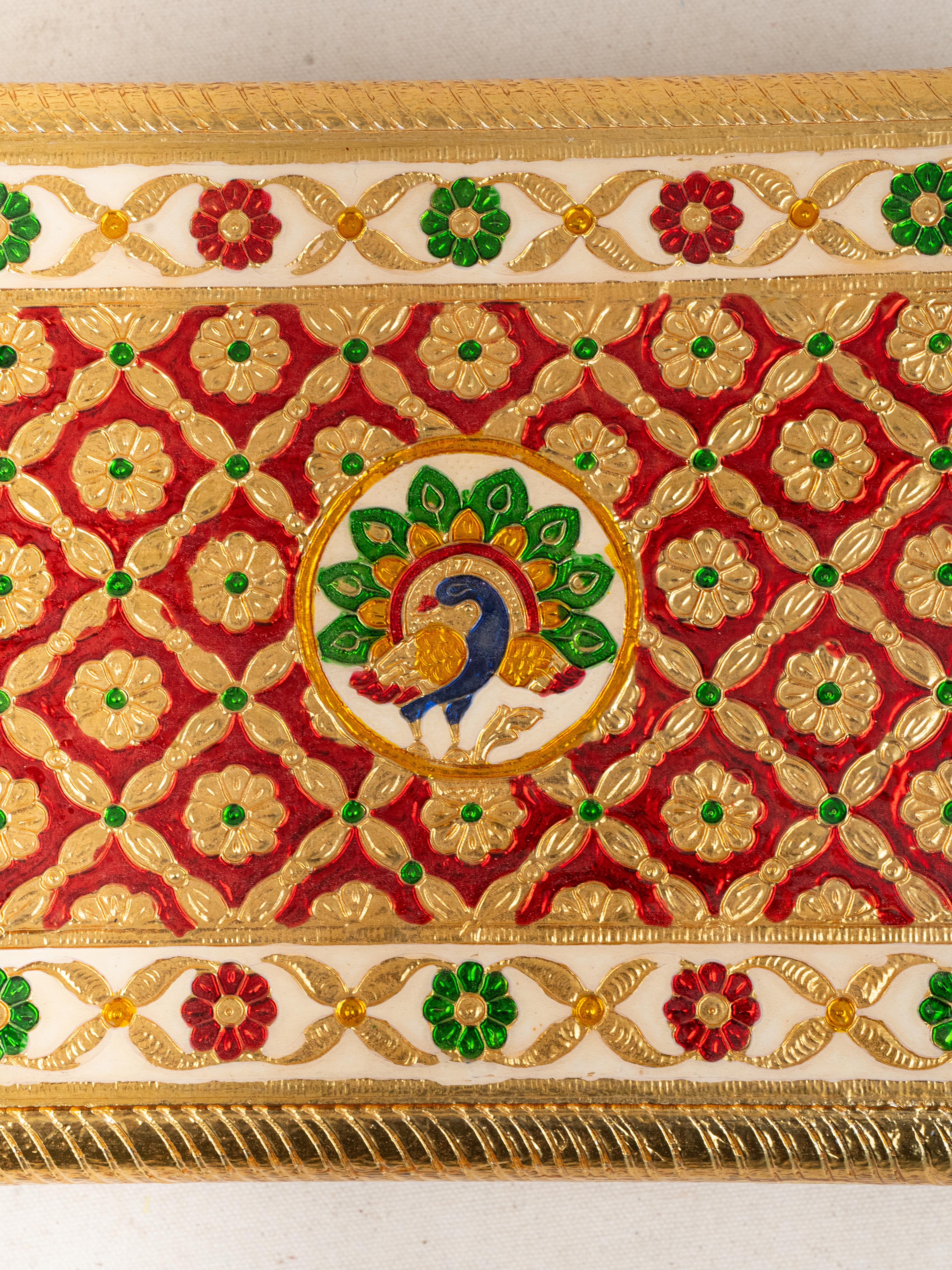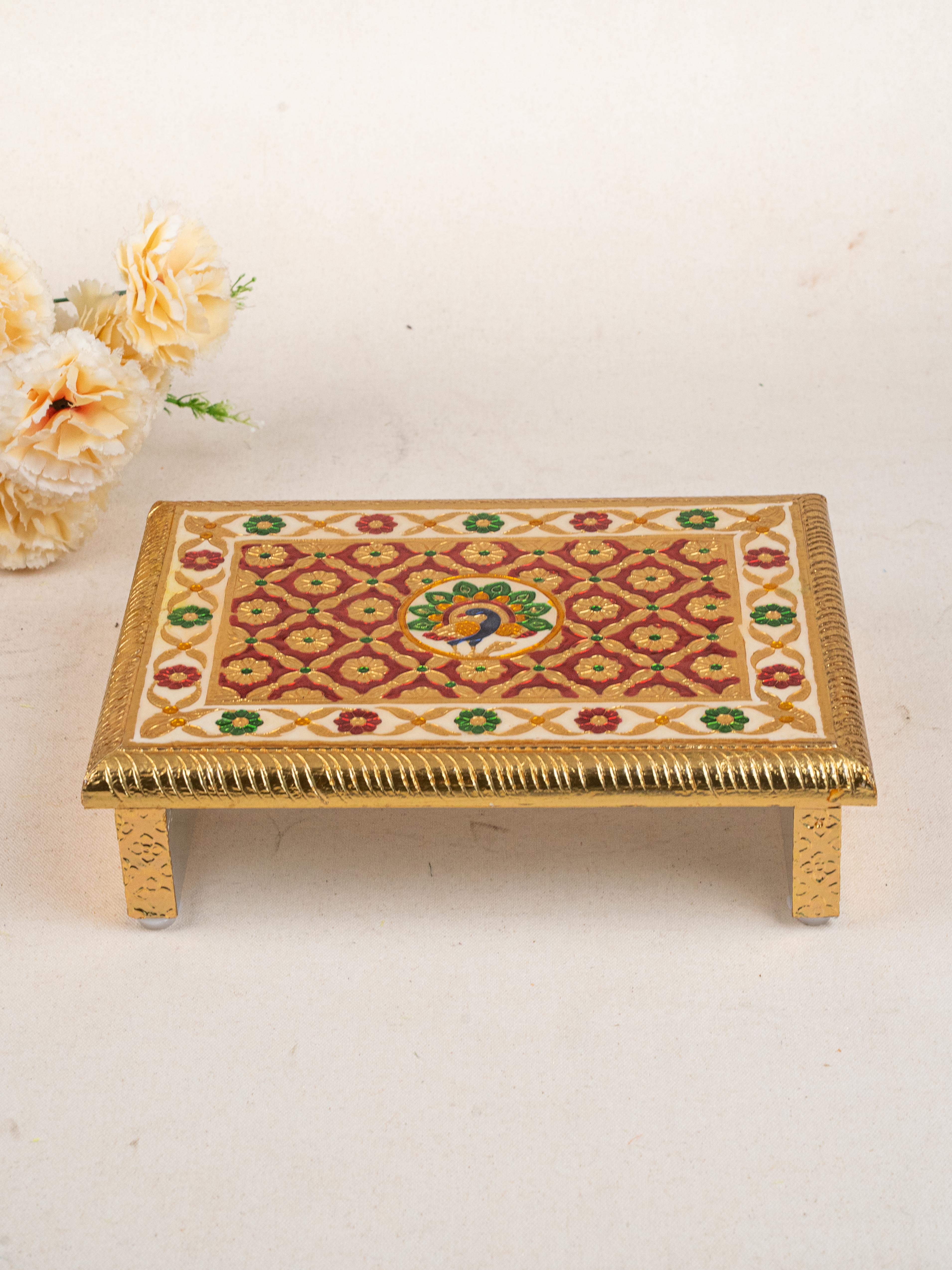 - This Beautifully Handcrafted Meenakari Manai features a Vibrant and Majestic peacock Design on the Top Surface, showcasing the Richness of Traditional Indian Artistry.