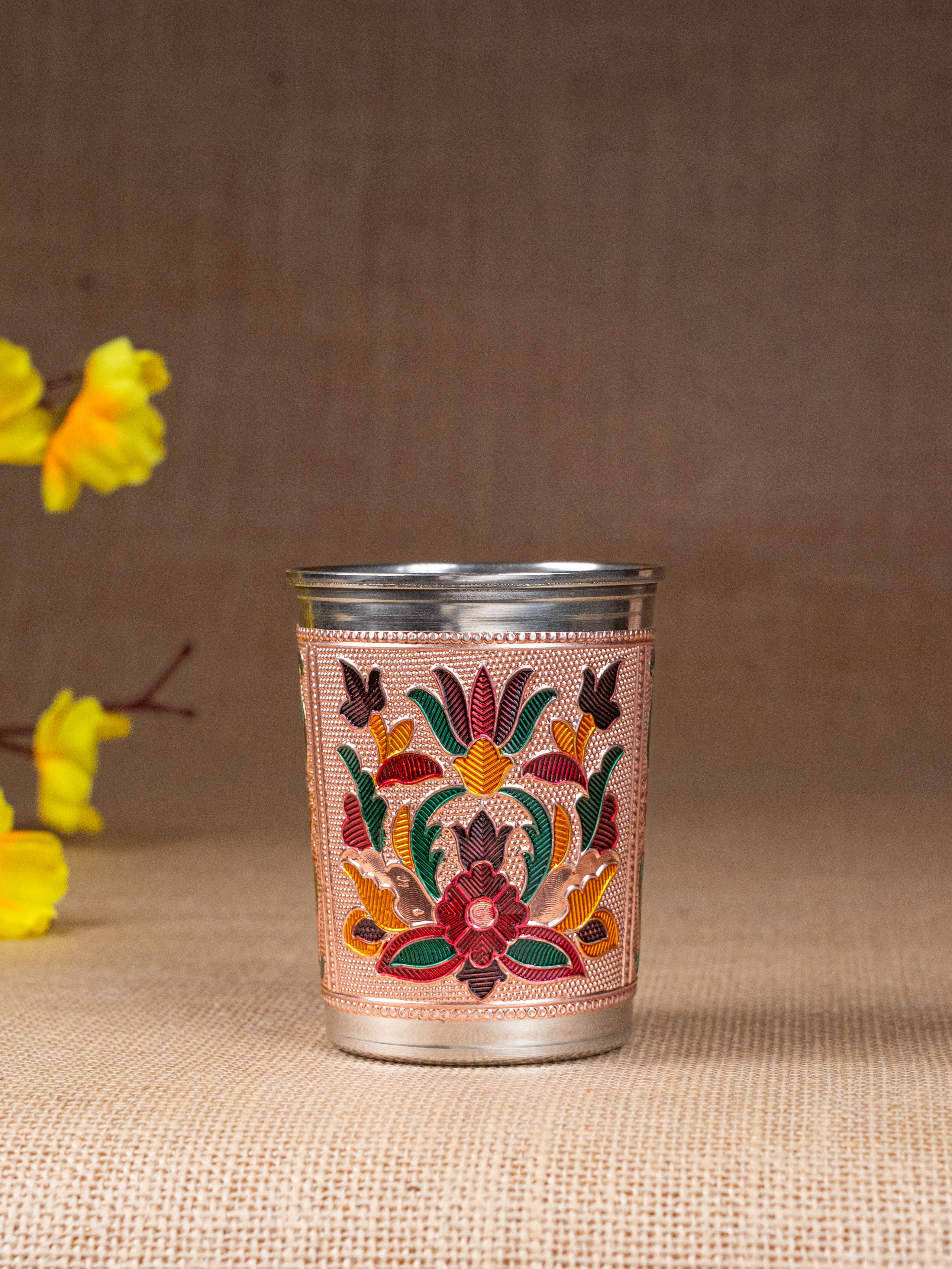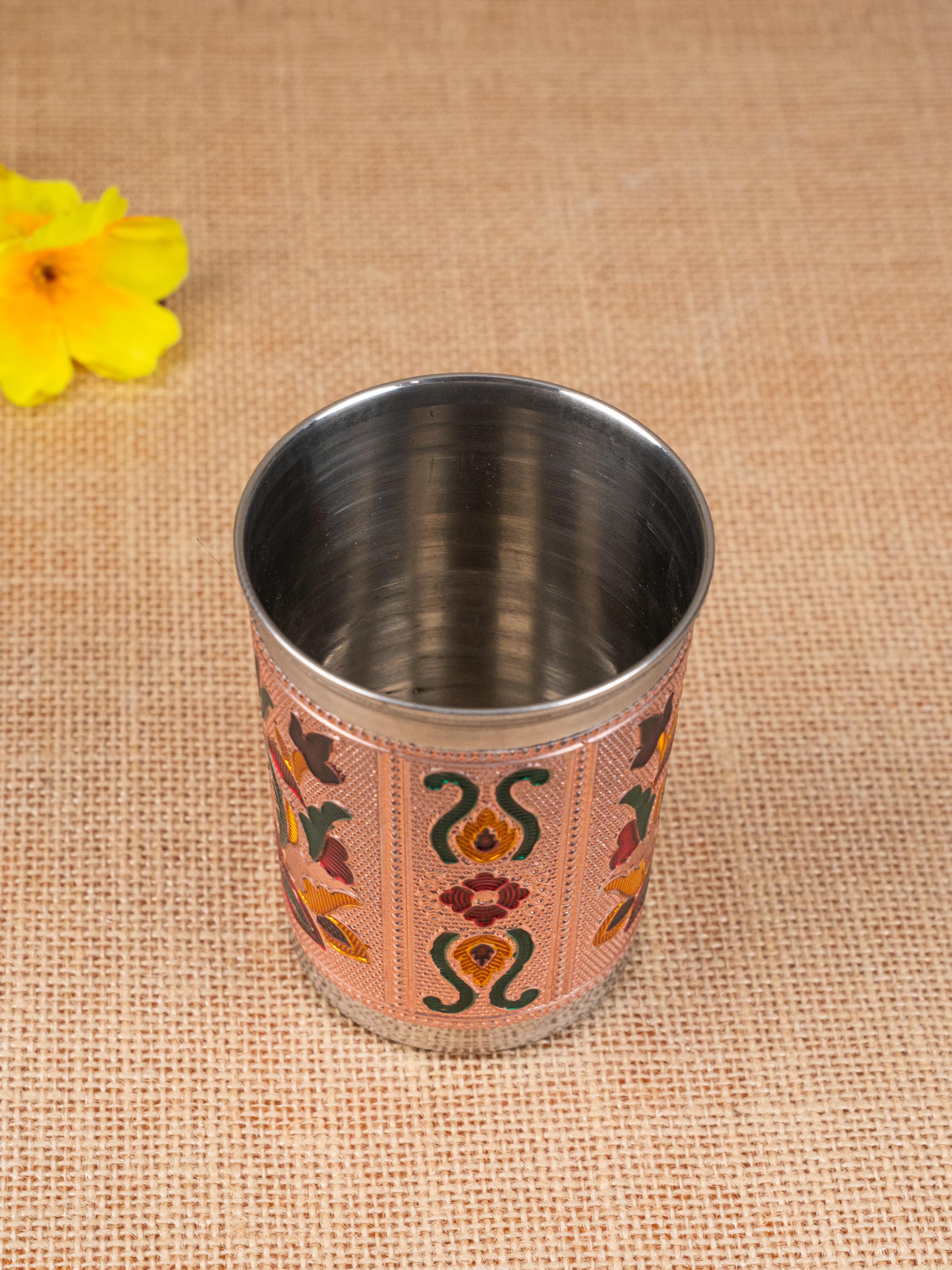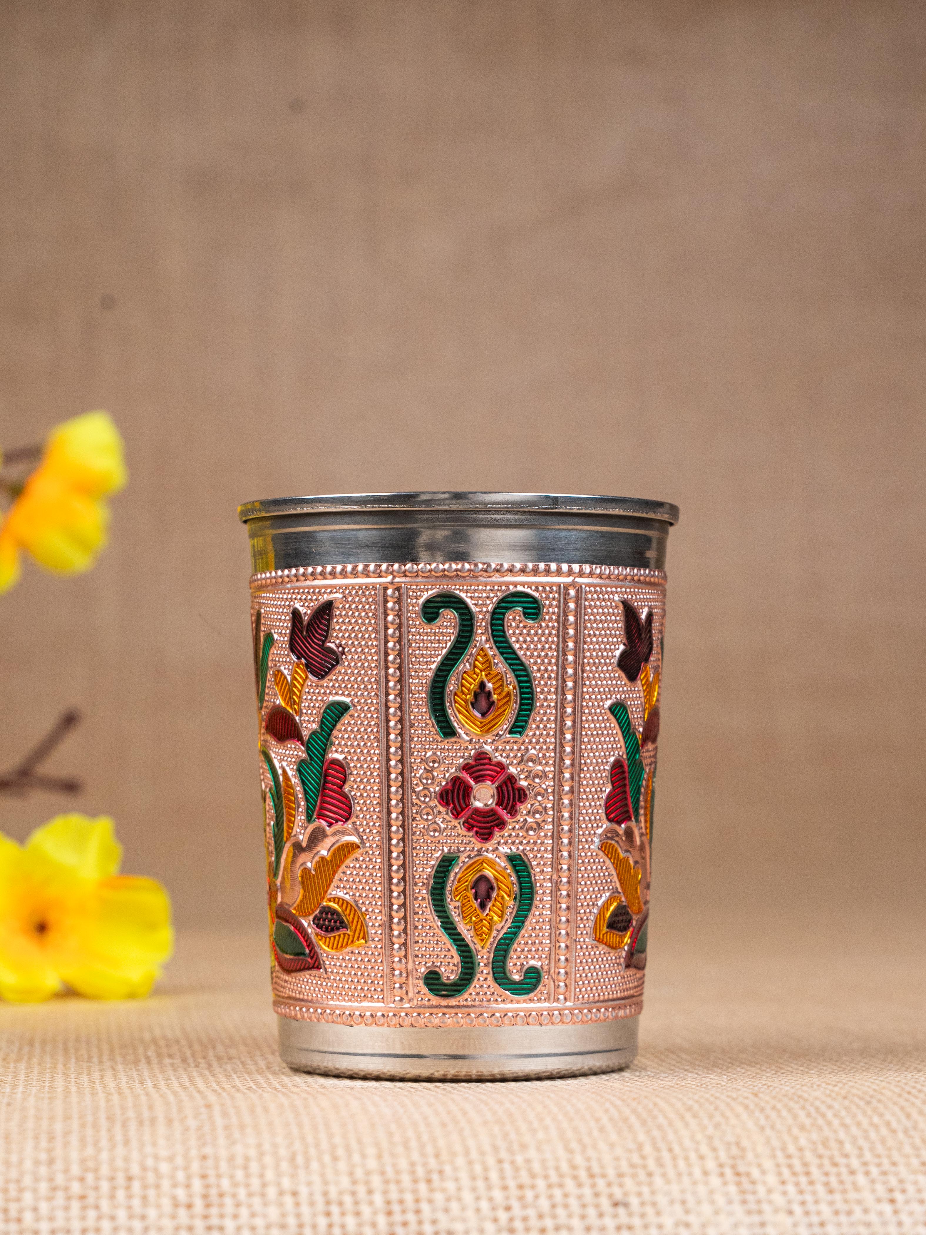 - Made of premium stainless steel, this glass is embellished with Meenakari art work foil featuring Floral Design with its widespread feathers!