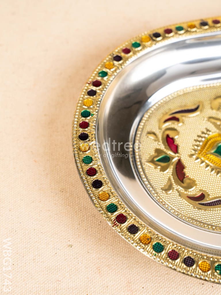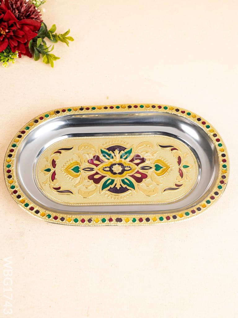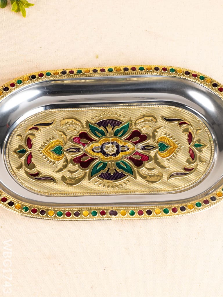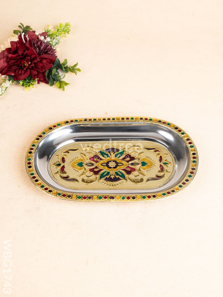 Stunning, Special Minakari Plate just for you! On a base of stainless steel, we have given a novel Metal Sheet rich in Minakari works. The deep tray has colorful works throughout. You're going to love the design and so will your guests when shared as Return Gift for Wedding, Diwali, Upanayanam or other family celebrations!