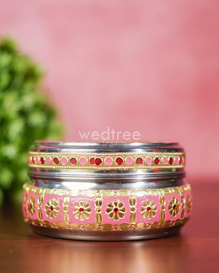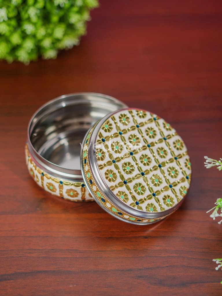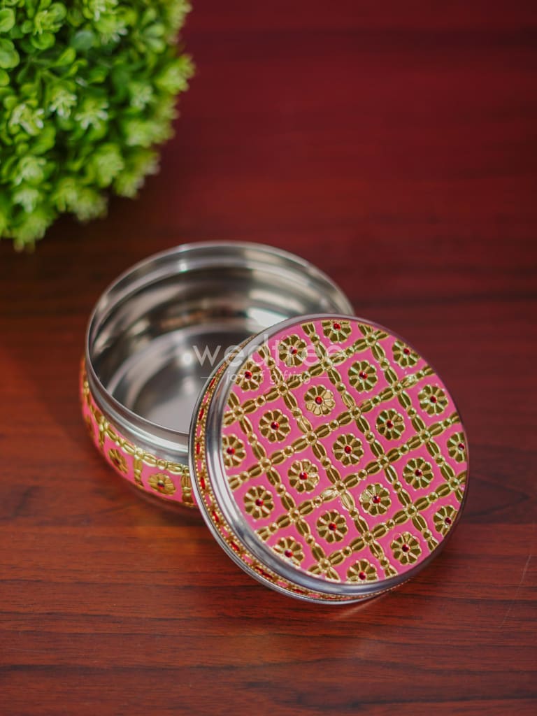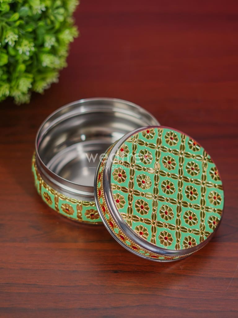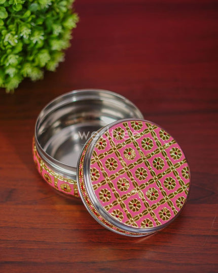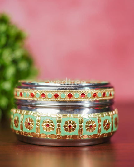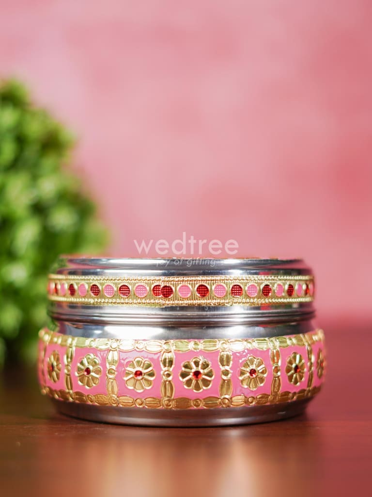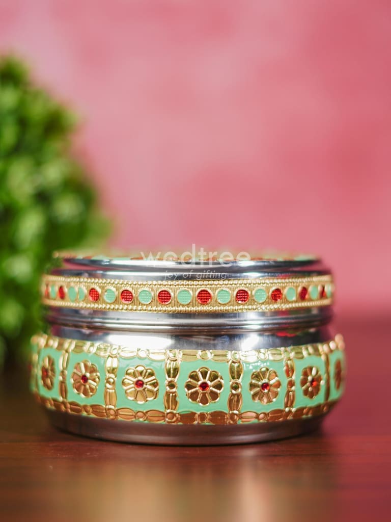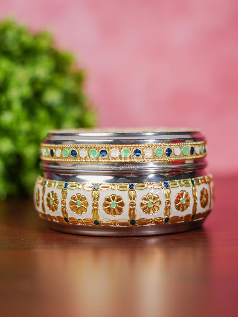 - Featured here is an adorable Poori box made of stainless steel and adorned with Meenakari artwork foil.