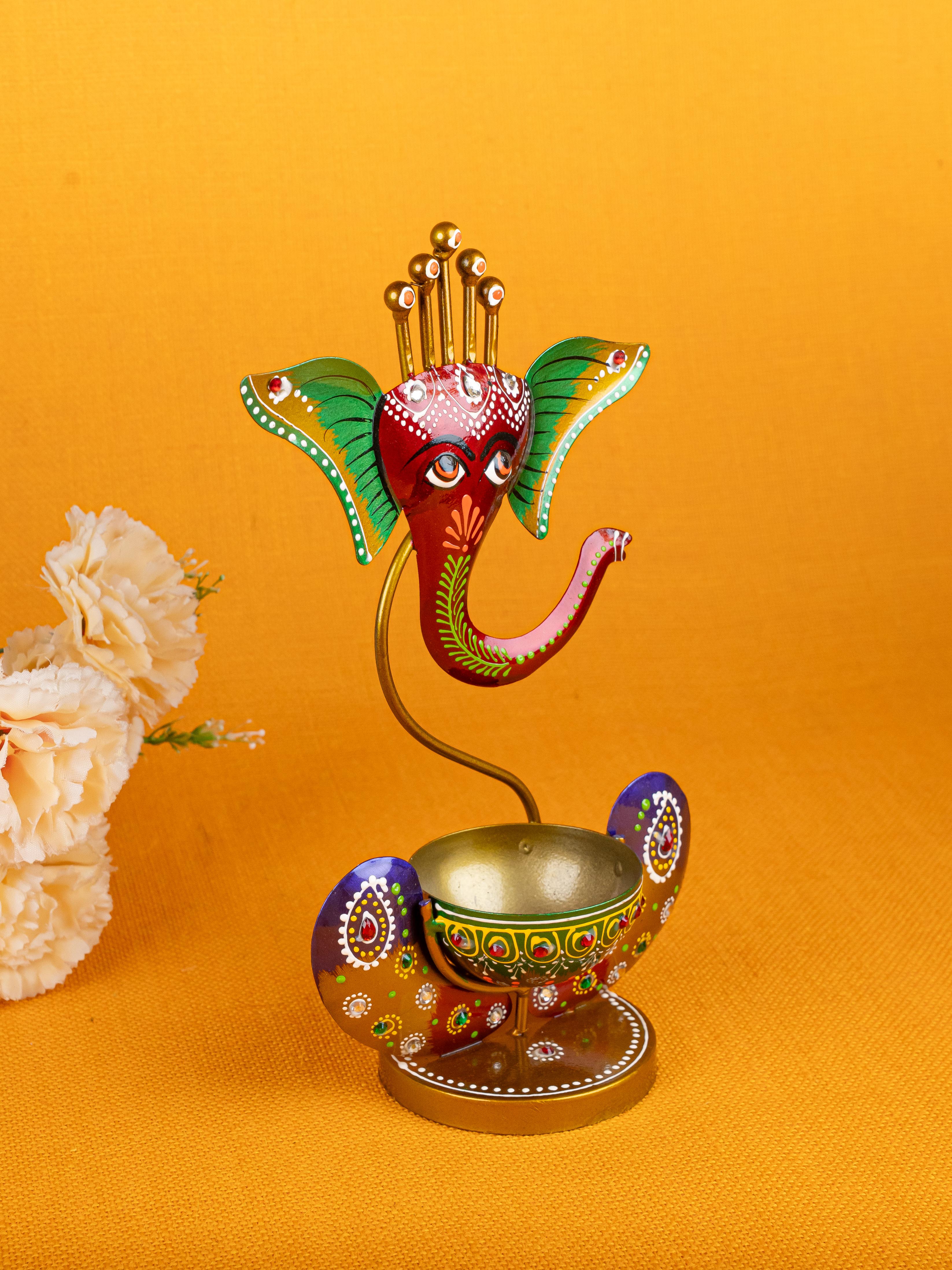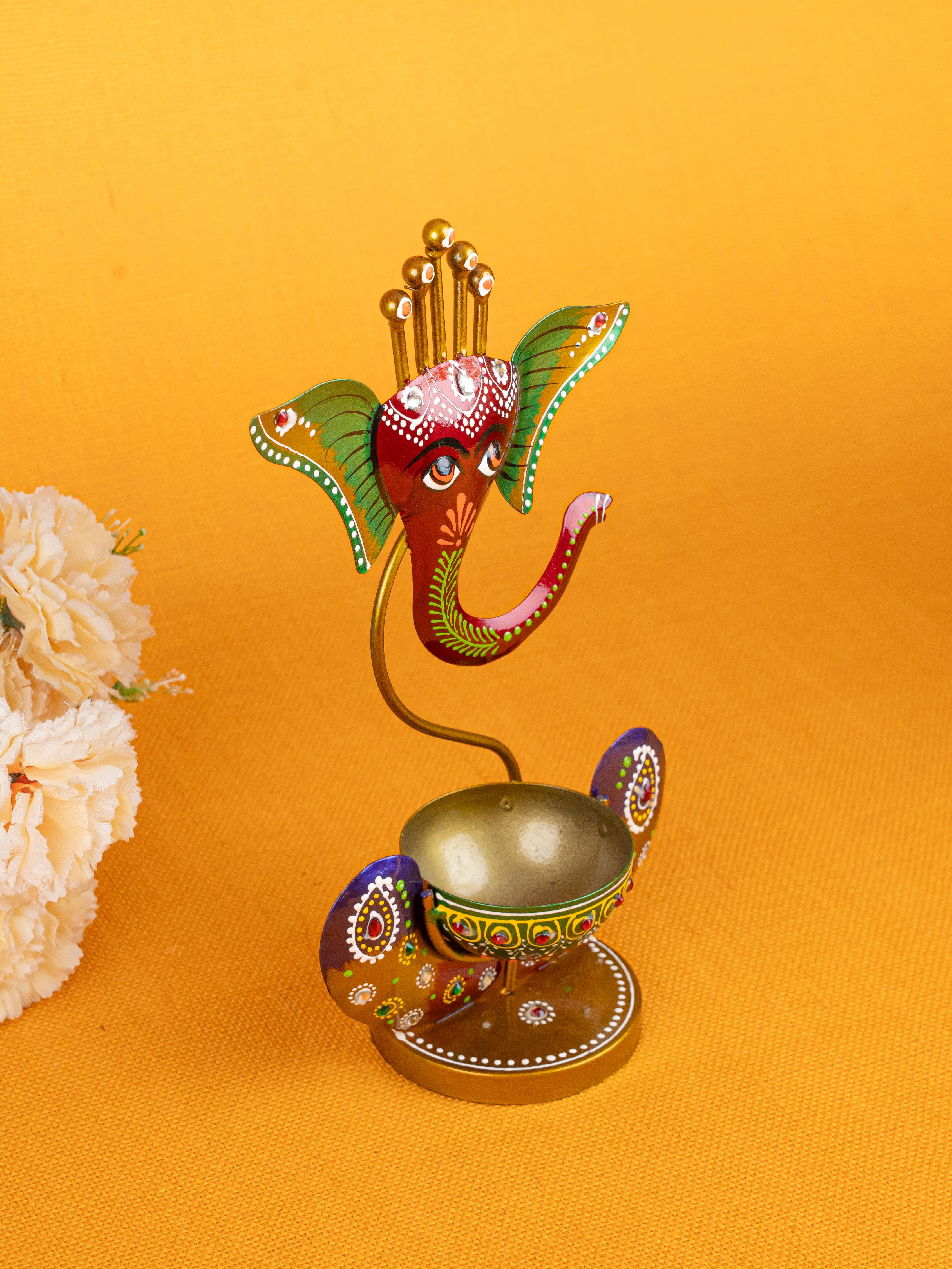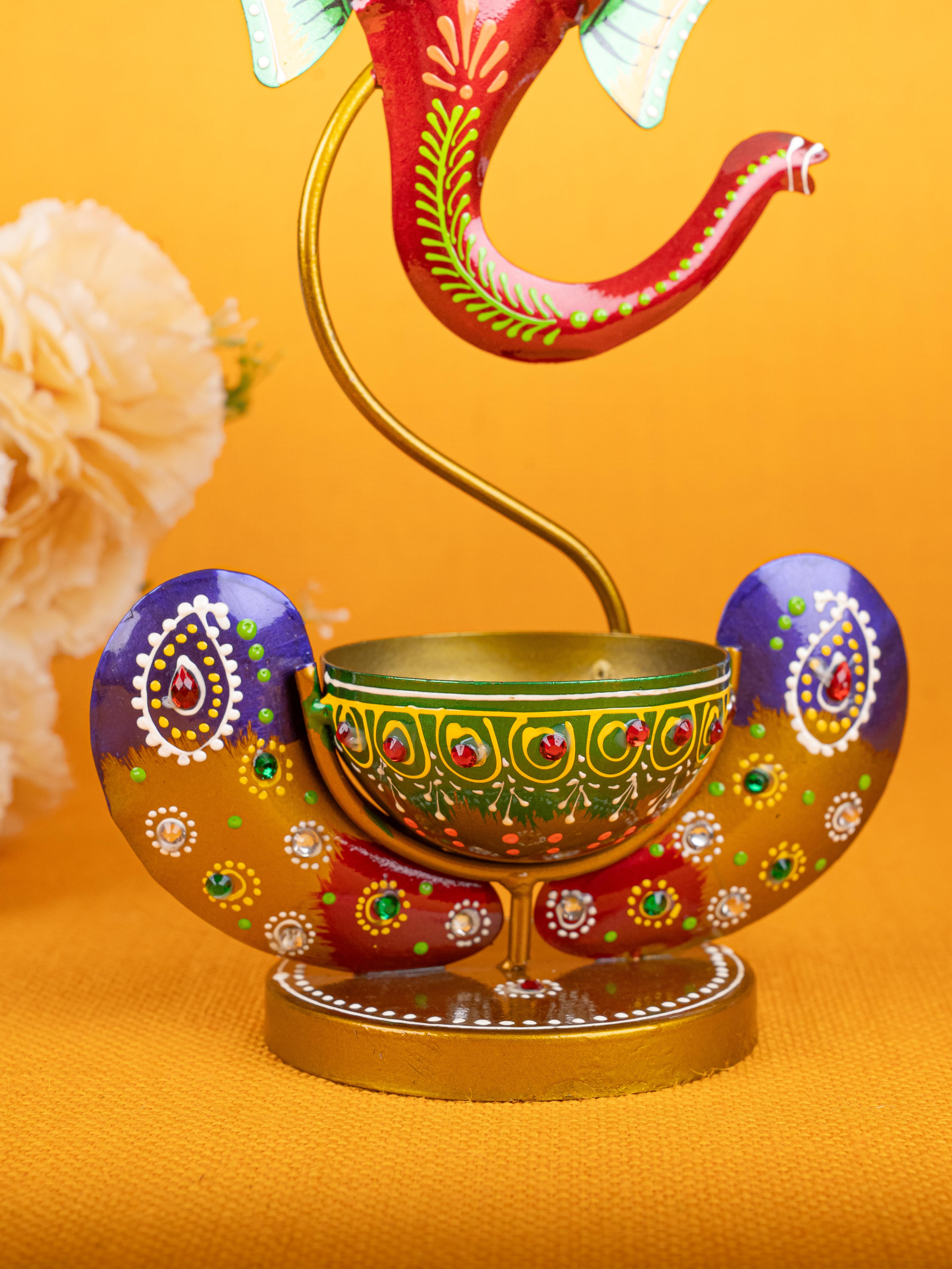 Metal Handpainted Ganesha T Light Holder - W3351-2
