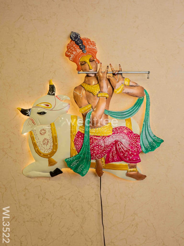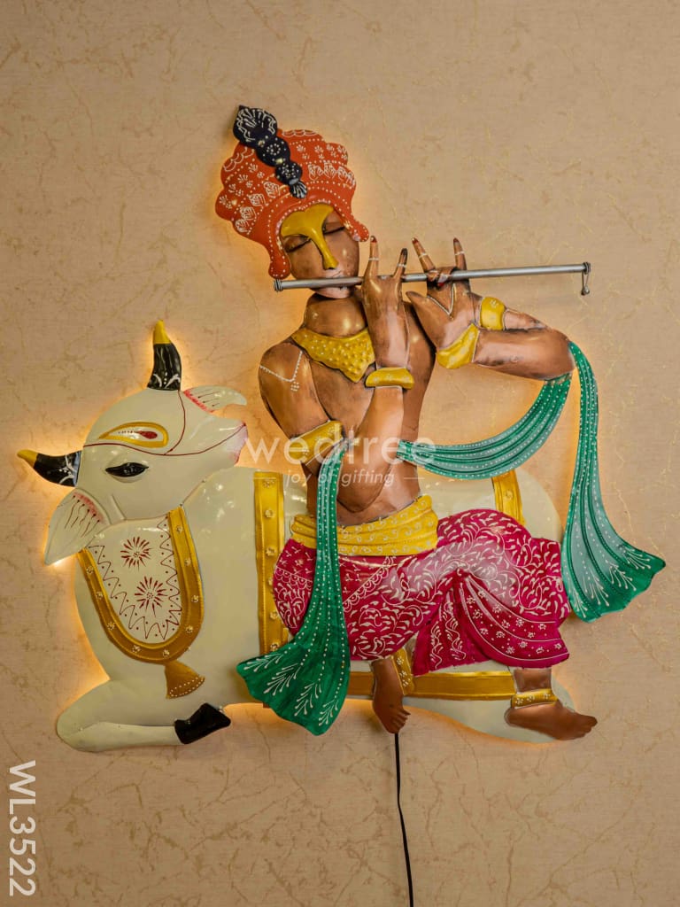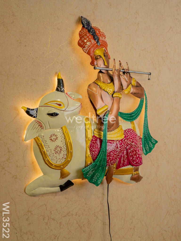 - Made of metal, it features beautiful Krishna playing the flute with a cow. A built-in LED light will help to brighten up any space.