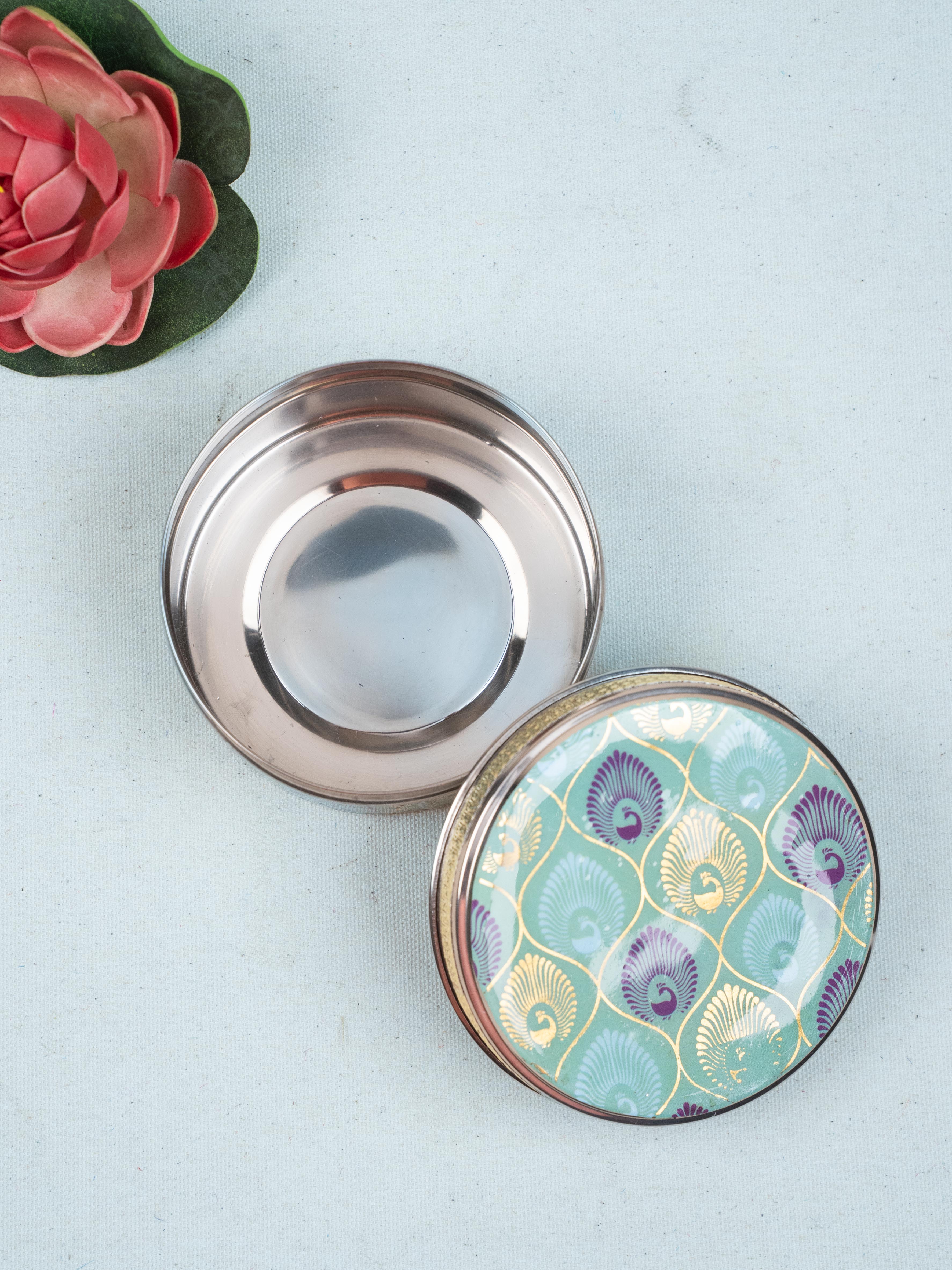- Store your Delicious Pooris & Snacks in Style with this Exquisite Stainless Steel Poori Box, Featuring a Vibrant Peacock Feather Digital Print Lid.