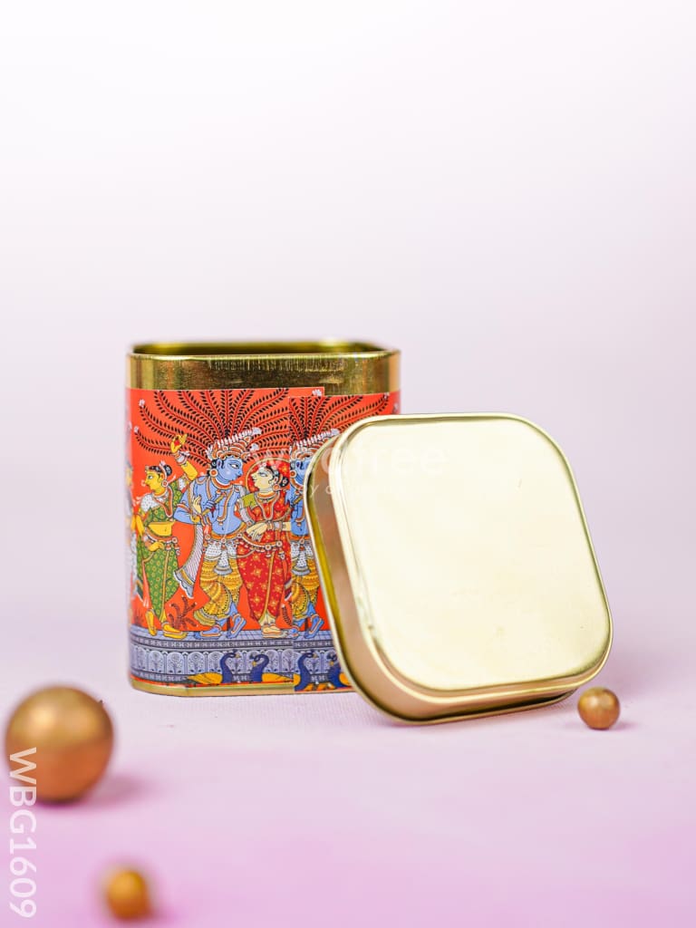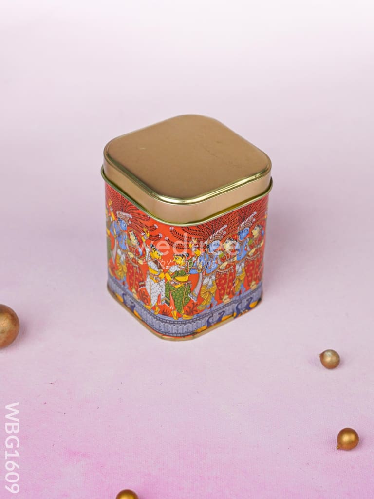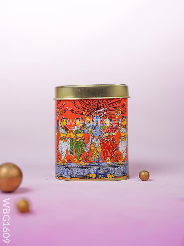 - Printed Tin Jar, Featuring Intricate and Vibrant Traditional Indian Folk Art.