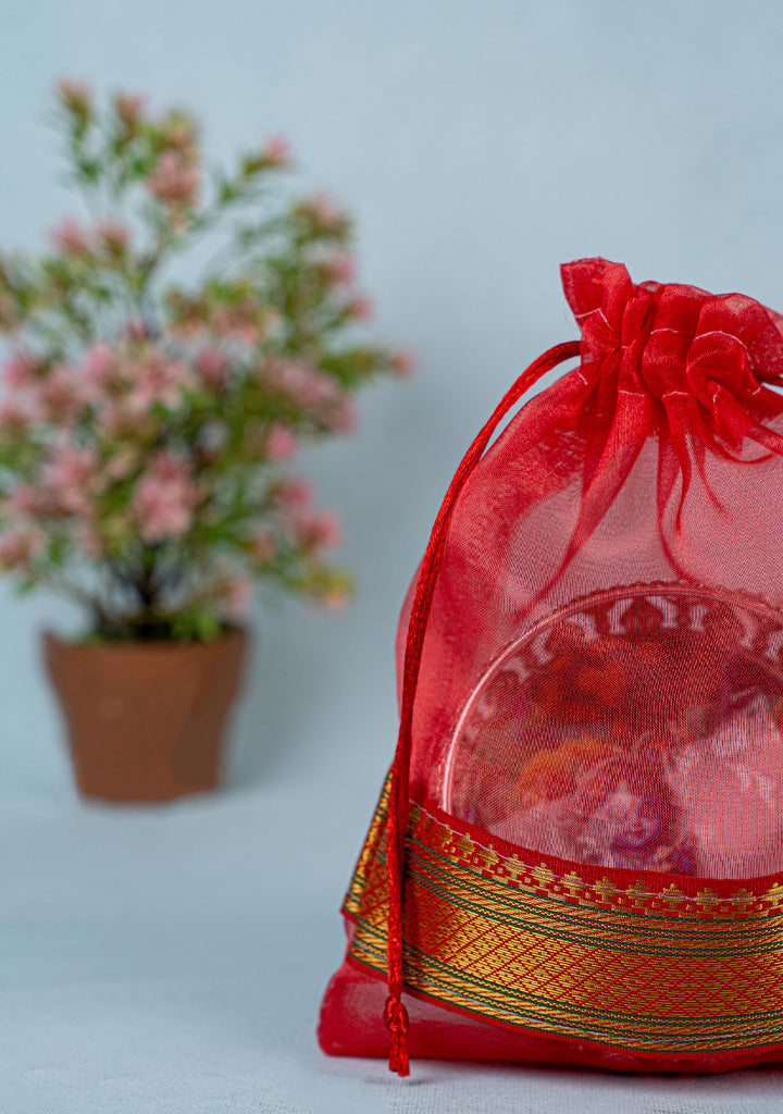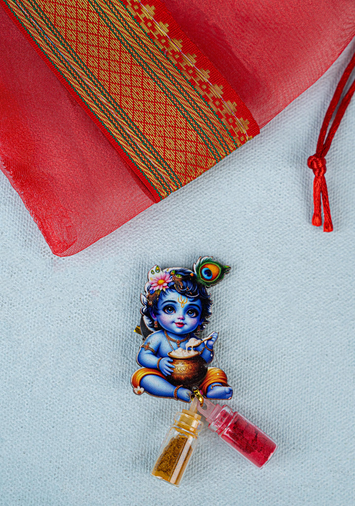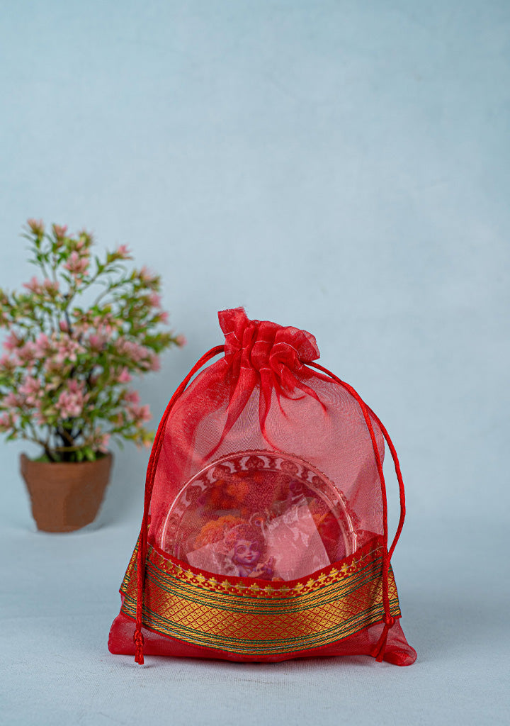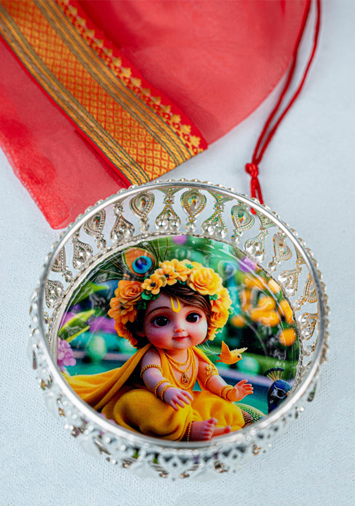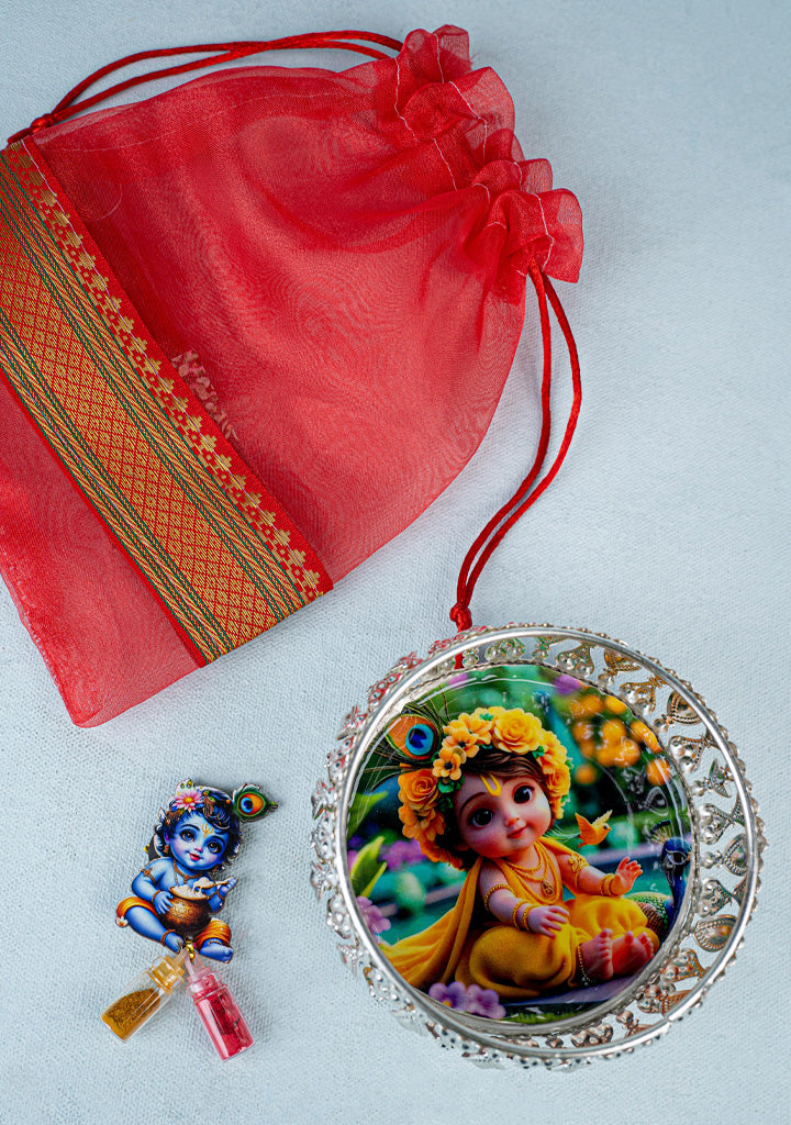 Navratri Combo - Tissue String Bag with German Silver Bowl - Baby Krishna Design & Krishna Haldi Kumkum Set - WGC0091