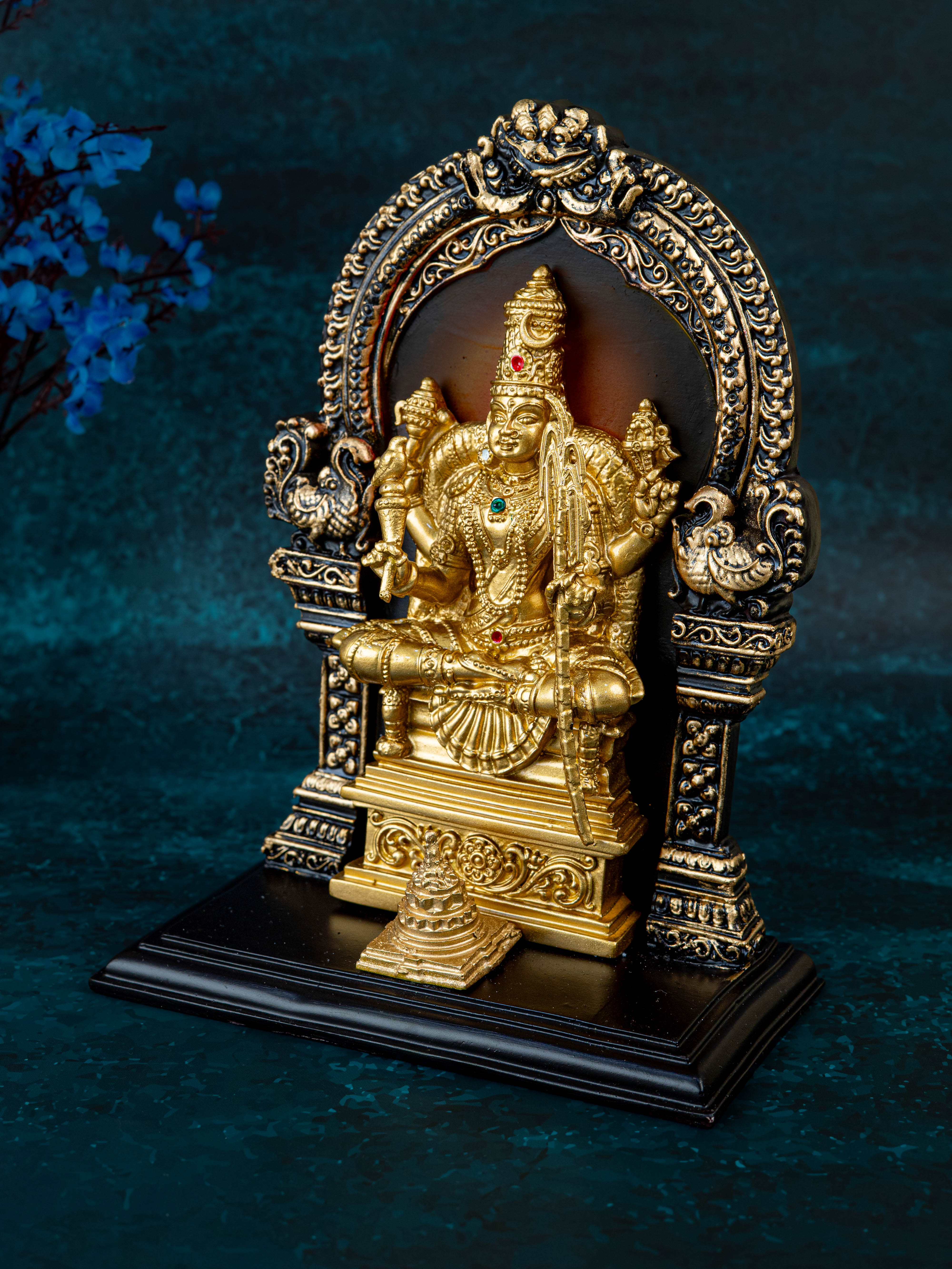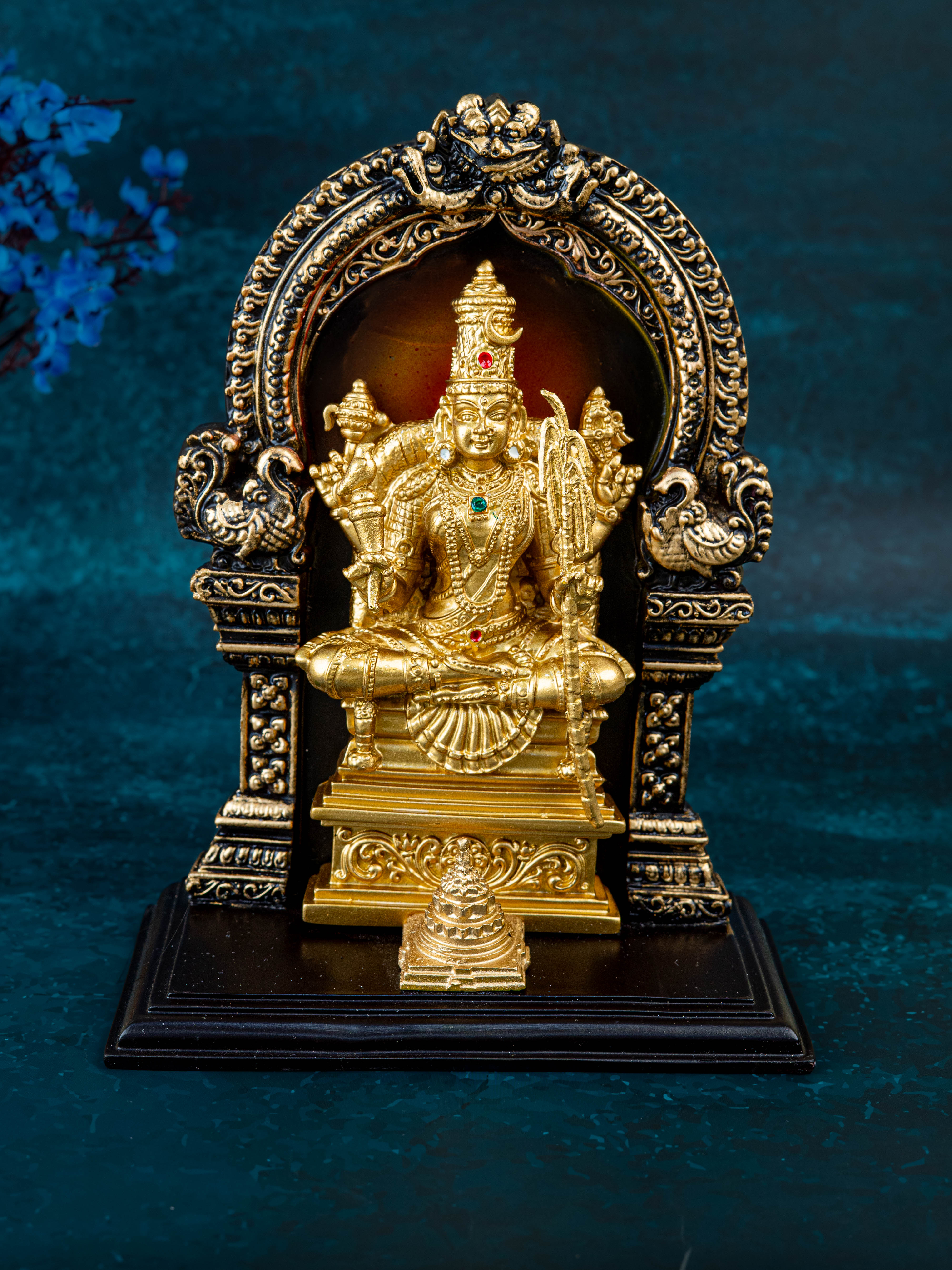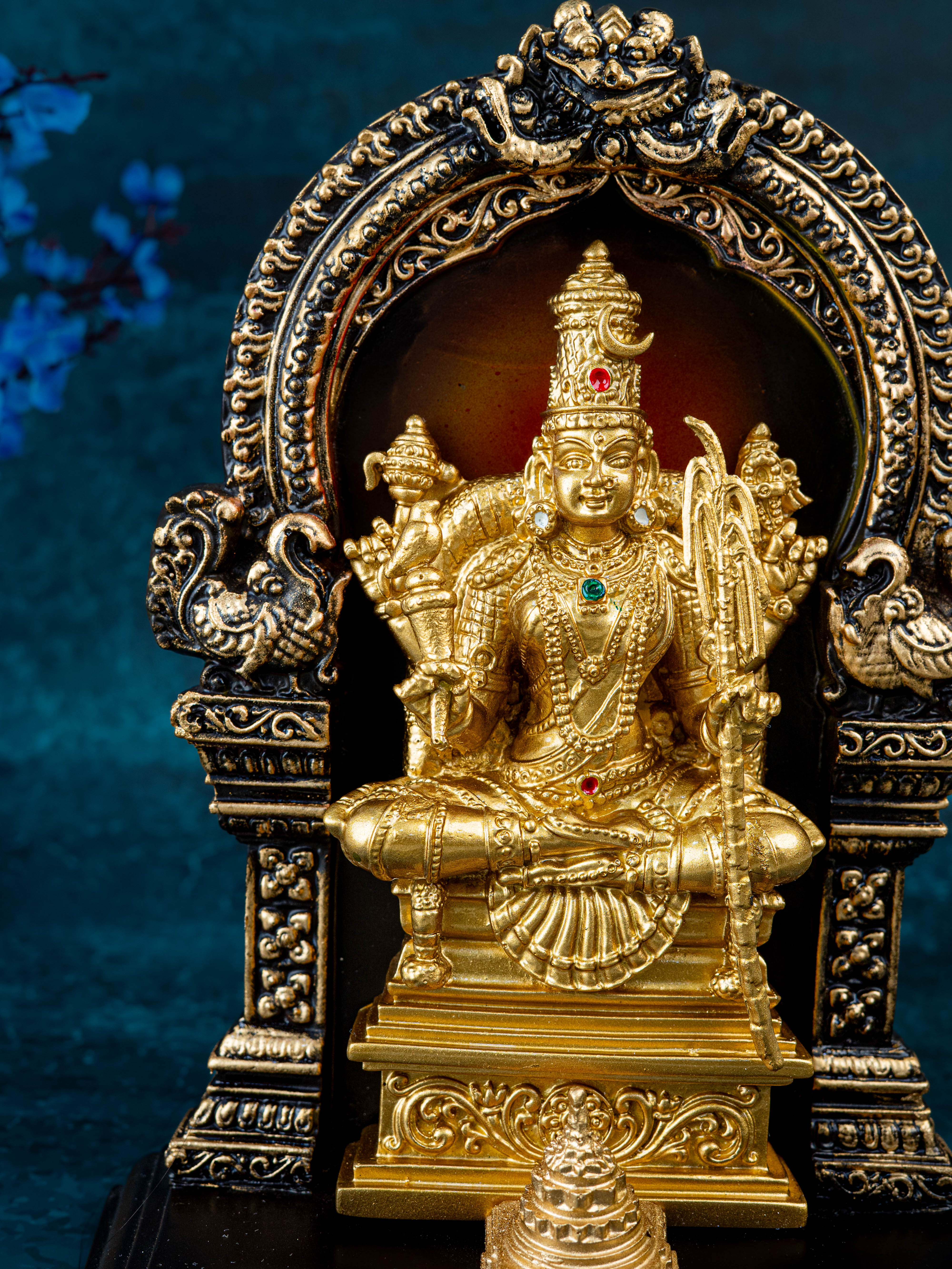- Polyresin Kamatchi Idol Seated Majestically within an Intricately Designed Temple Arch, symbolizing Wisdom, Prosperity, and Compassion.