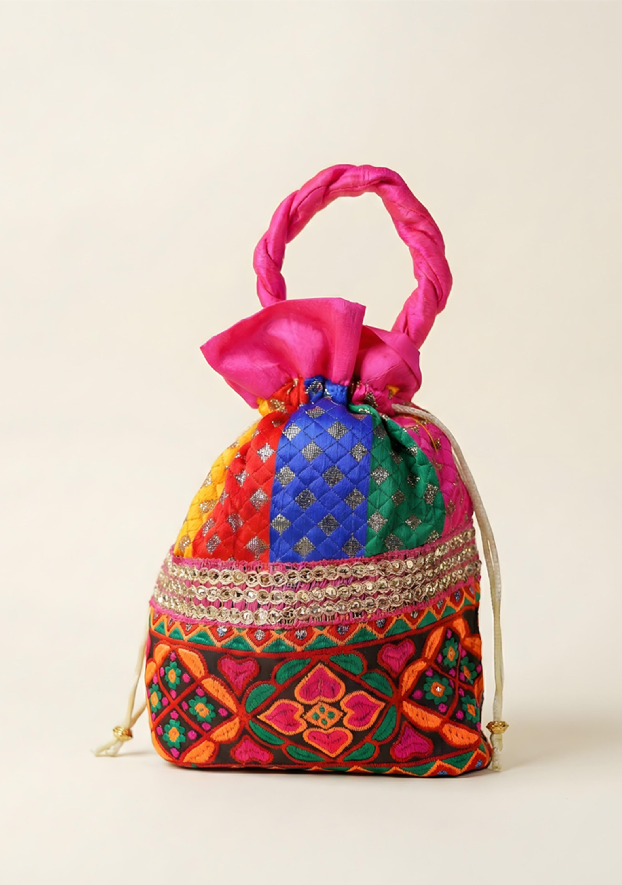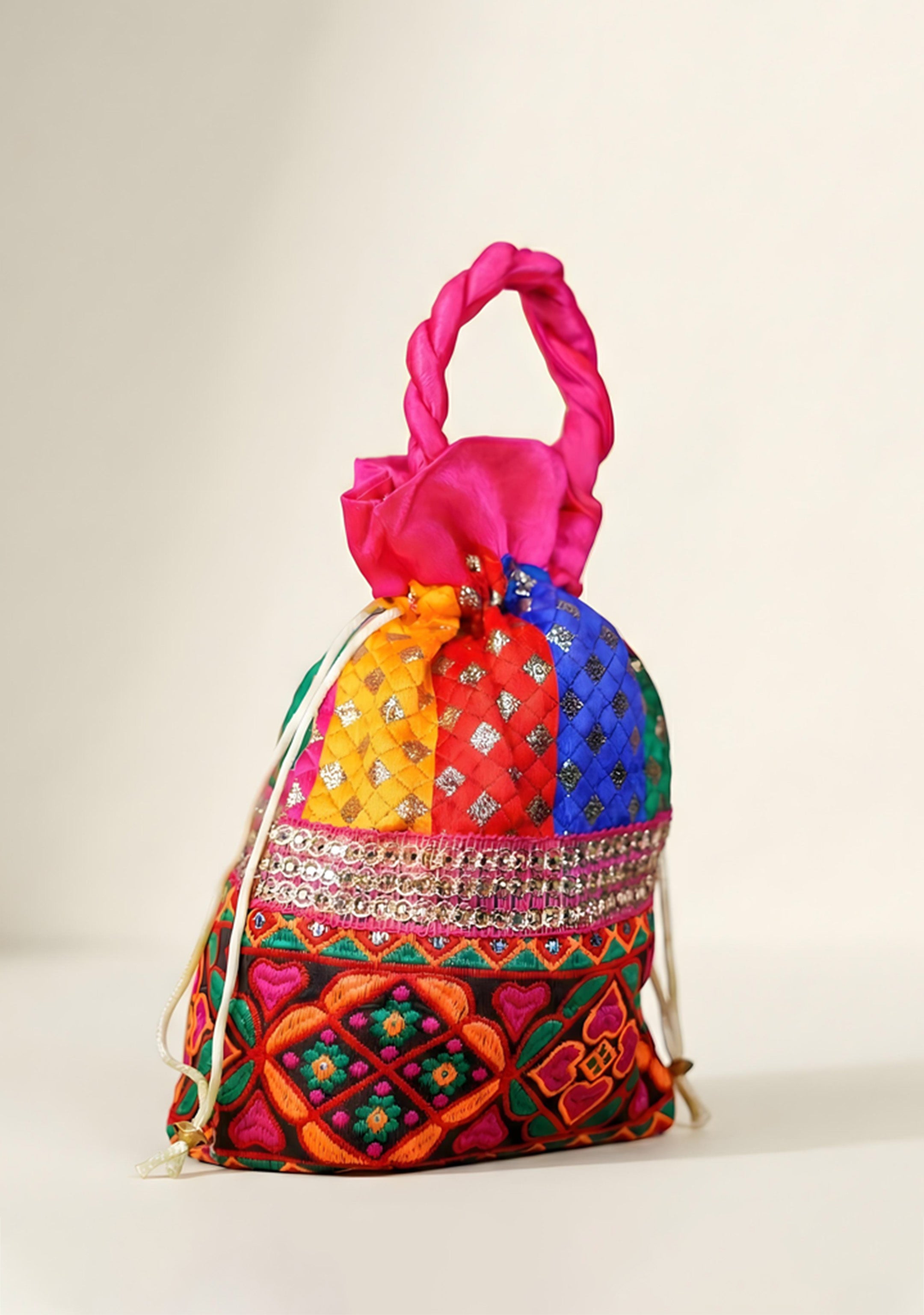 An amazing, colorful Potli Bag design inundated with thread embroidery works and lace. There are bright colored thread embroidery works made all over the bag along the lower half.