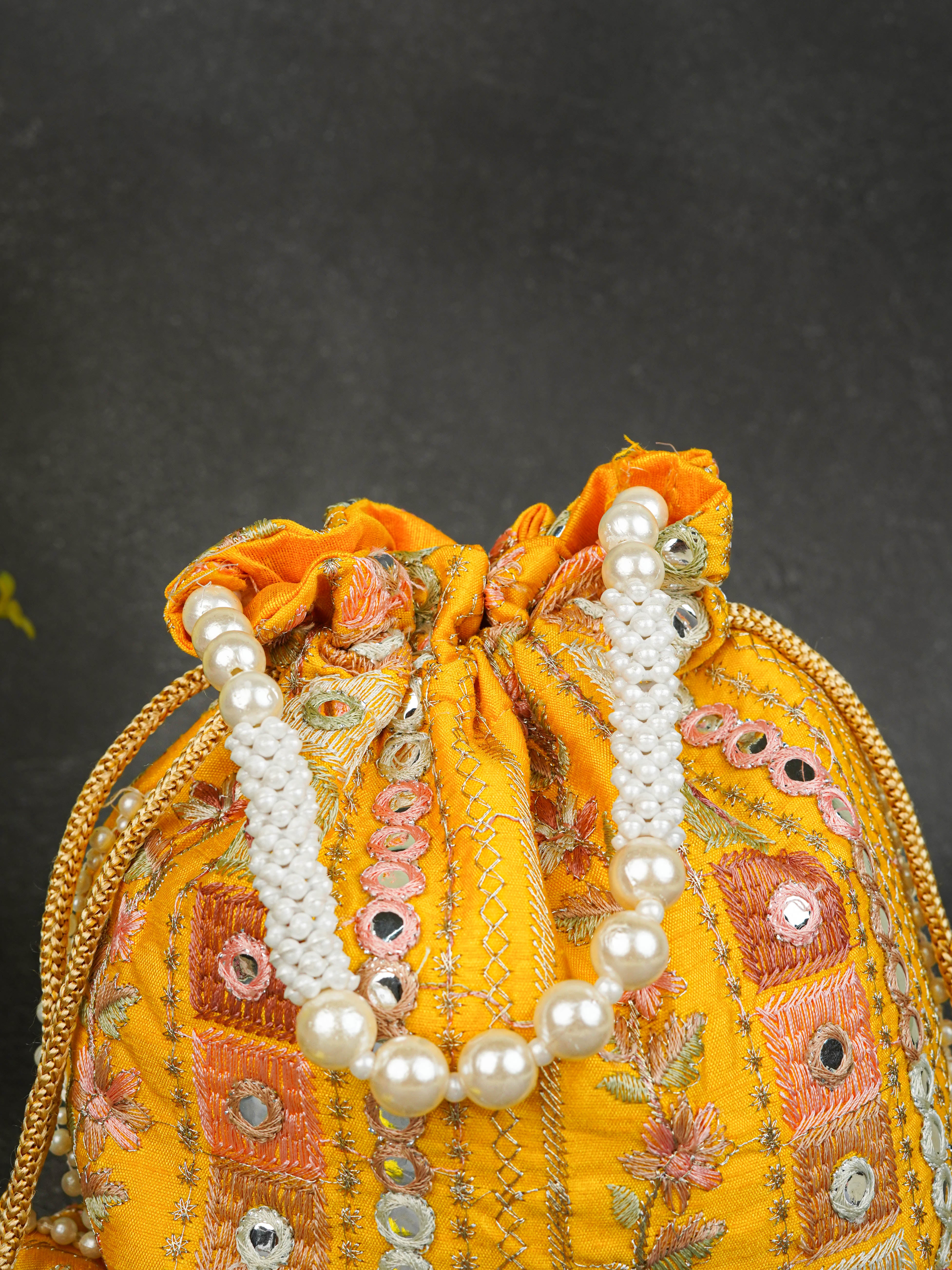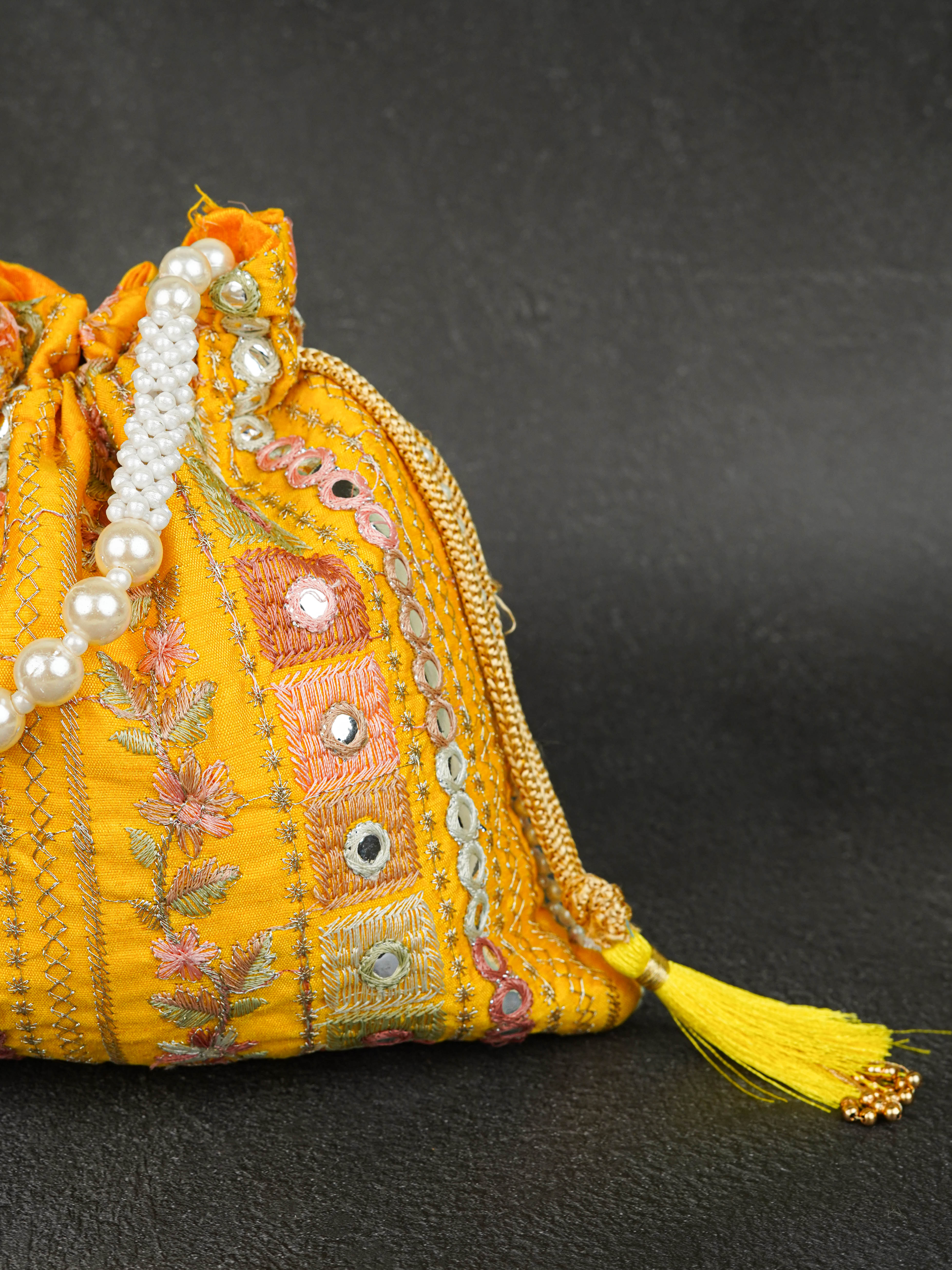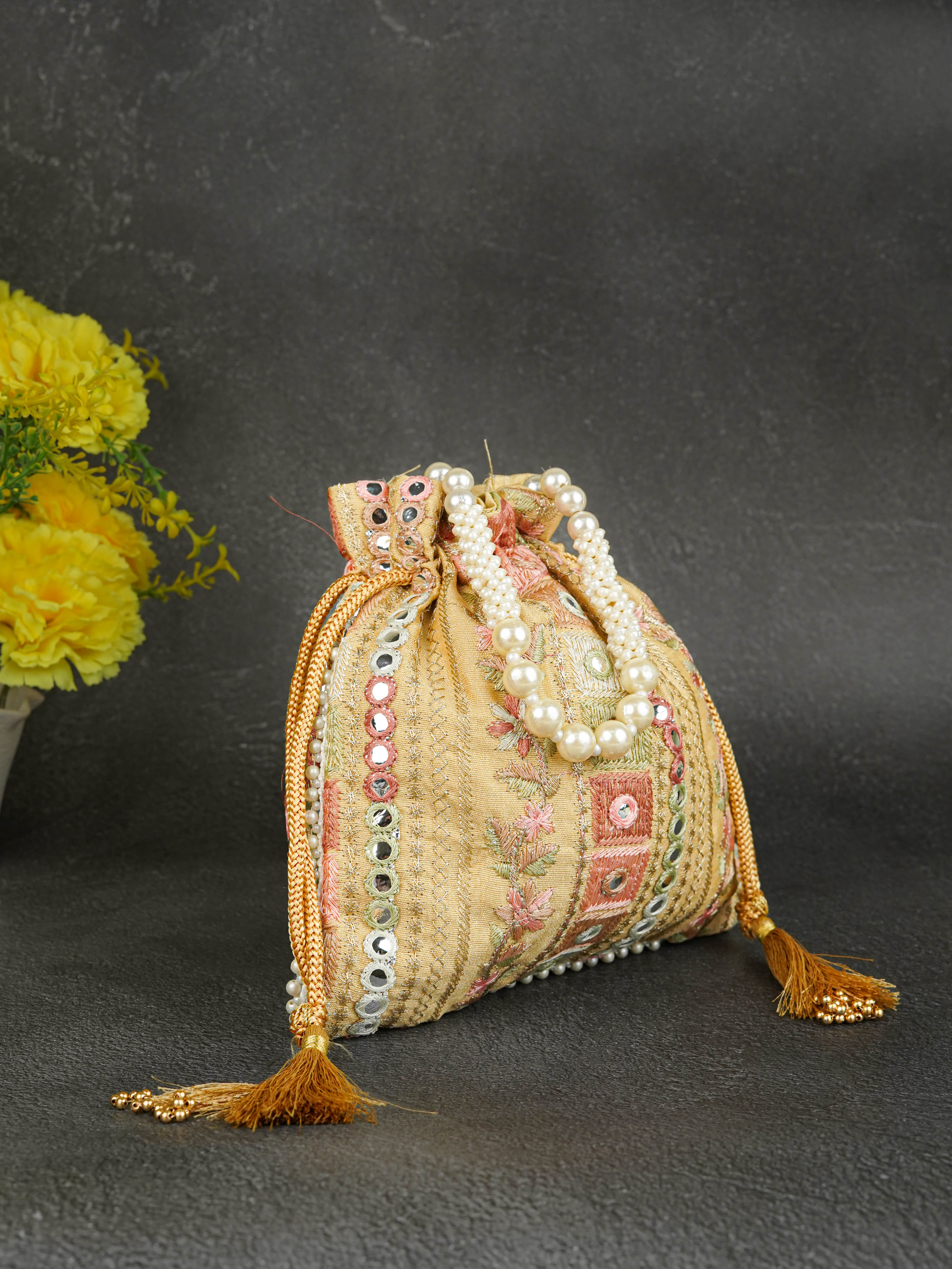 - This Potli Bag with Golden Chamki work is the perfect accessory for any festive occasion.