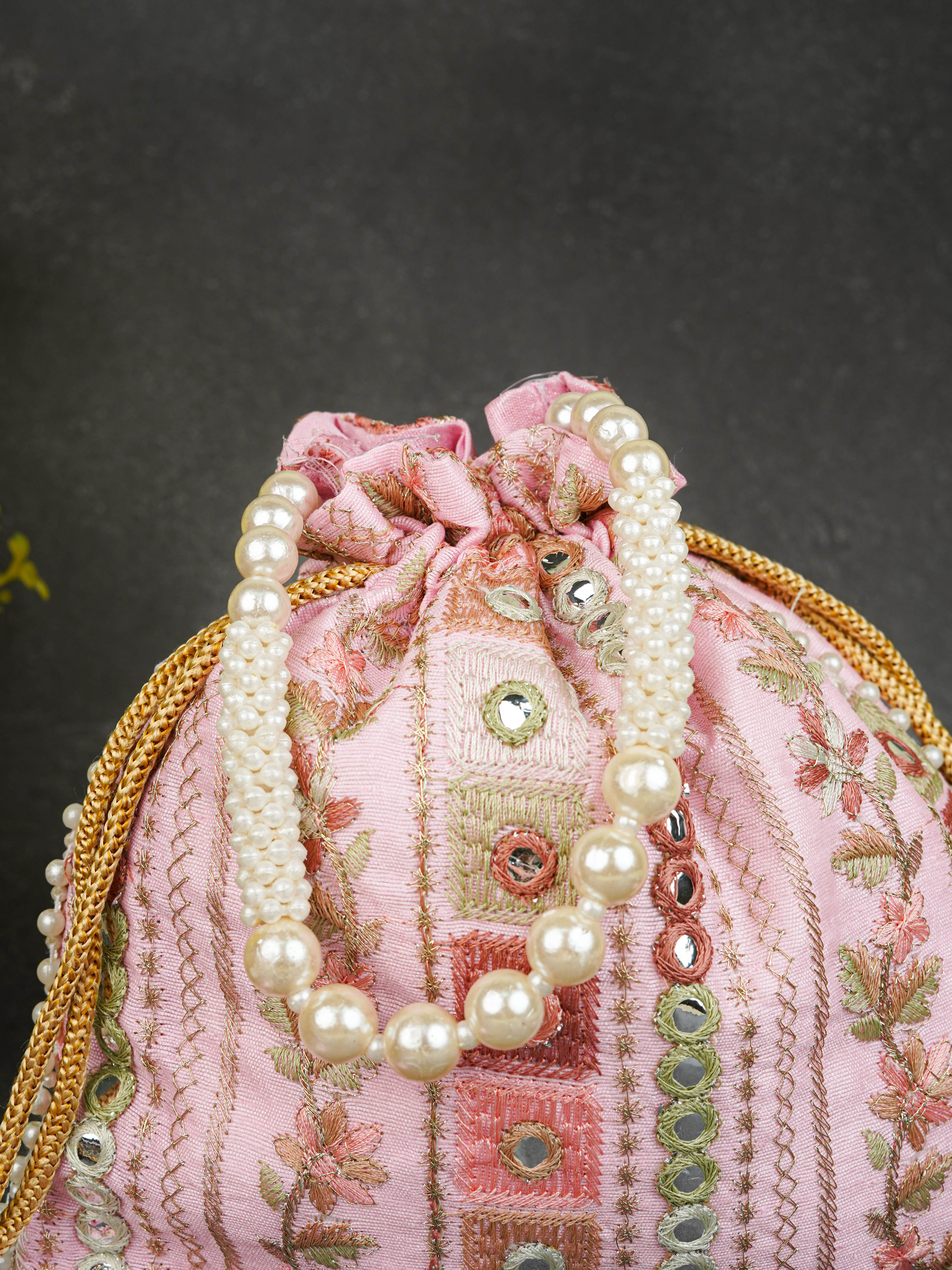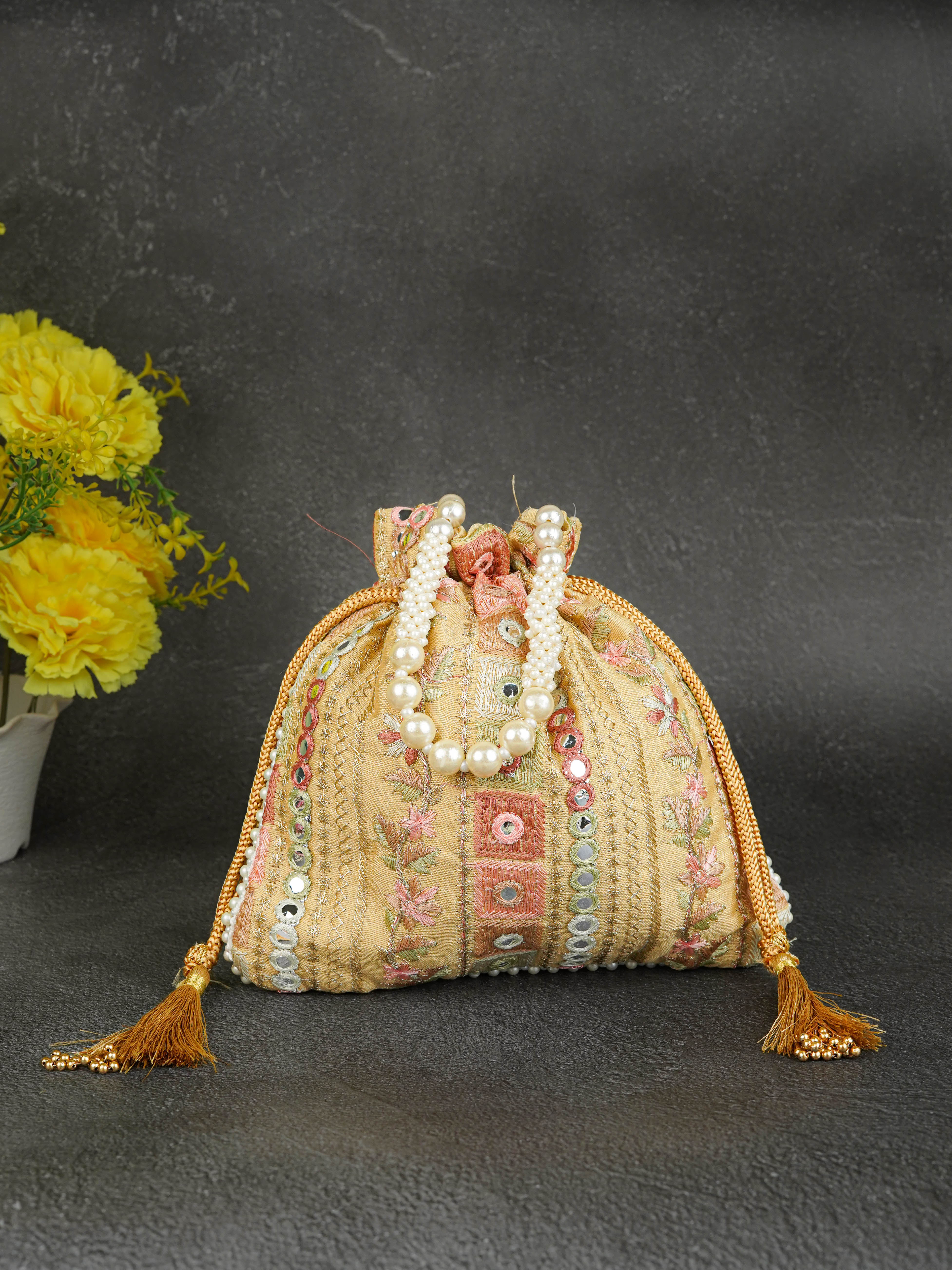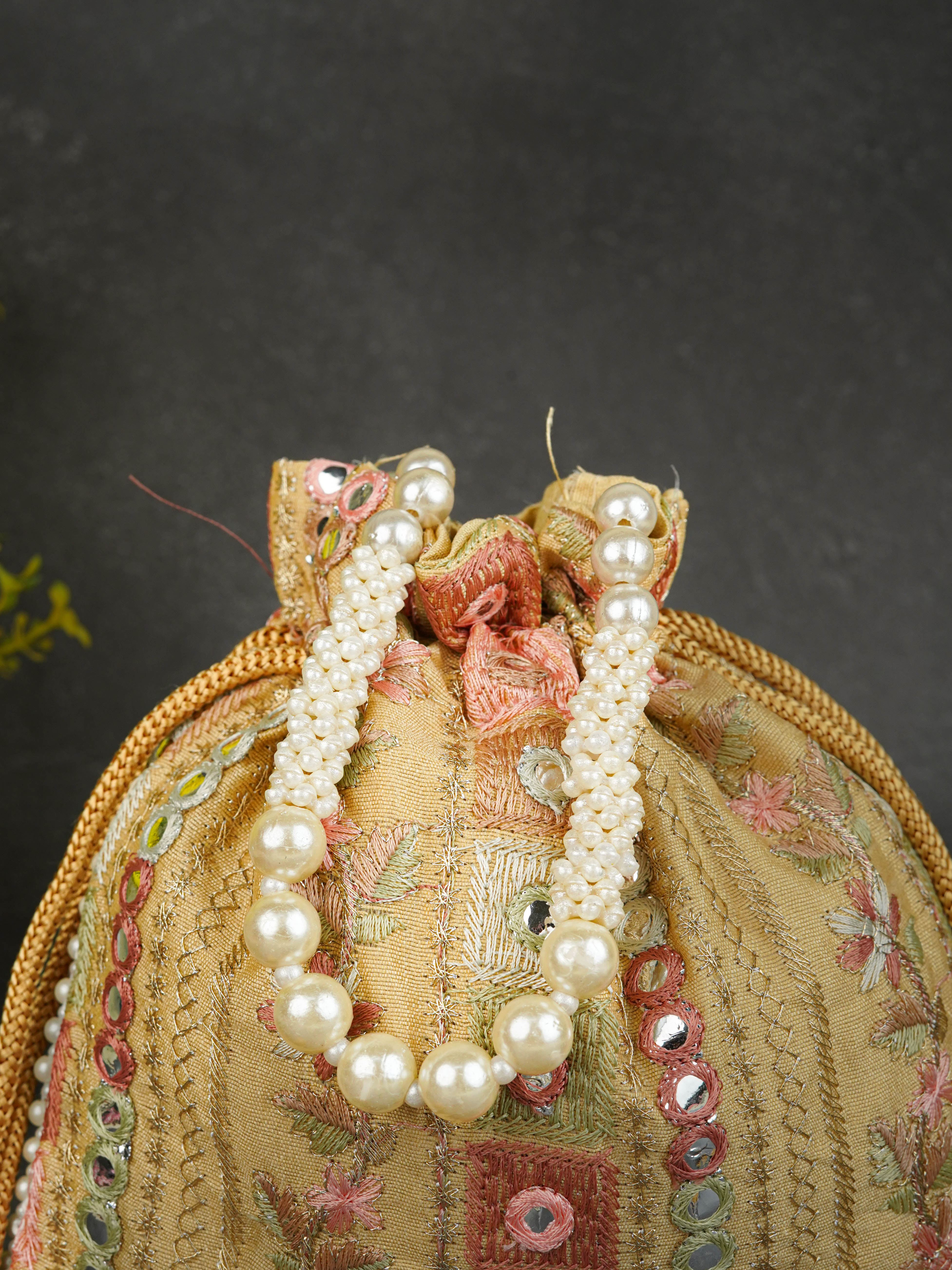 - It comes with a cute pearl handle and a golden drawstring for closure.