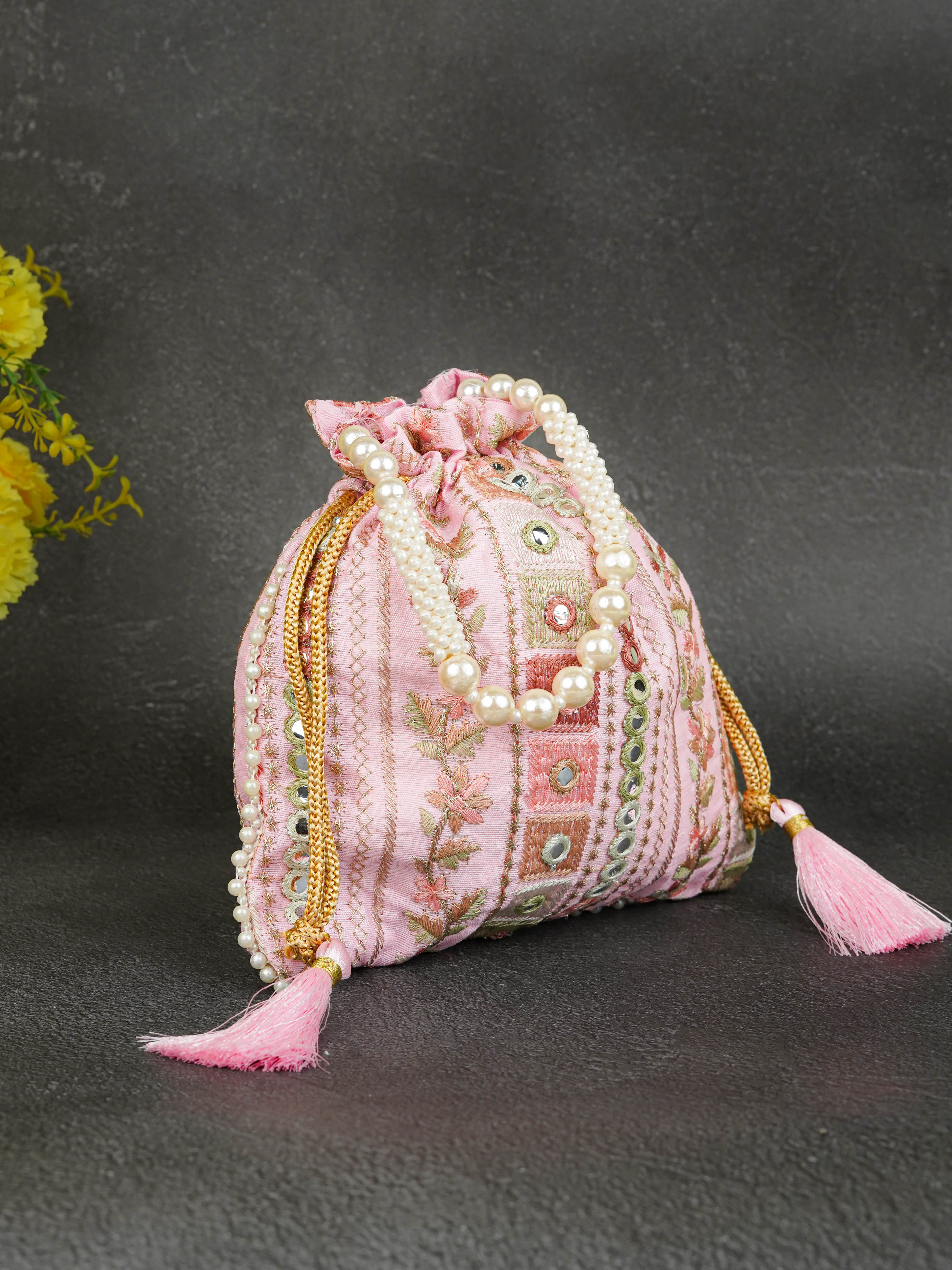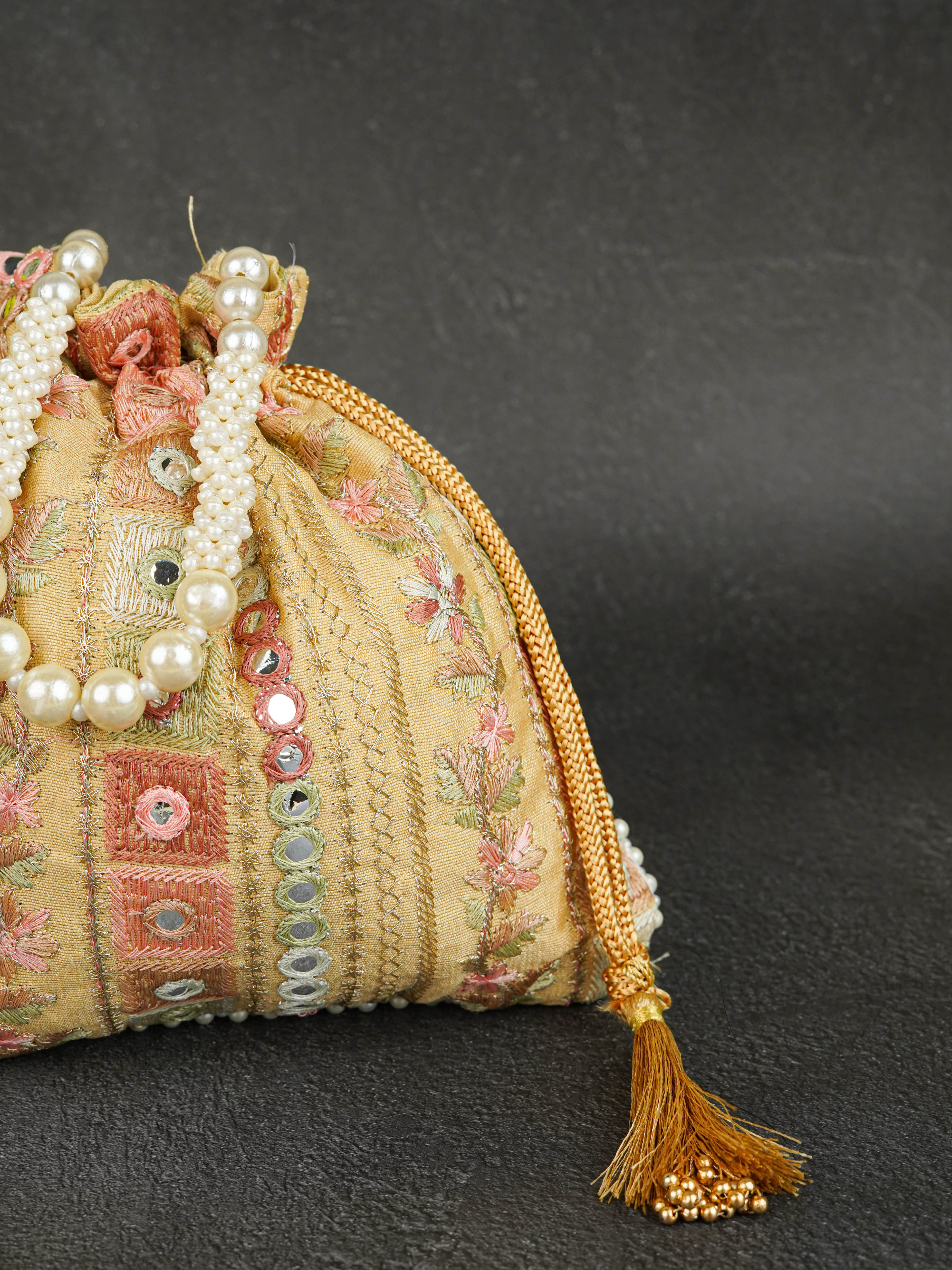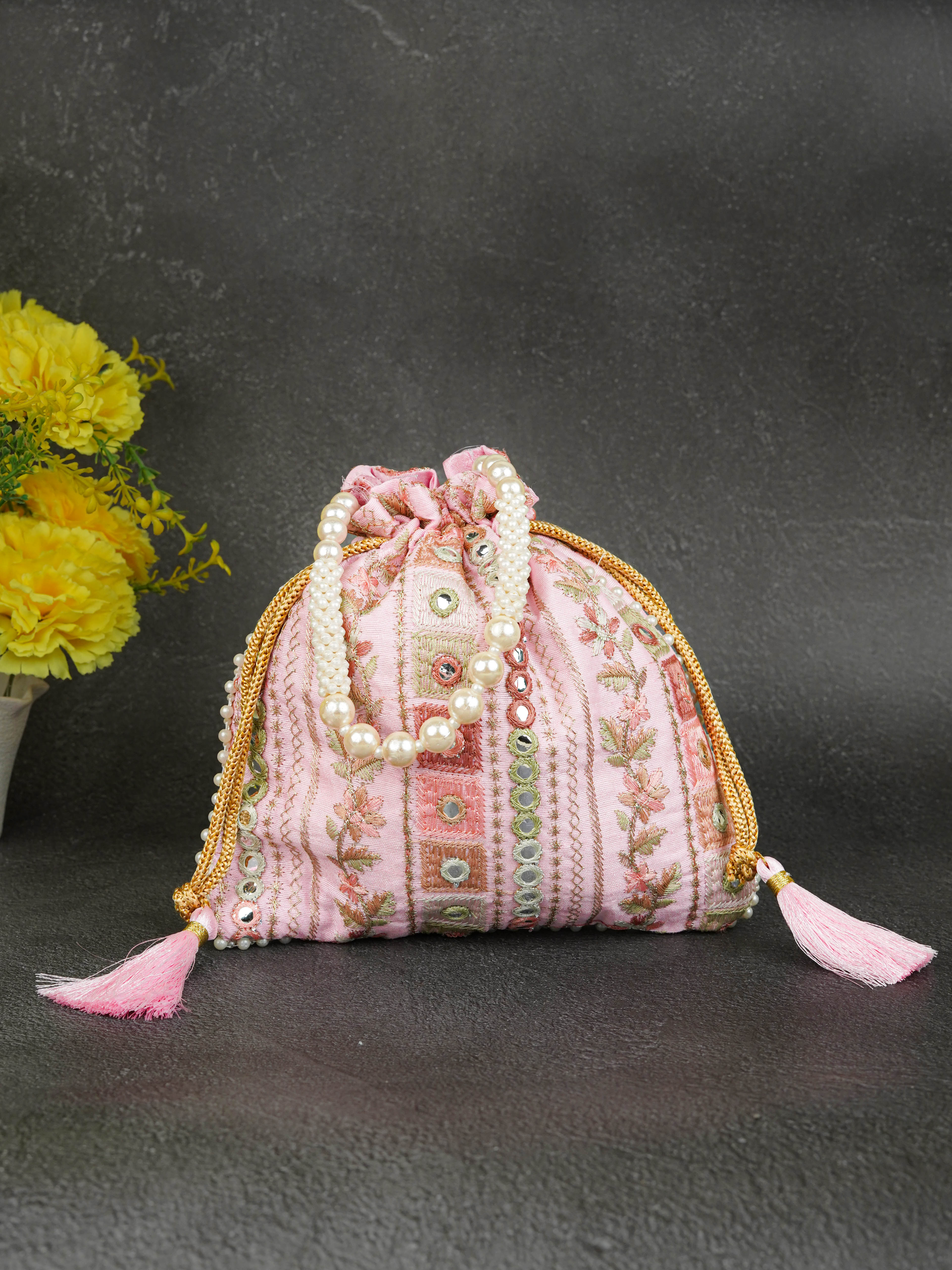 - It comes with a cute pearl handle and a golden drawstring for closure.