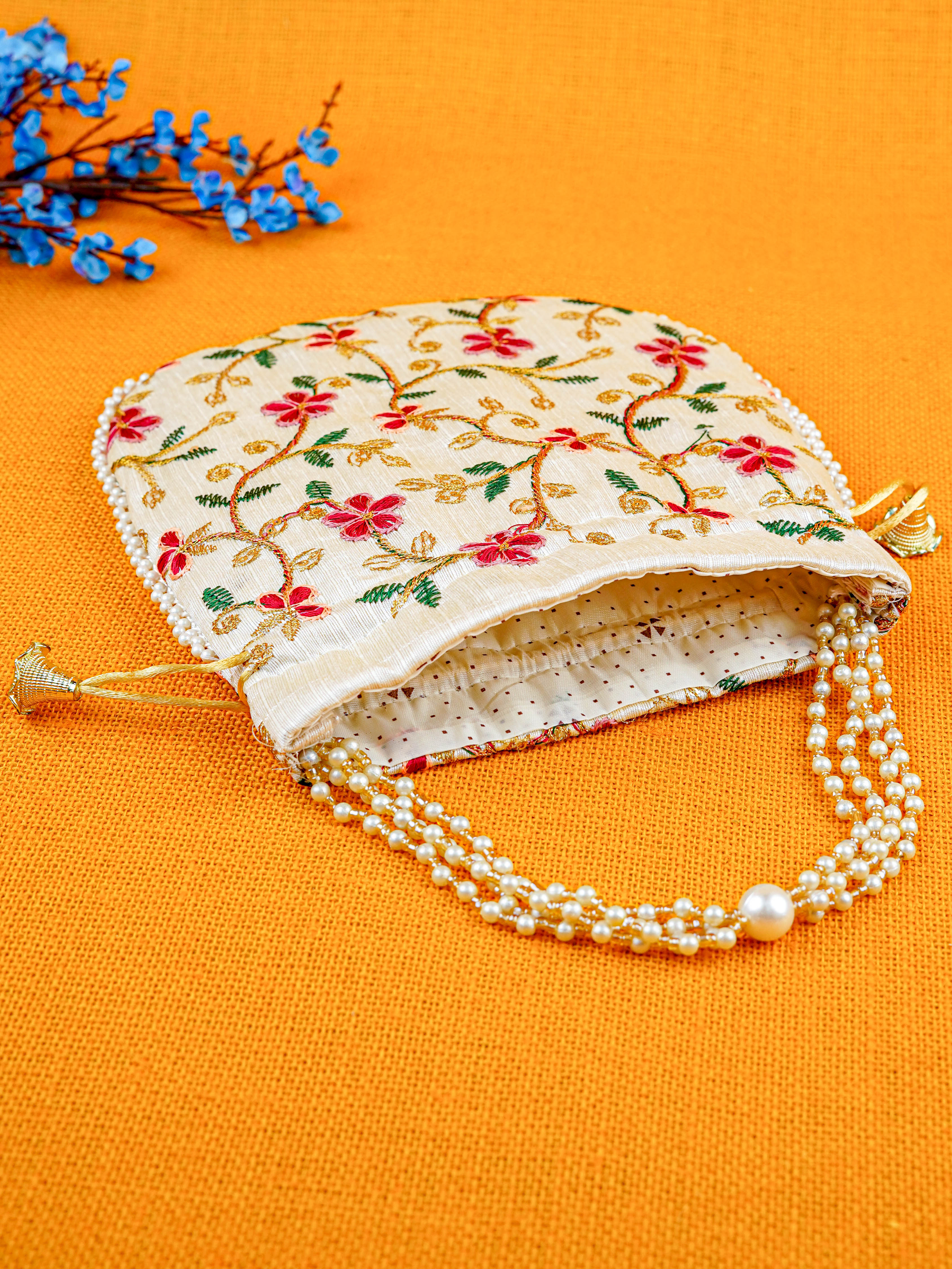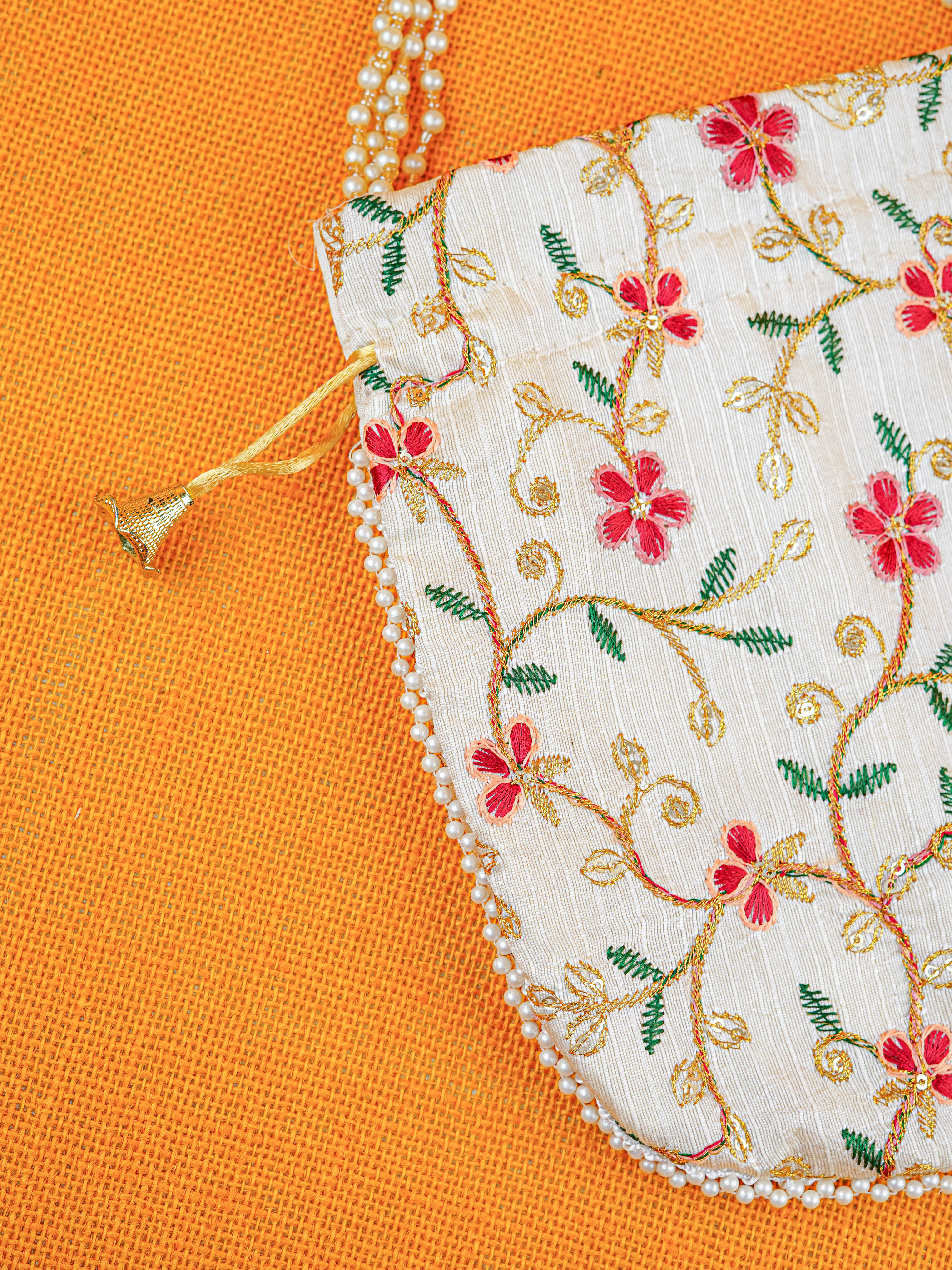 - Check out these cute potli bags that are adorned with very pretty golden embroidery and chamki work all throughout.