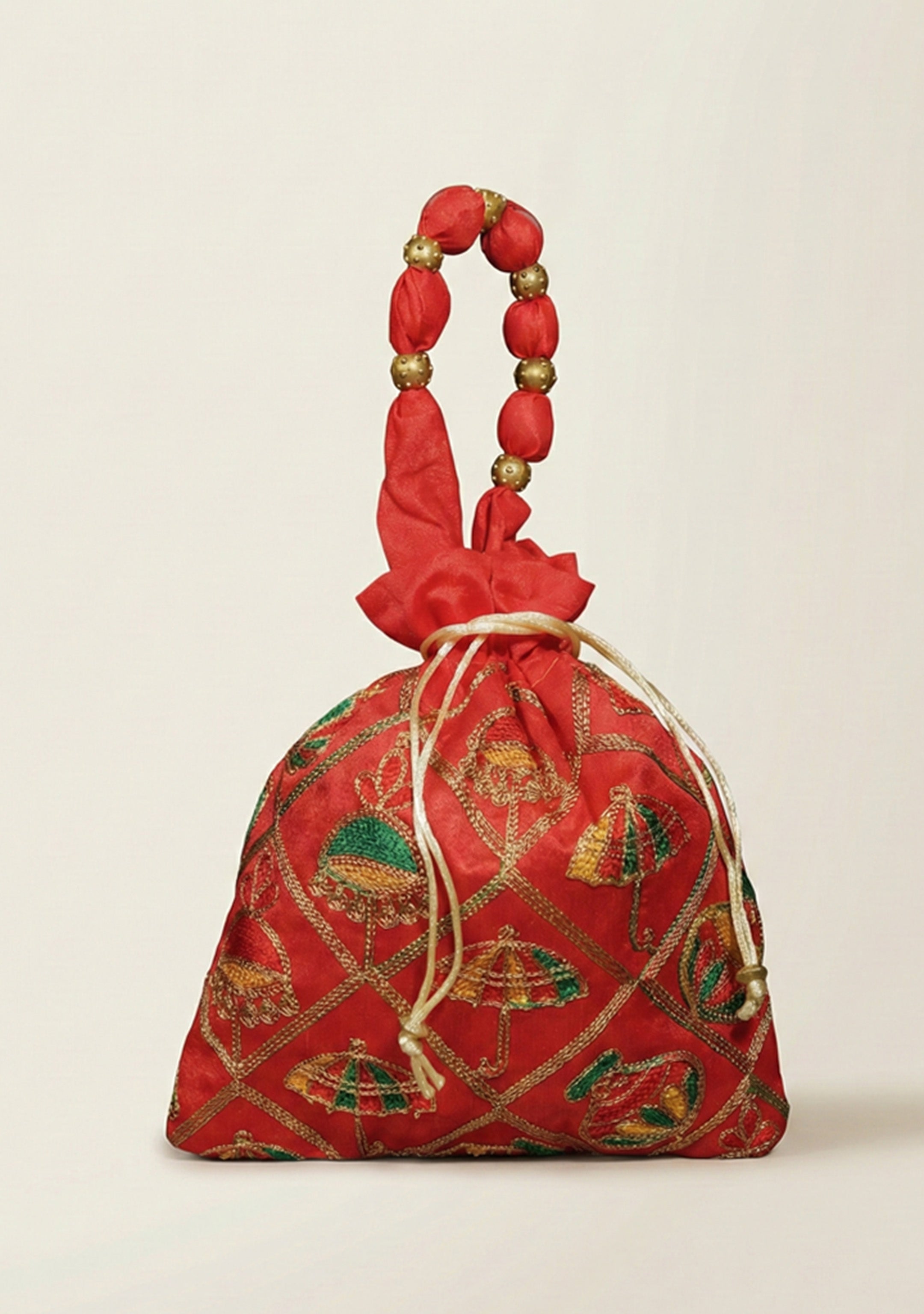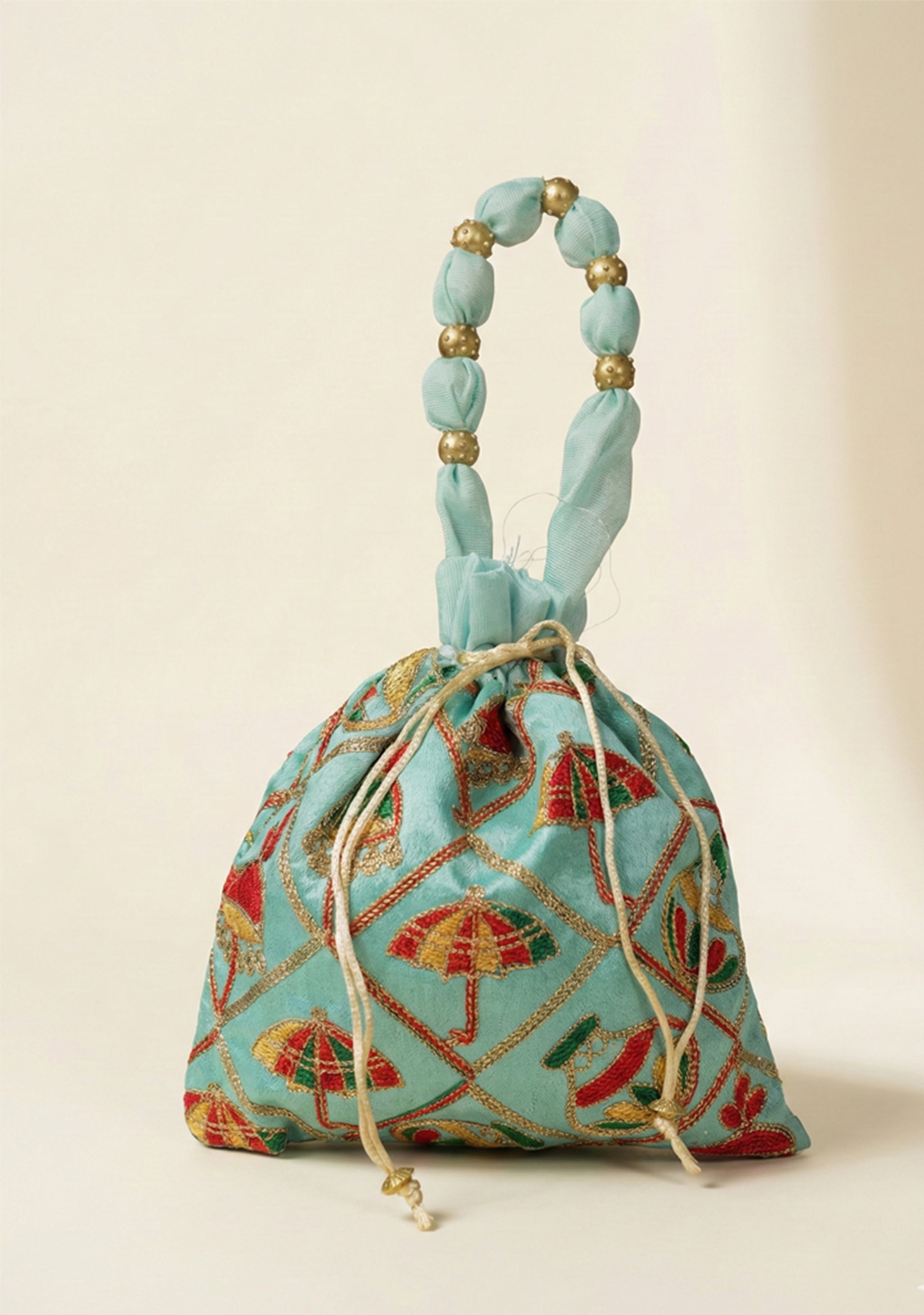 - A very pretty handle with closely tied golden beads and comes with a drawstring.