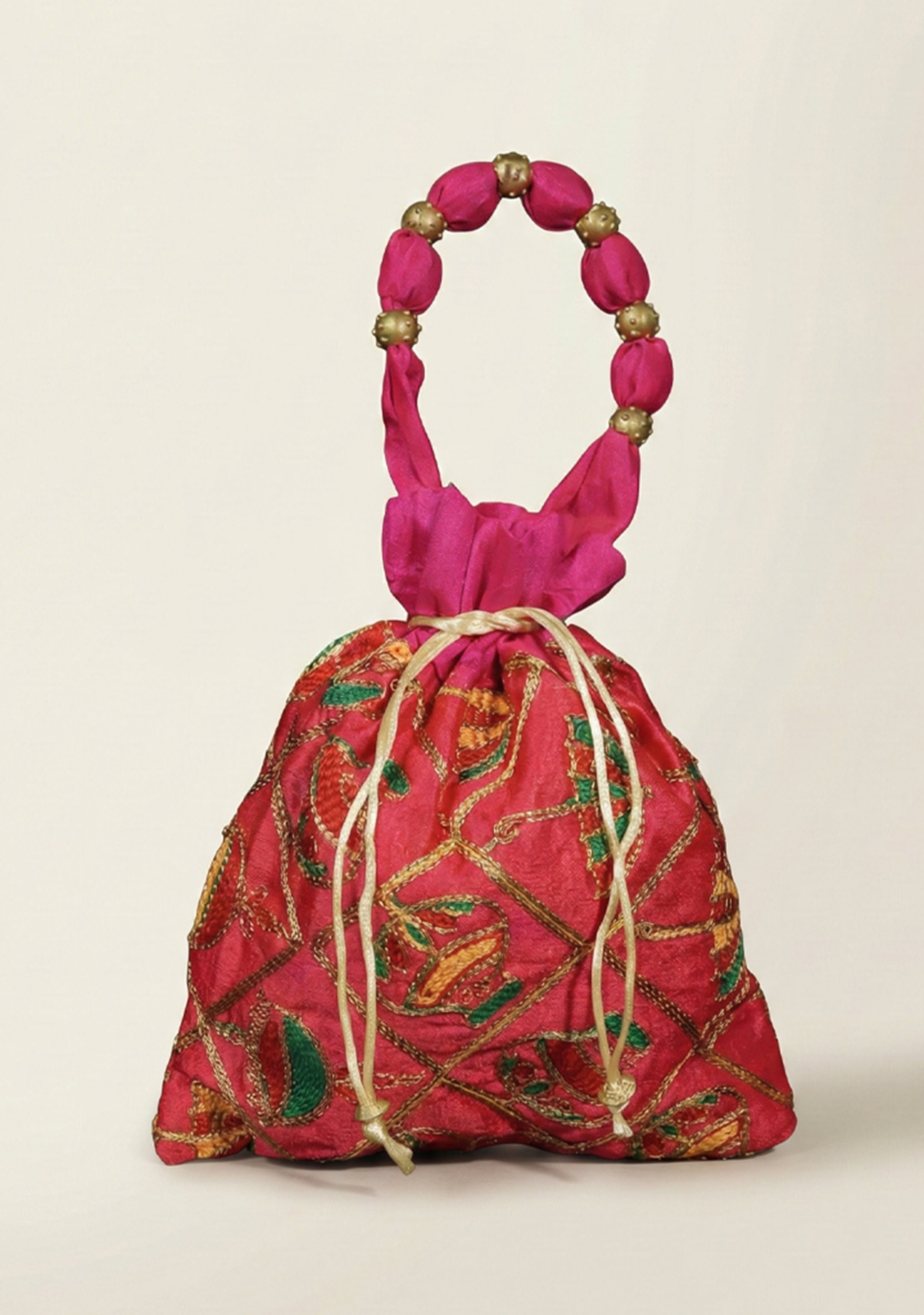 - Beautiful Potli bag in raw silk with colourful embroidery running throughout!