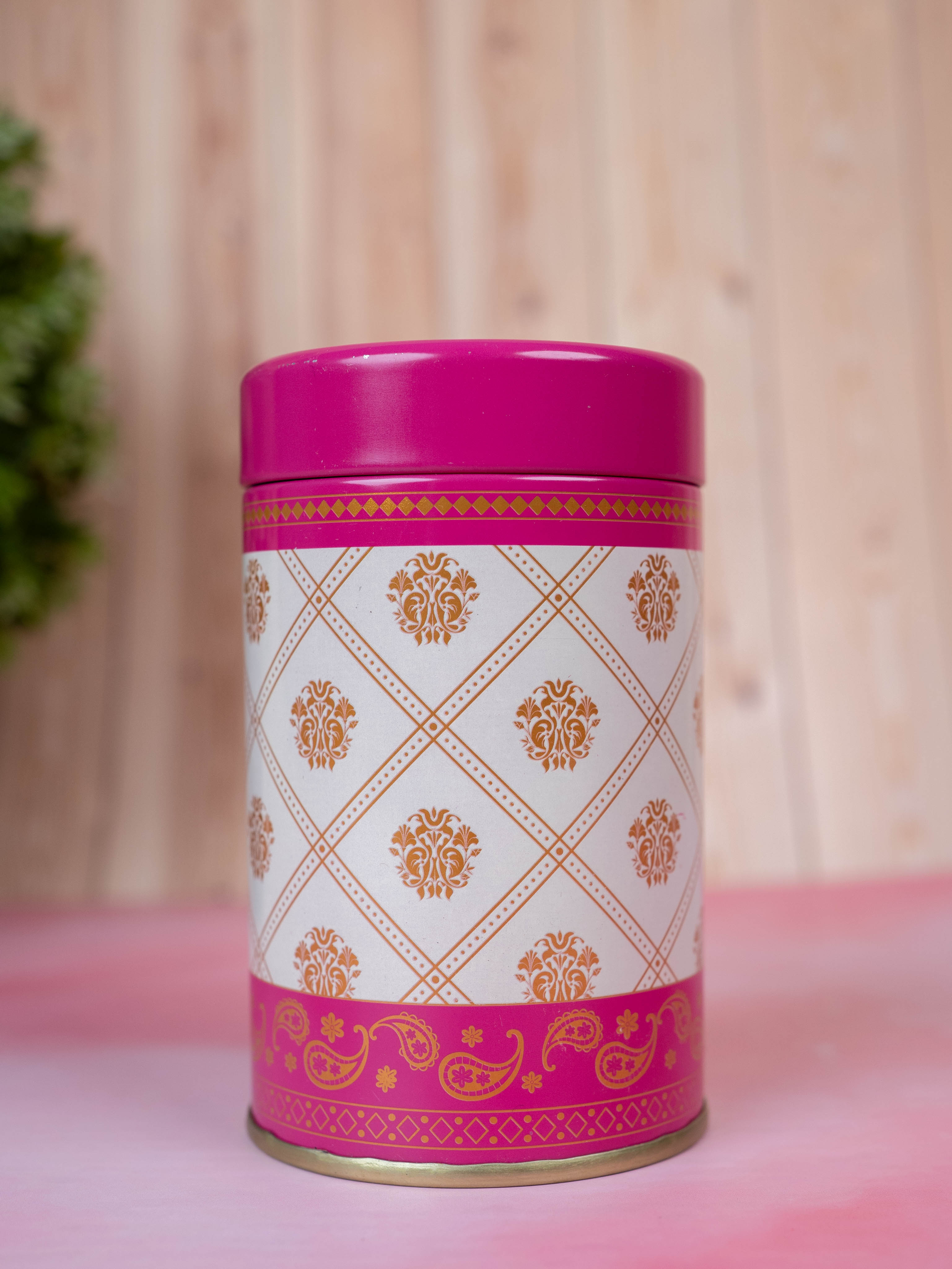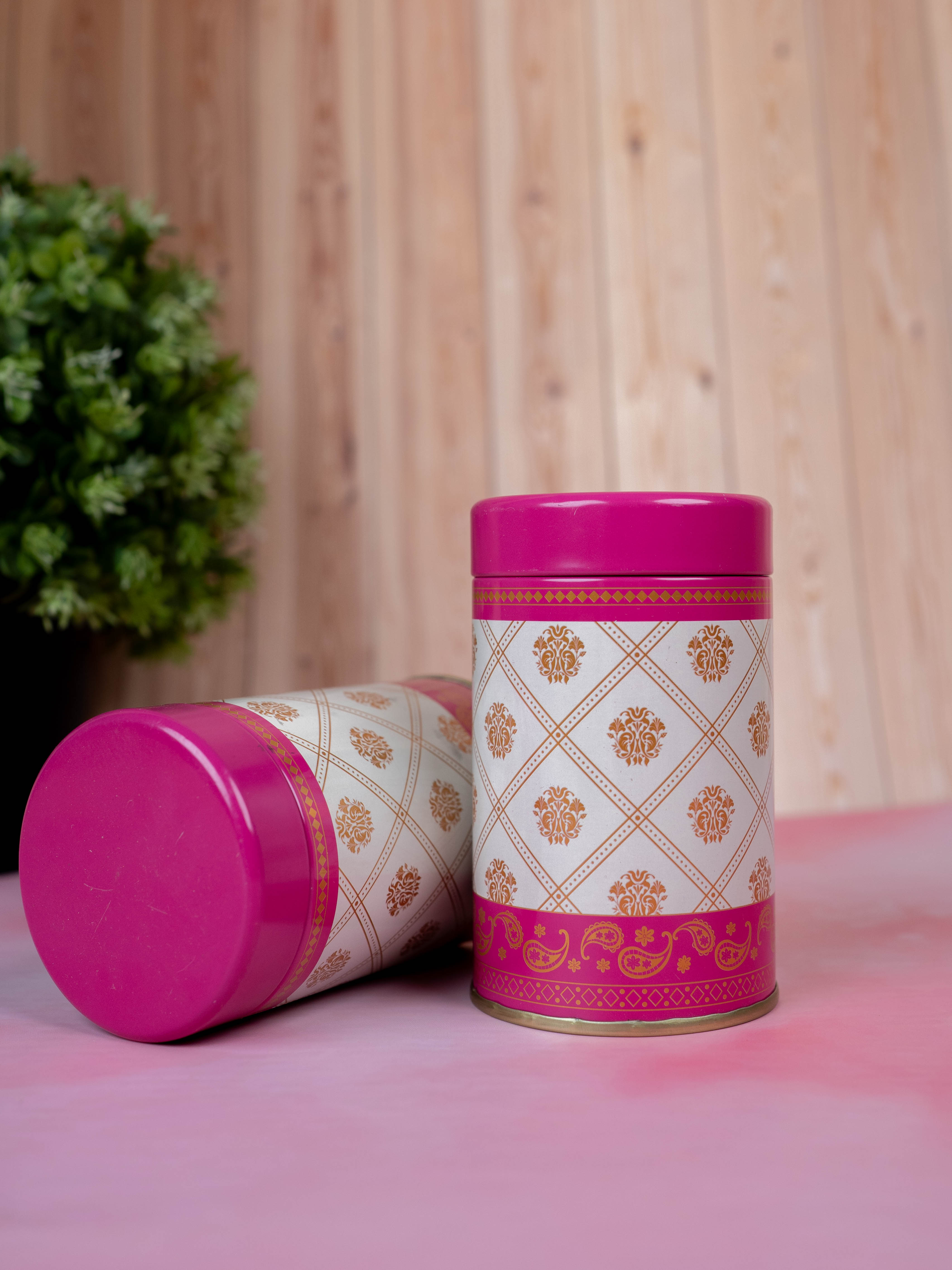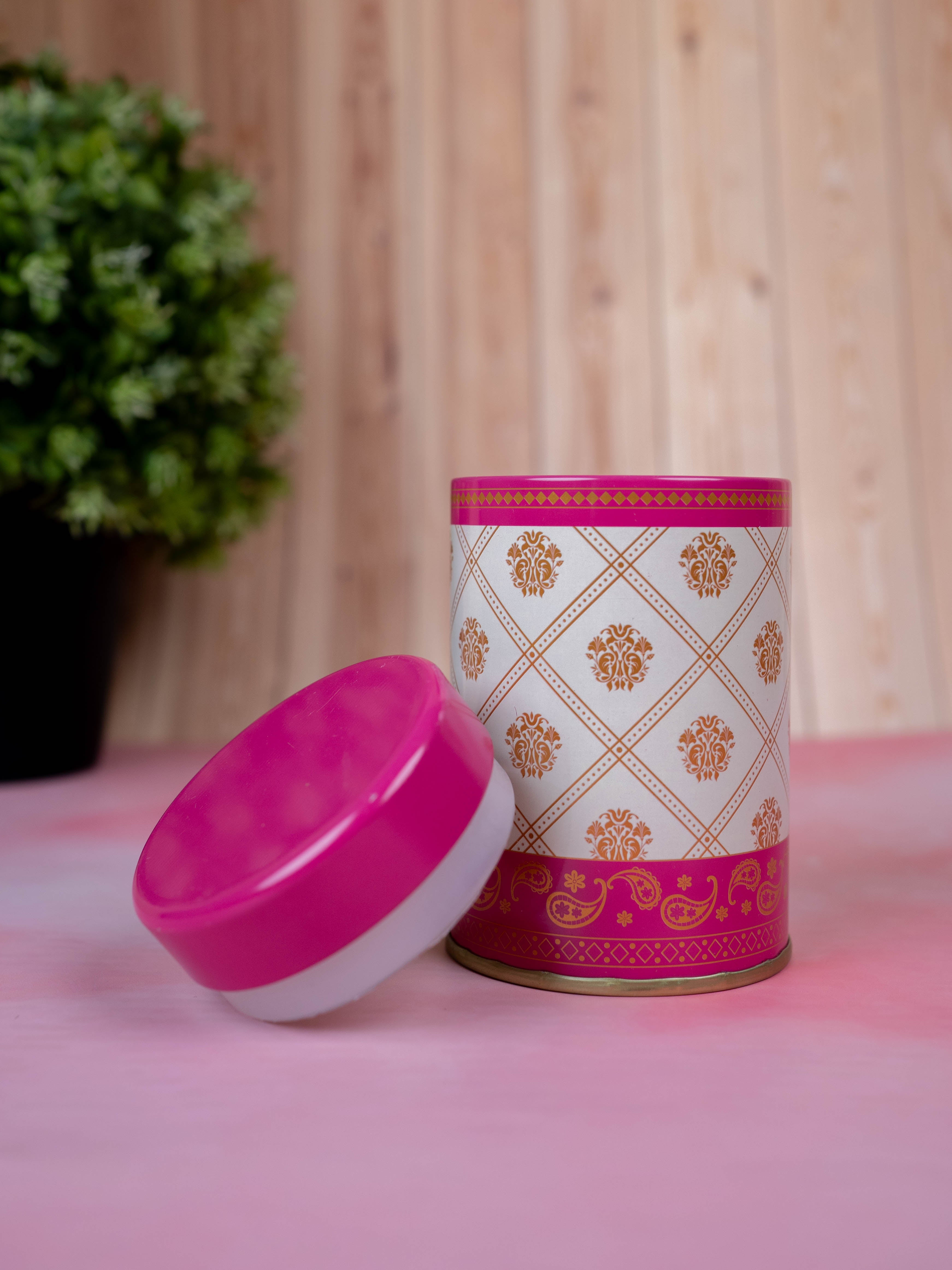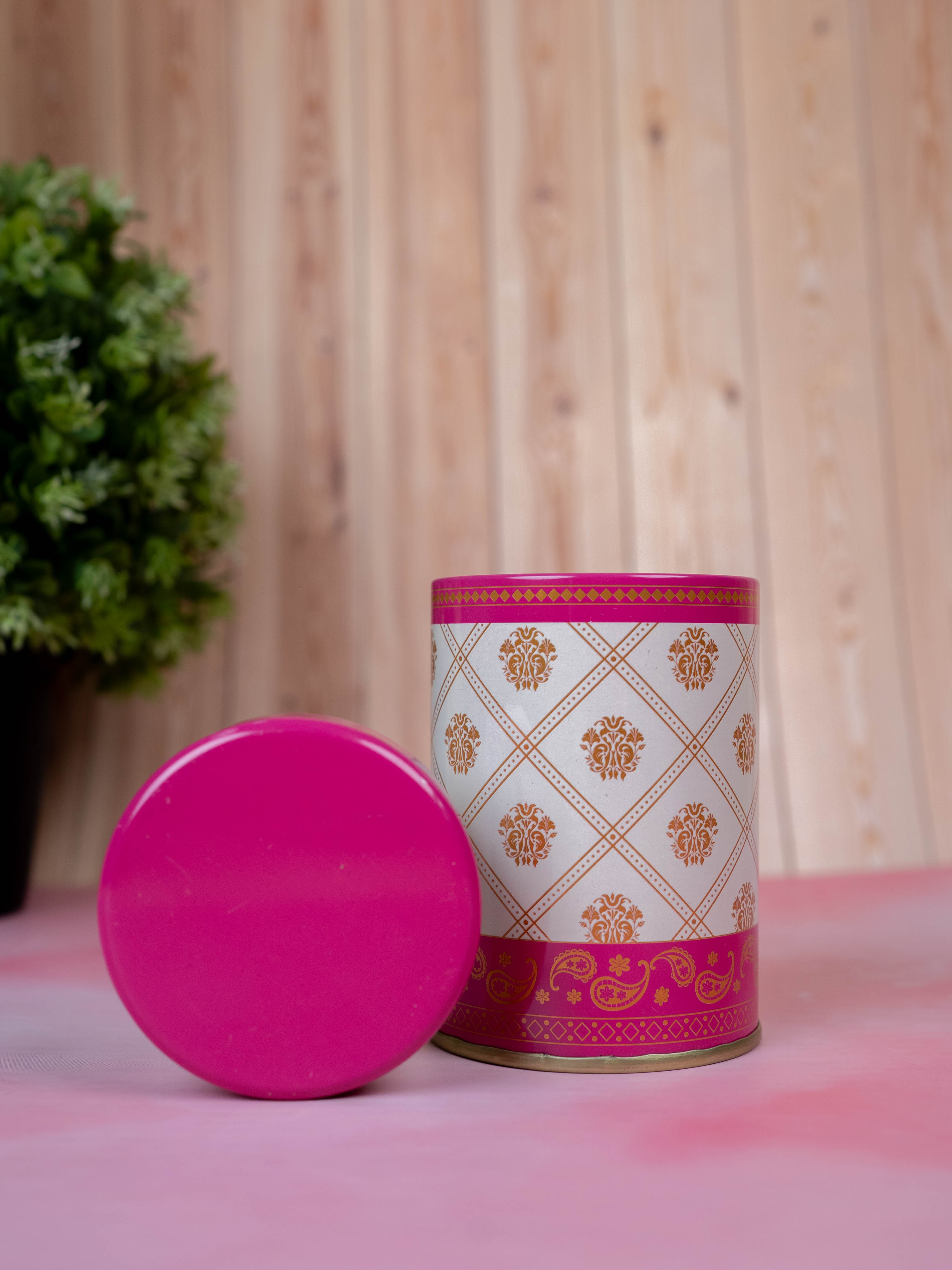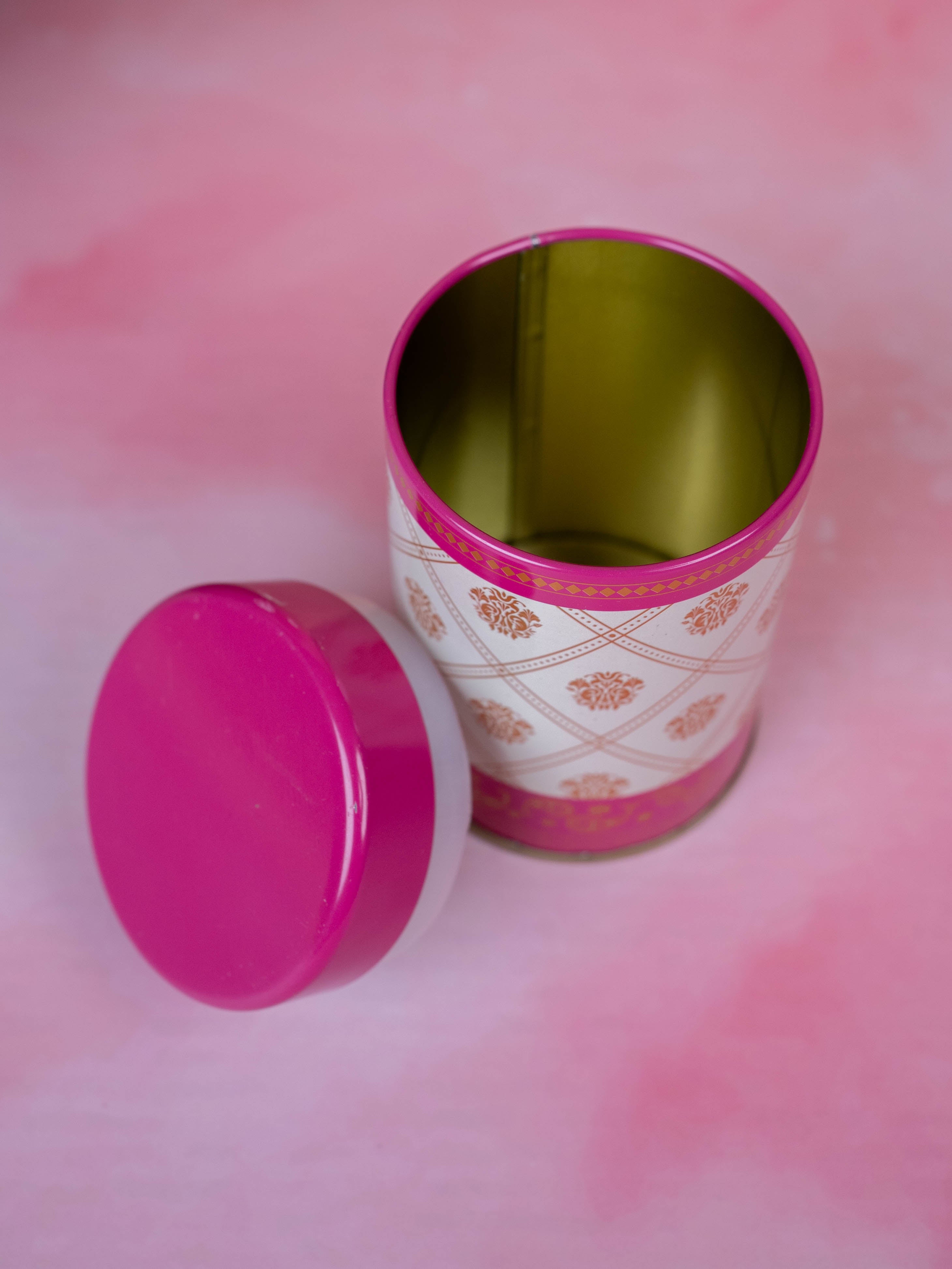 - This Tin Jar featuring a Luxurious White Base with Elegant Golden Floral Design Arranged in a Diamond Pattern.