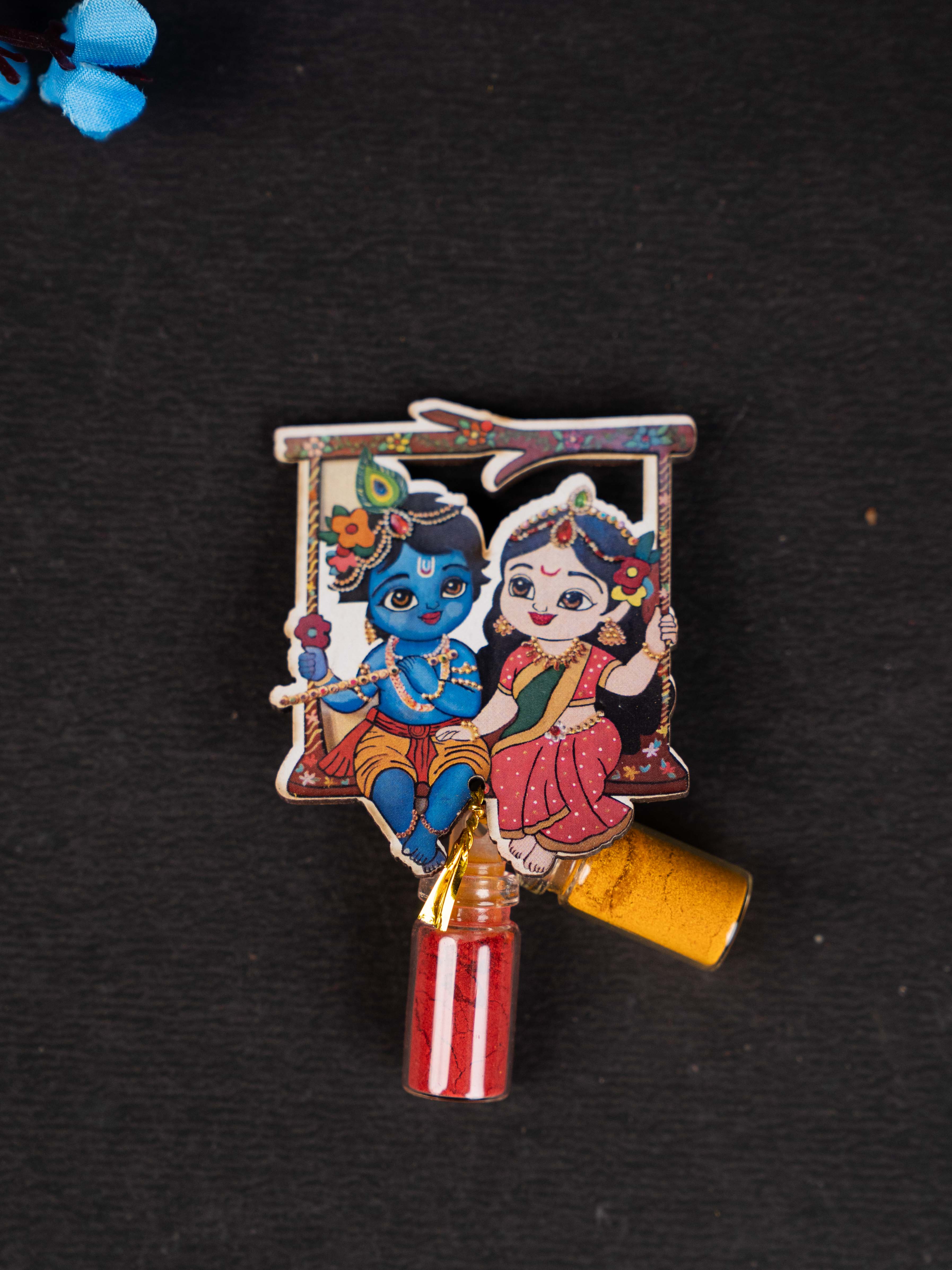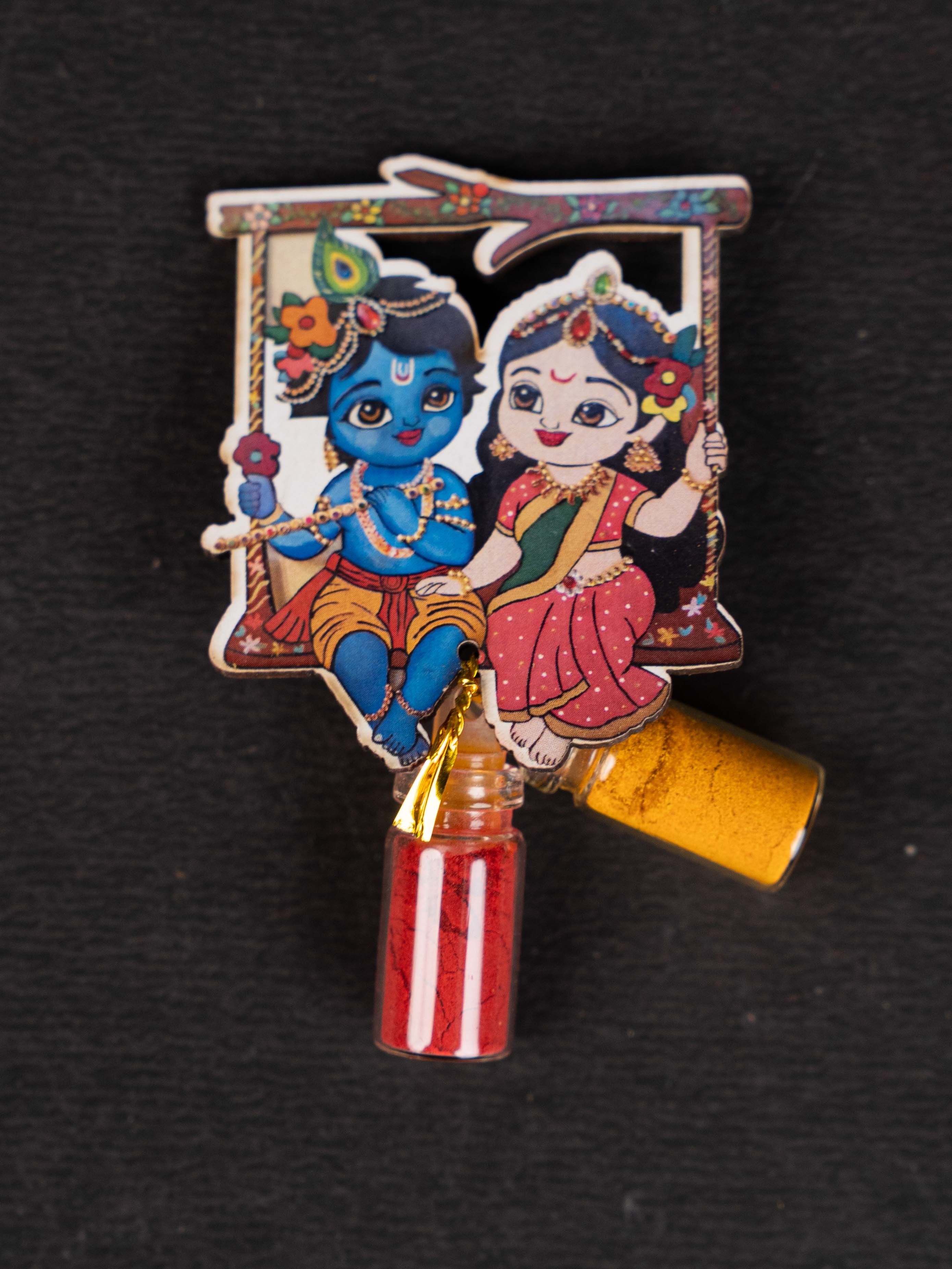 - Bring Divine Charm and Playful Romance into your Celebrations with this Adorable Krishna-Radha Fridge Magnet.