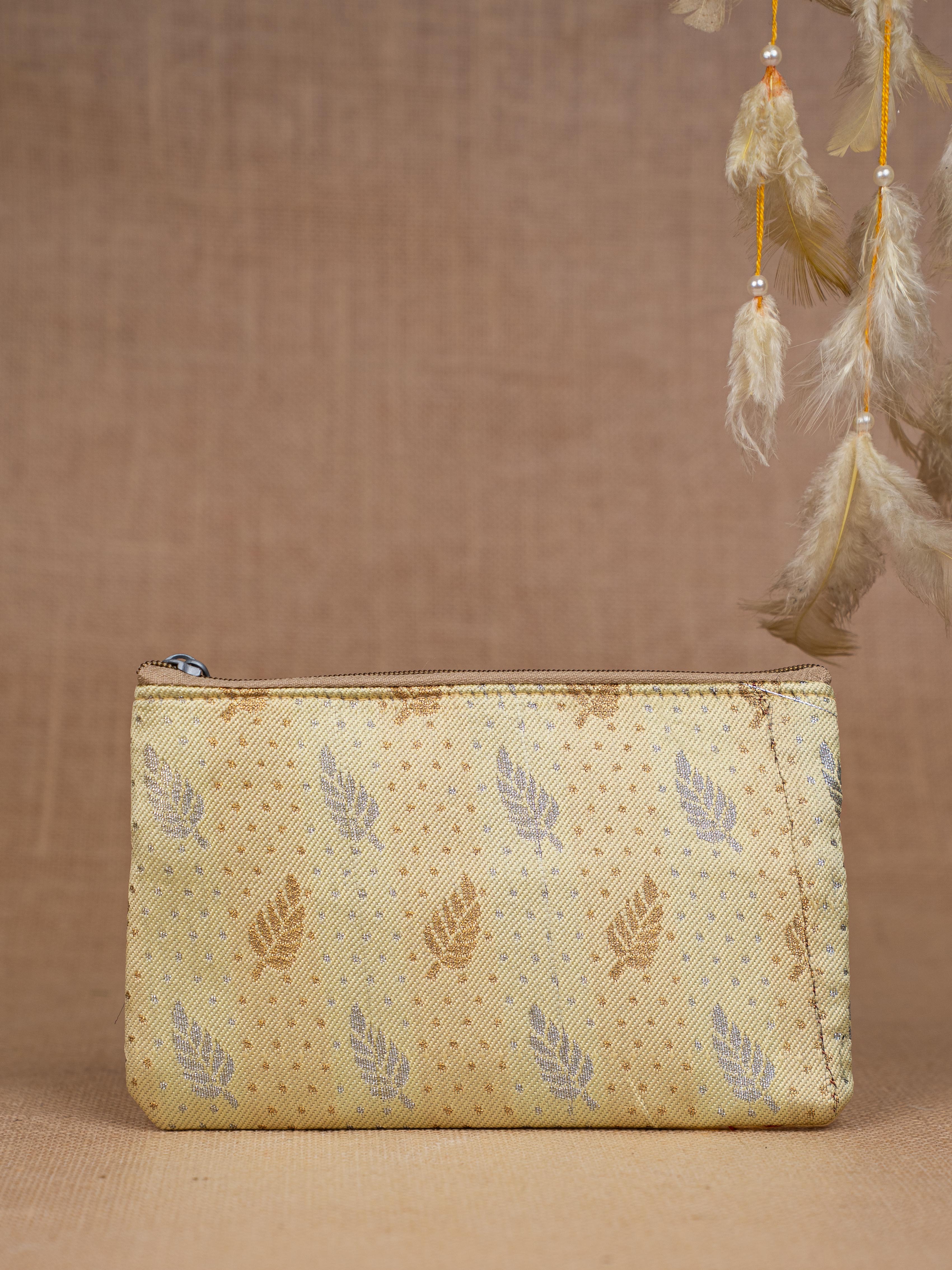 - This Elegant Zip Pouch is Crafted from Rich Raw Silk Fabric, Adorned with Metallic Gold and Silver Woven Leaf Motifs that Give it a Classic Ethnic Charm.