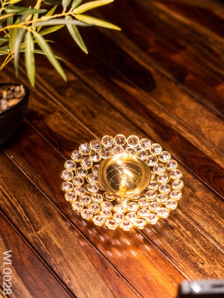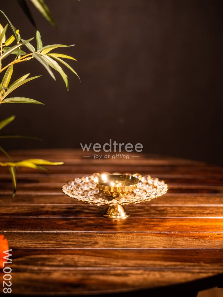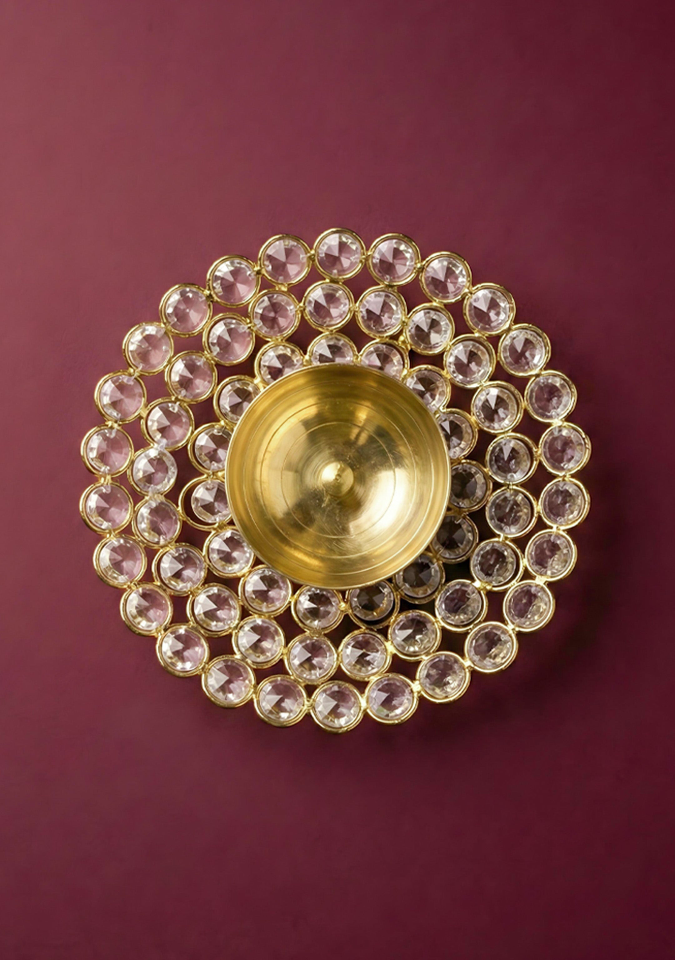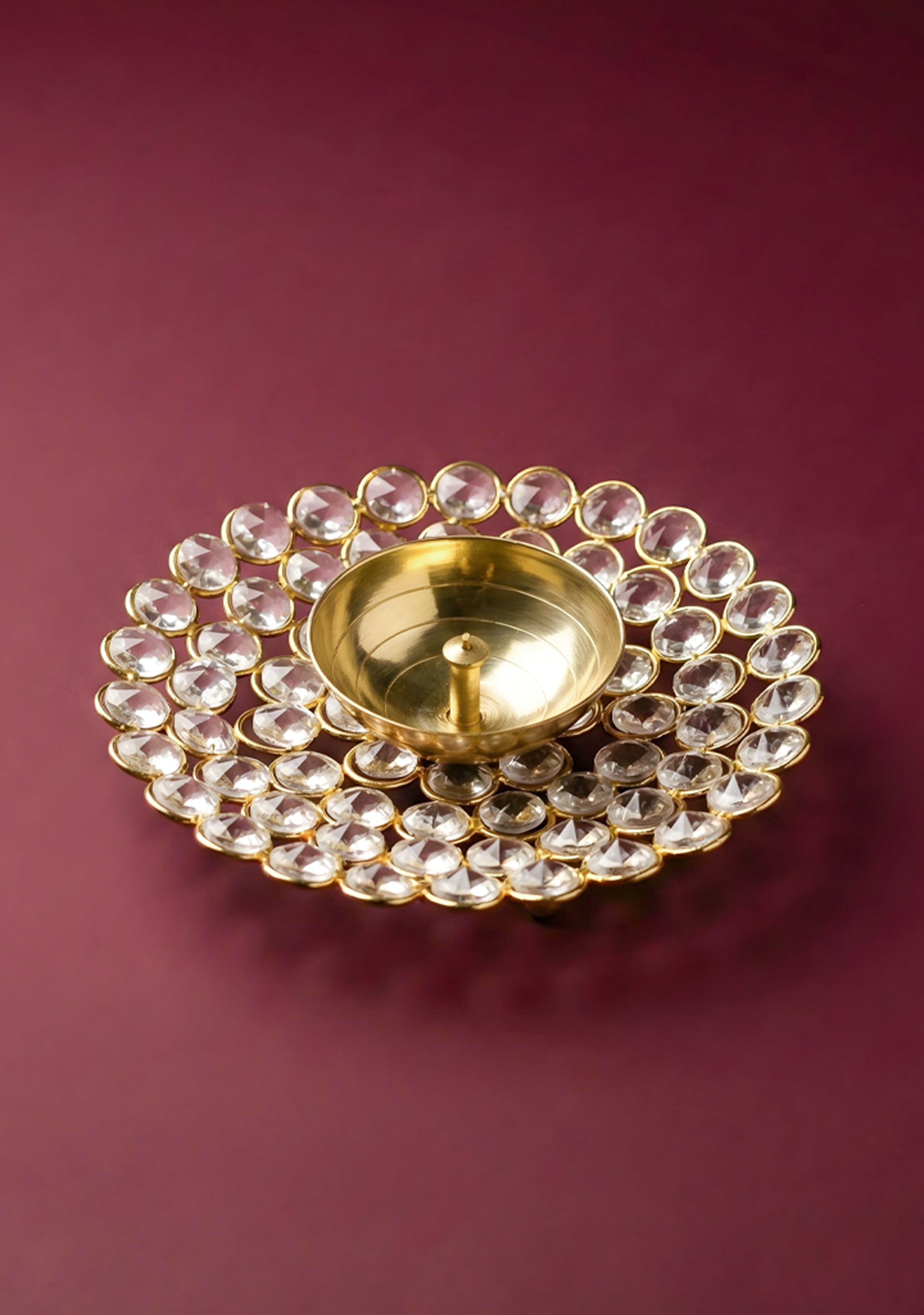 Check out this pretty flower shaped Diya completely made of brass. The Diya comes with a lovely stand. The flower shape is so pretty with sharp edges and a gleaming finish. It is surrounded by round crystal arrangements which will brighten the whole space with its reflection!