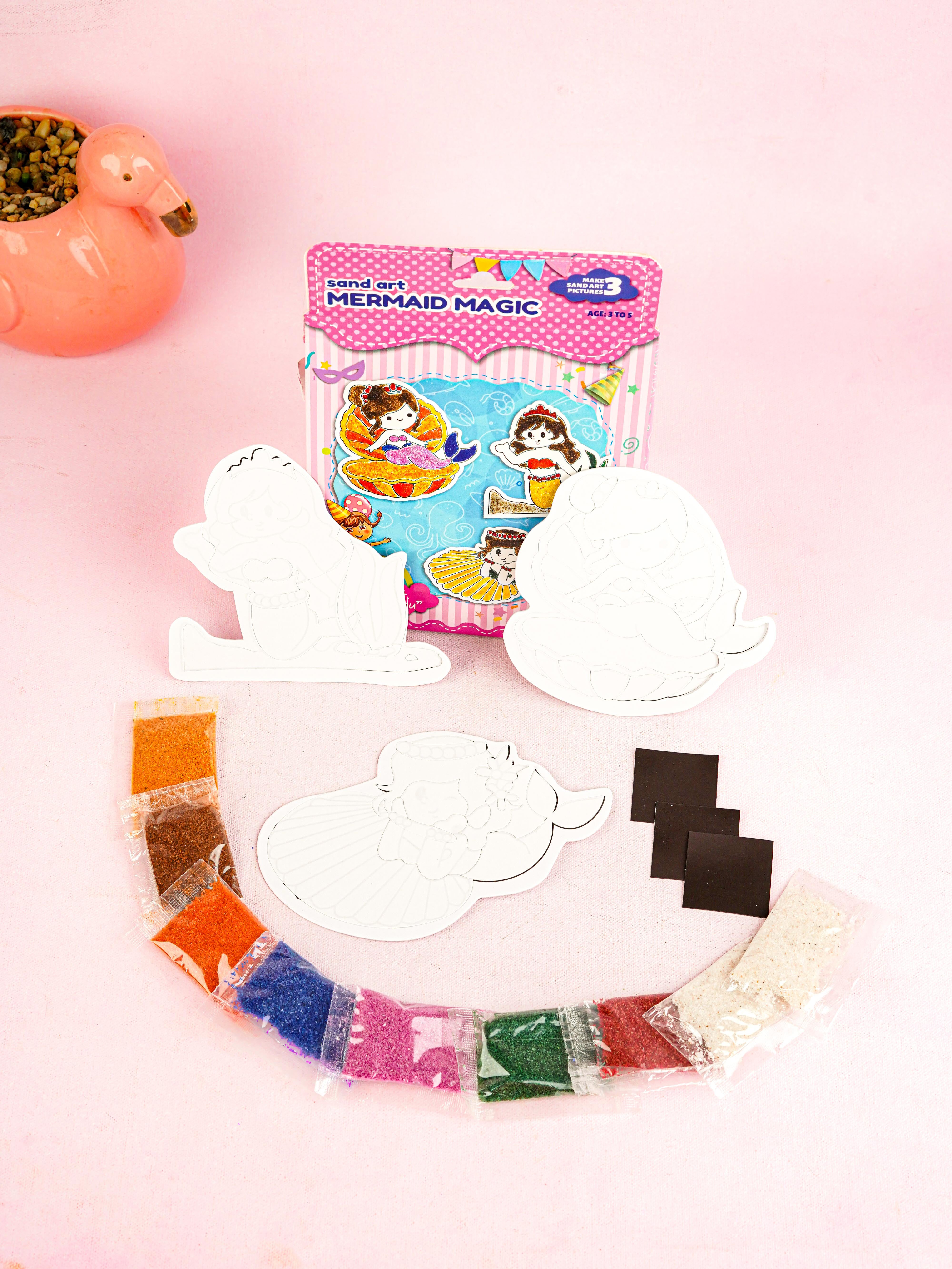 - Kids Bring Undersea Wonders to Life by Creating 3 Vibrant Sand Art Pictures - a Mermaid, a Seahorse, and a Shell.