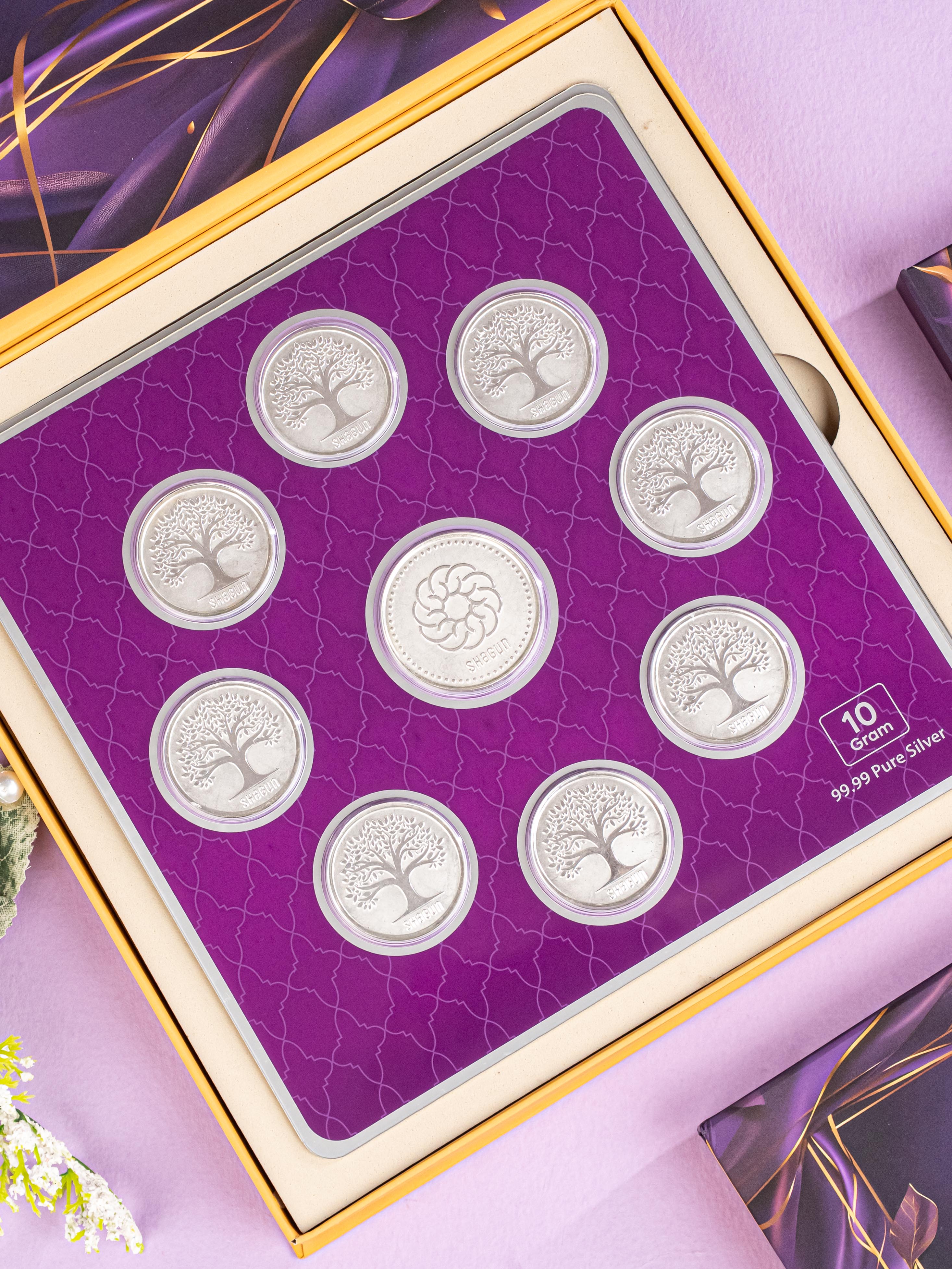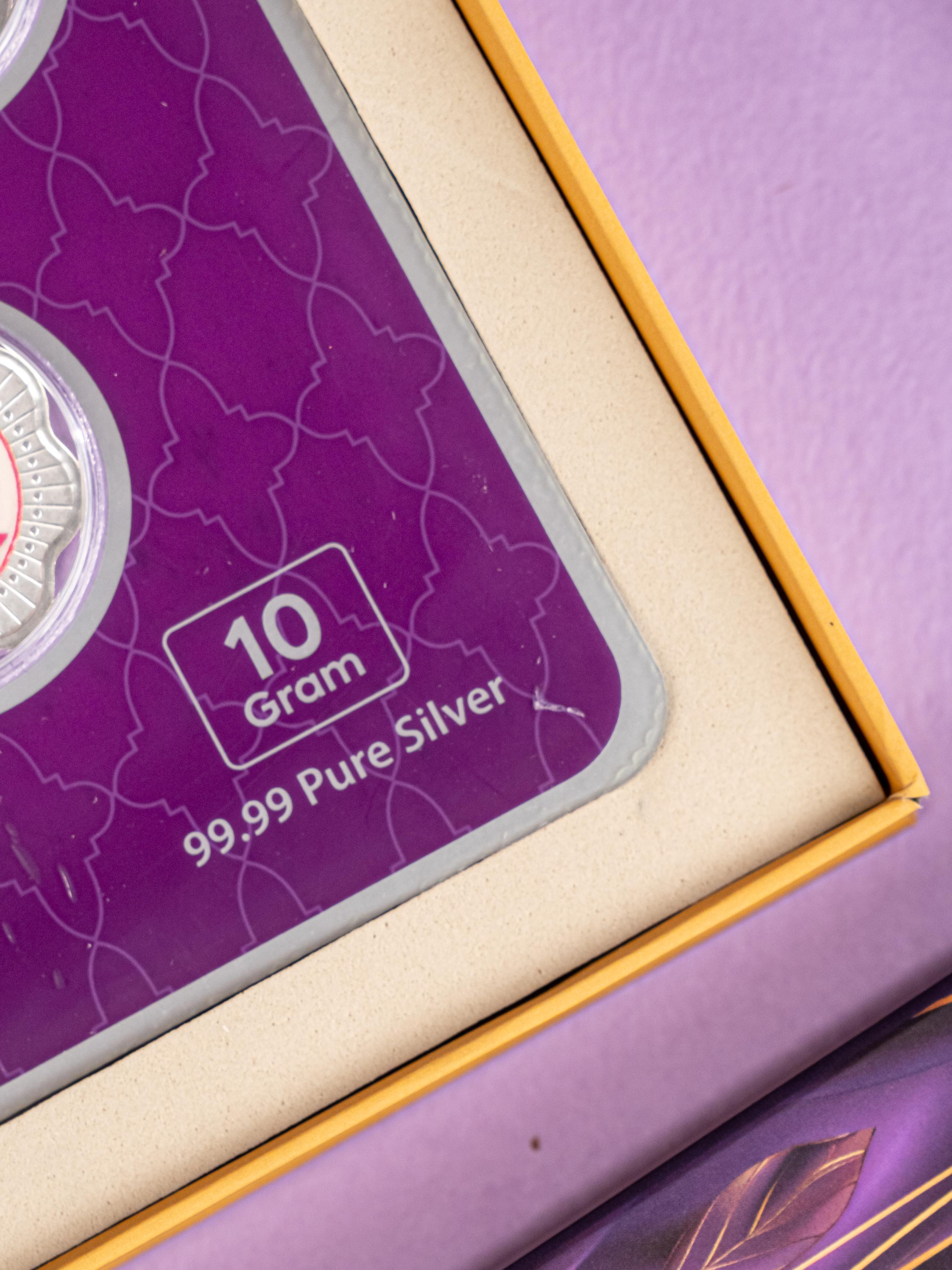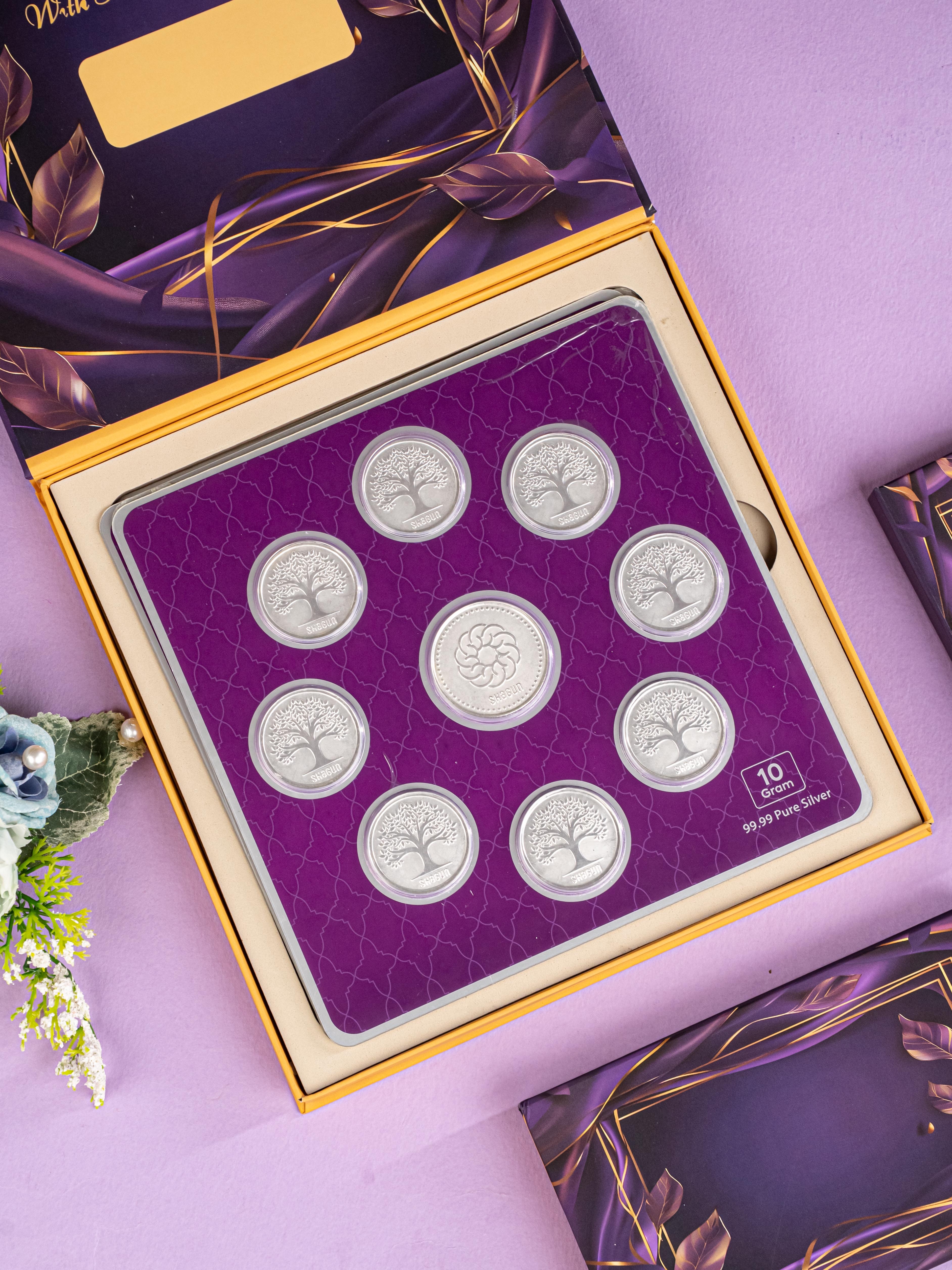 - An Exquisite Collection of Nine Silver Coins Neatly Arranged in a Premium Purple and Gold Gift Box.