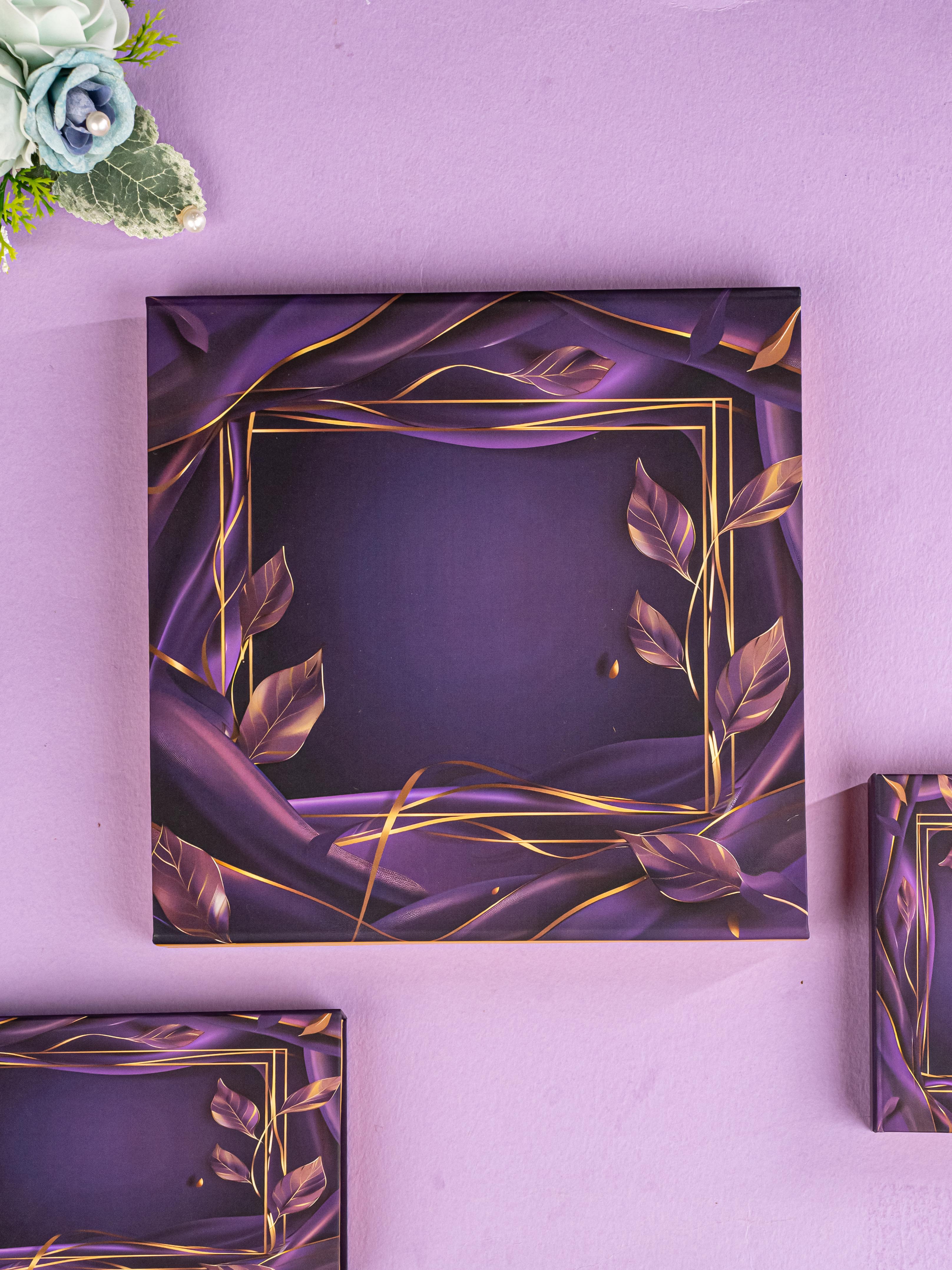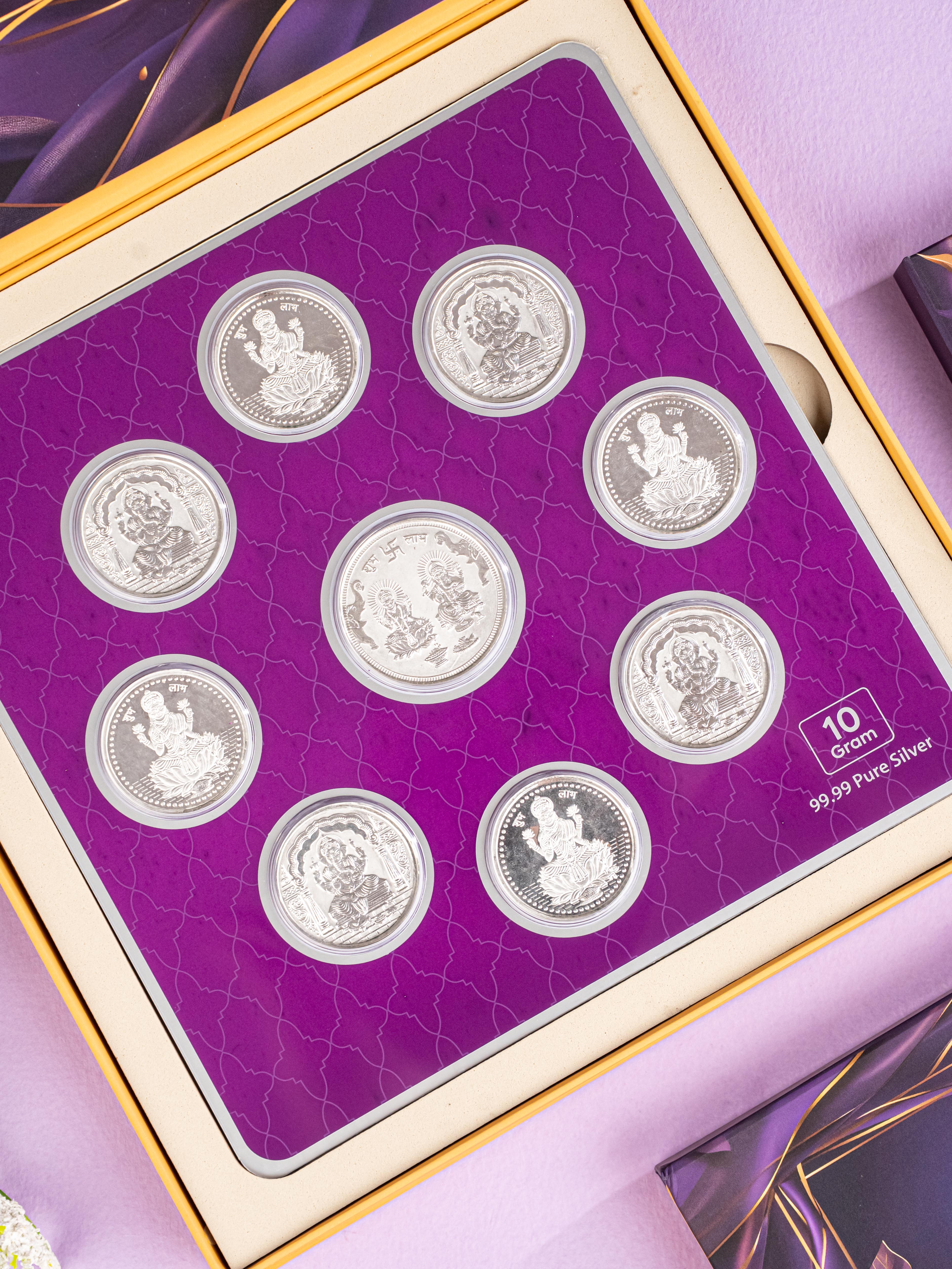 - The Coins are Set Against a Vibrant Purple Patterned Background within a Luxury Gift Box.