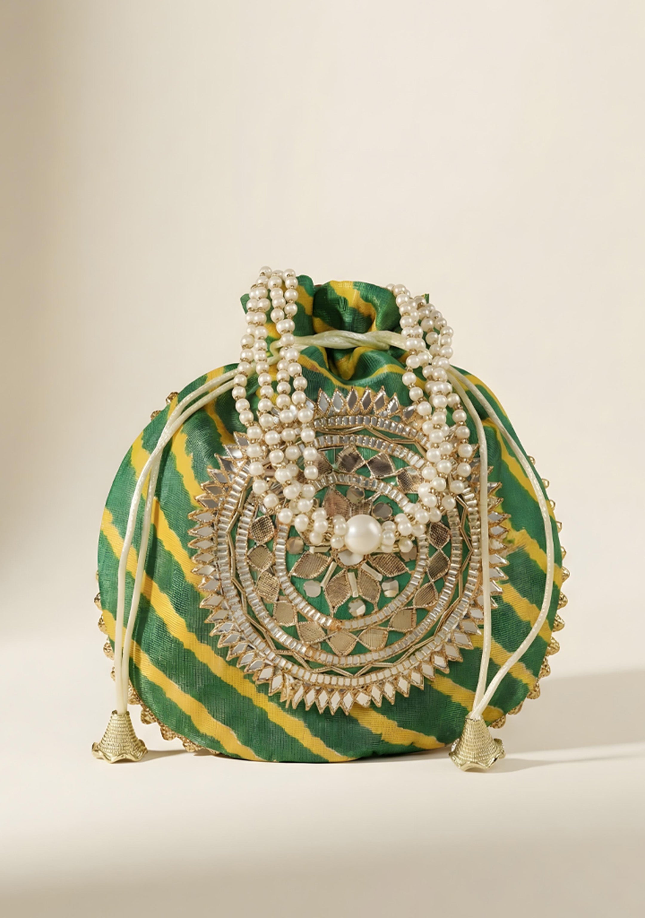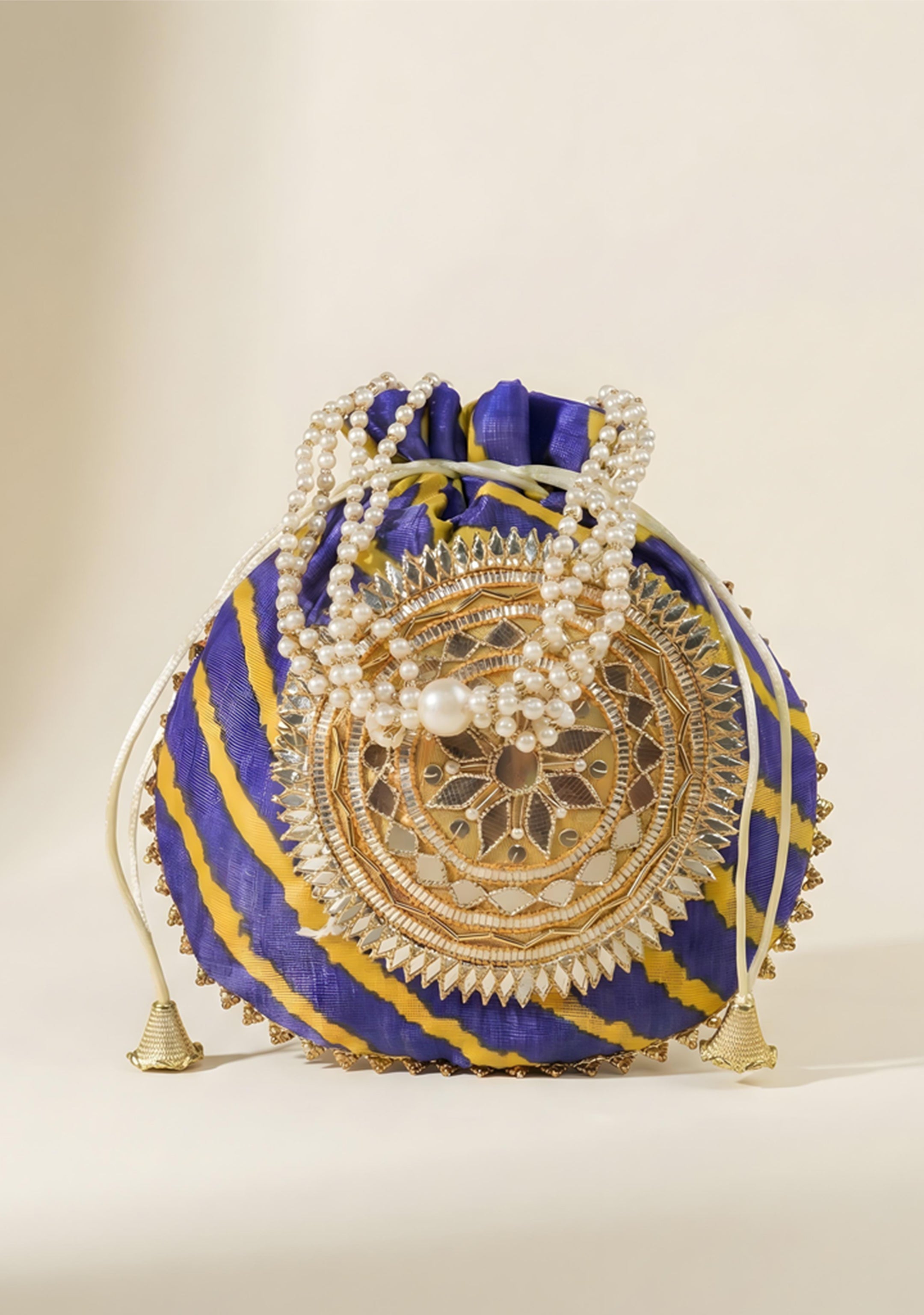- This potli bag comes with all over Bandhani prints and a beautiful embroidery patch work in the center.
